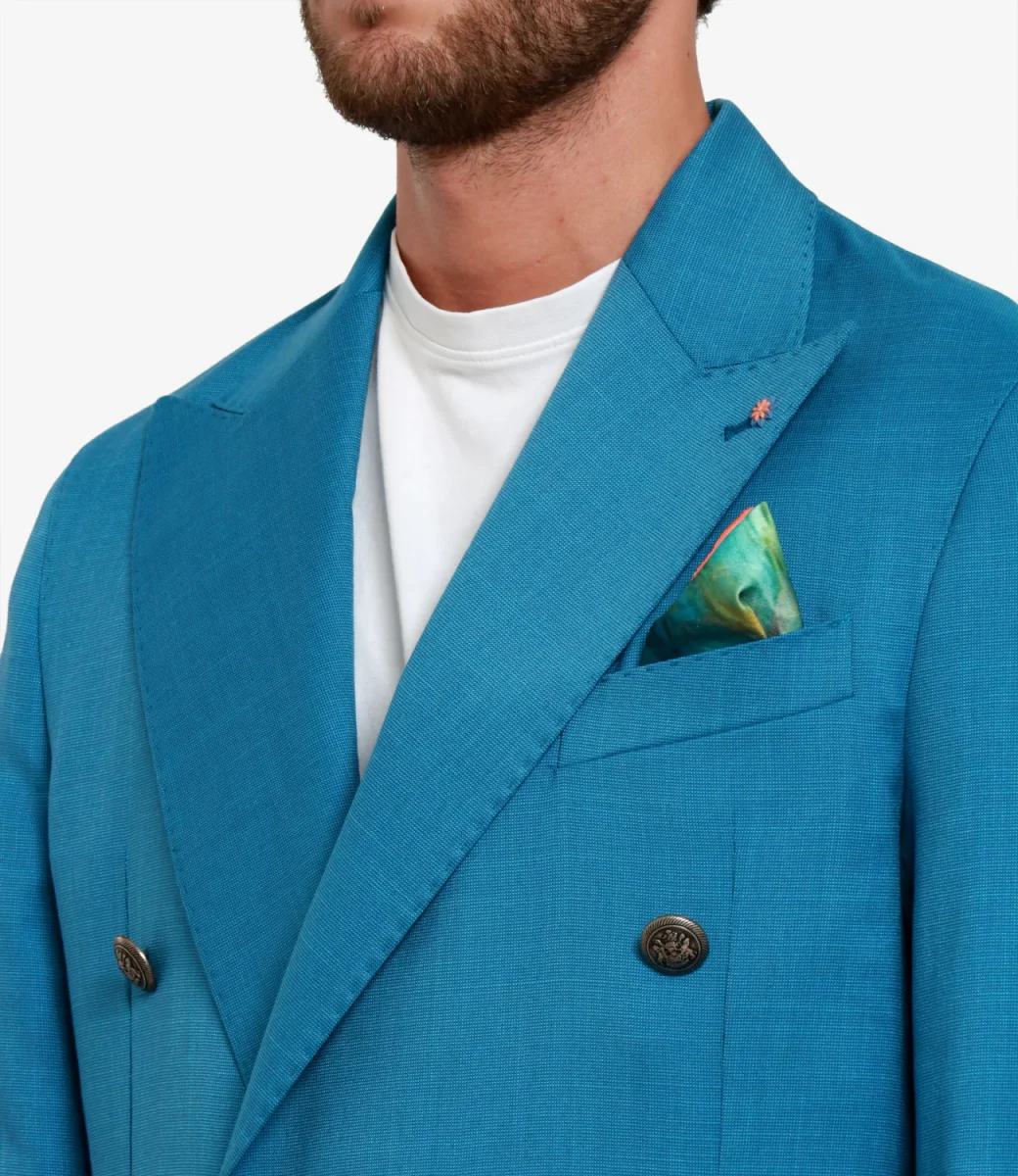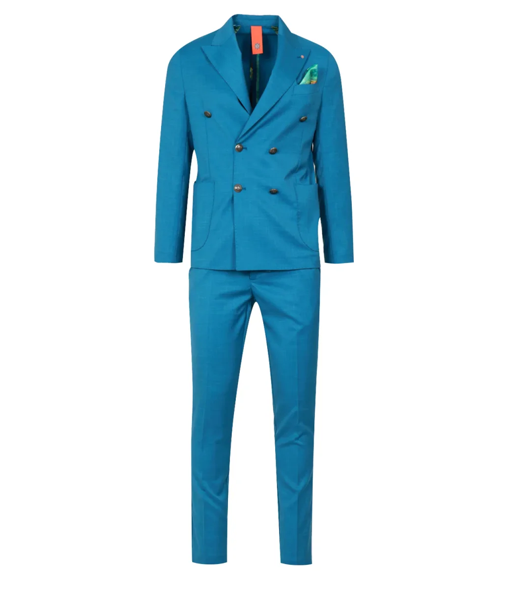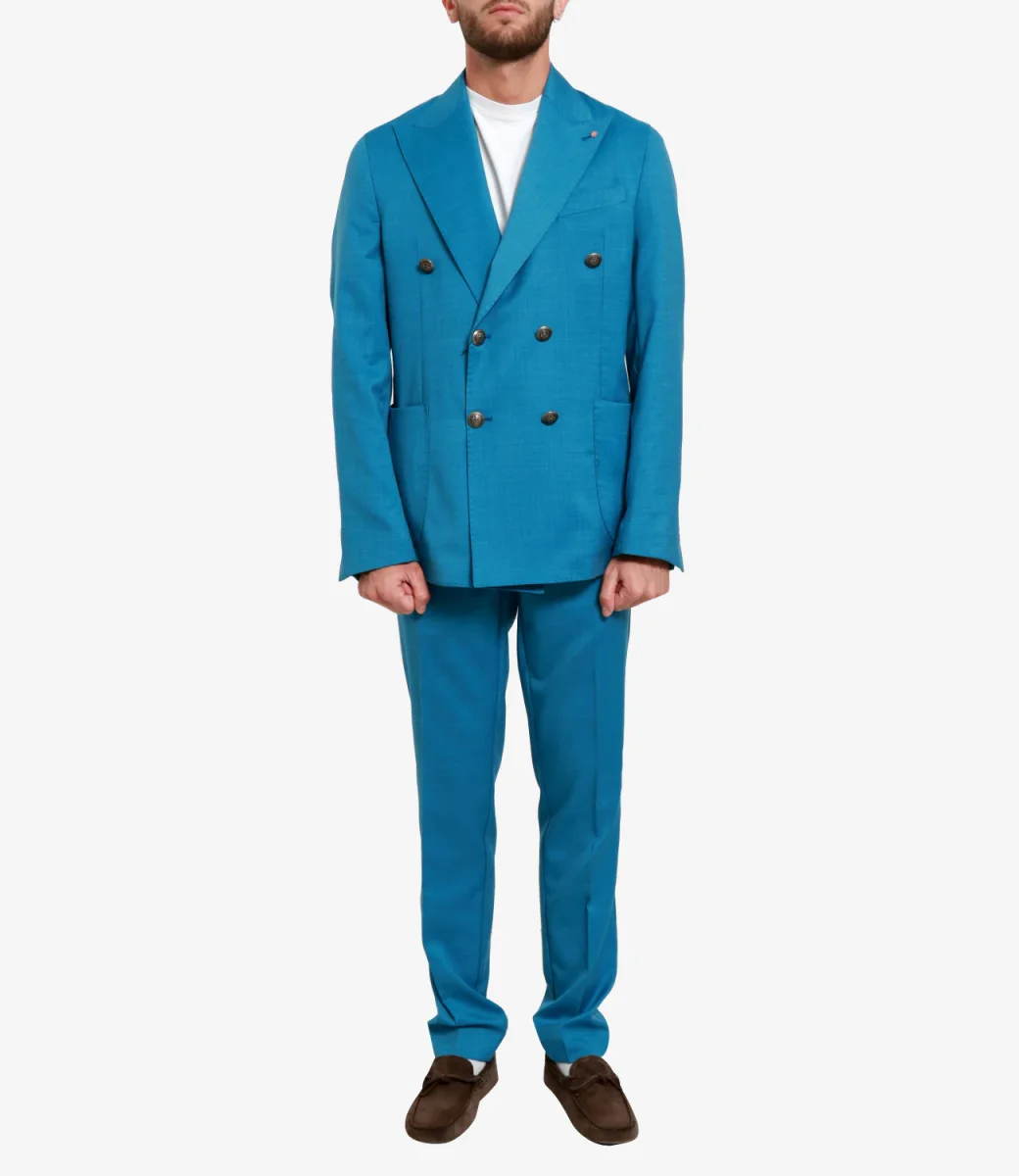 Abito Bharnaba Philosophy Gelsomino. Design super classico con giacca doppiopetto con bottoni bombati in metallo, realizzato con tessuto tramato all over dalla texture light.