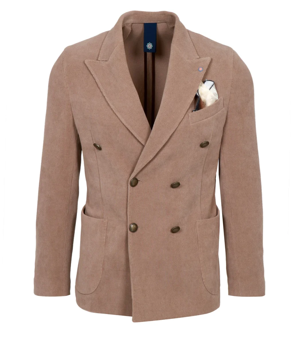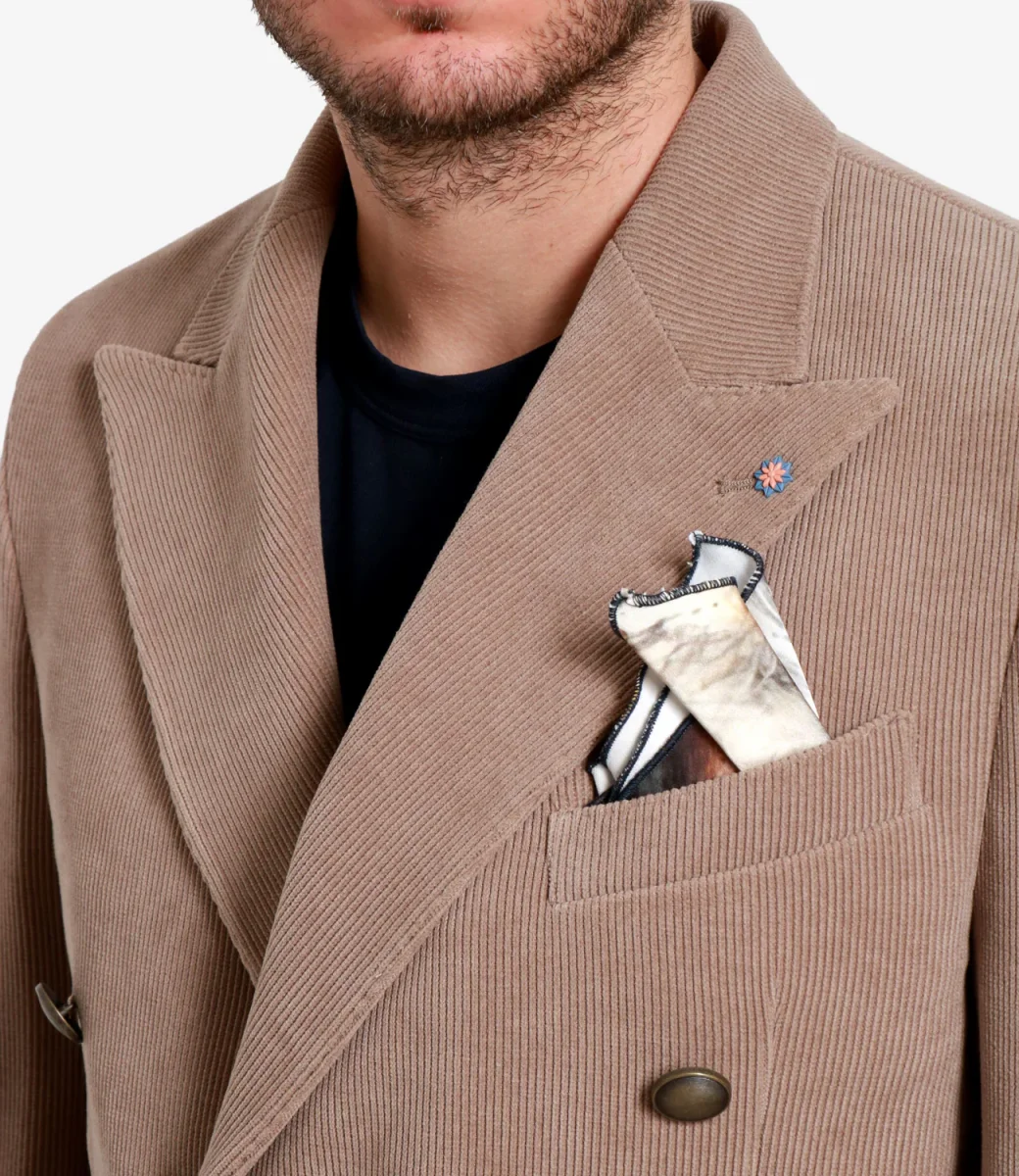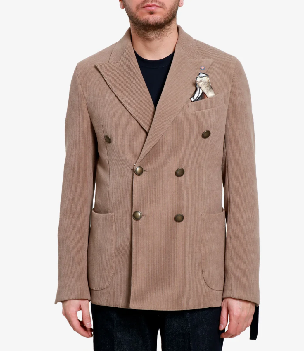 Giacca Bharnaba Philosophy Lipa in velluto a costine con revers a lancia e bottoni in metallo bombato. Taschino con pochette, tasche con patta, maniche con bottoni, davanti stondato e spacchi sul retro. Vestibilità regolare.
