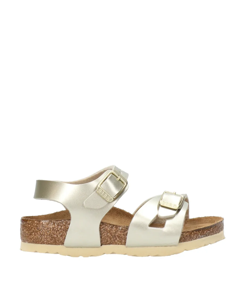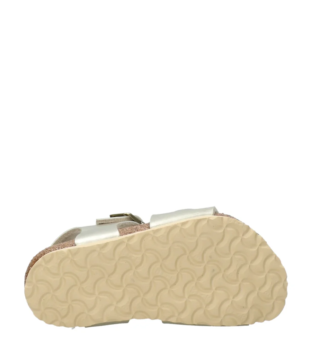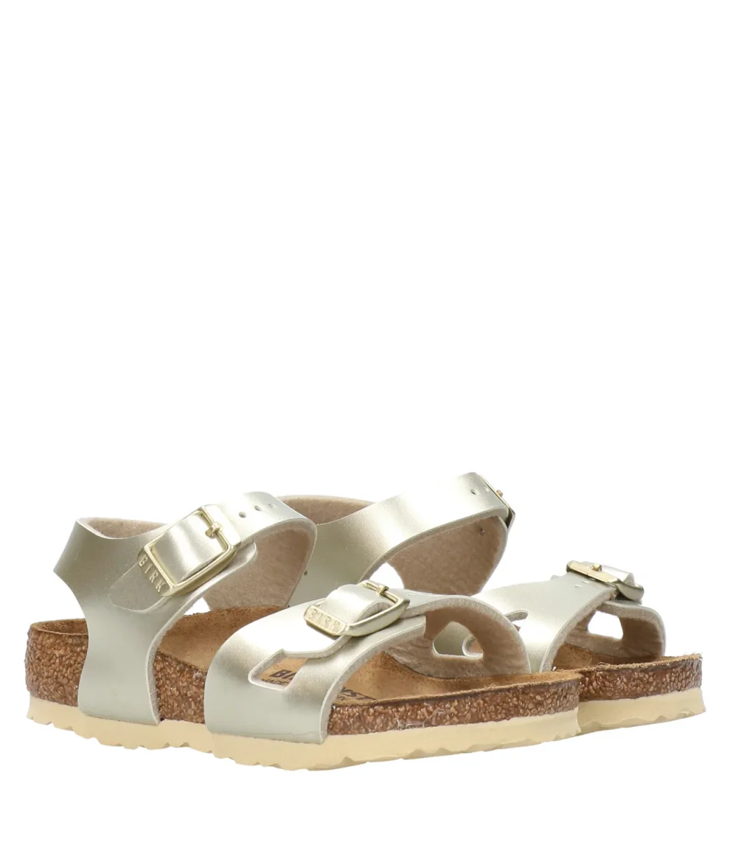 Sandalo Birkenstock Rio in materiale sintetico Birko-Flor® oro con due cinturini ciascuno con una fibbia di metallo regolabile individualmente, cinturino per il tallone, plantare anatomico in sughero e lattice, sottopiede in pelle scamosciata e suola carrarmato in EVA.