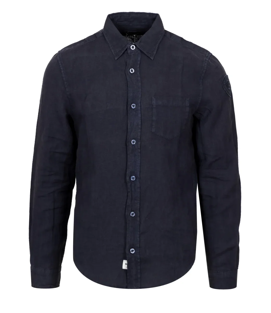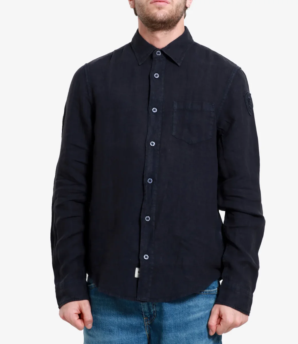 Camicia Blauer in lino blu con collo classico a punta, maniche lunghe, fondo manica con polsino e due bottoni di chiusura, chiusura centrale con bottoni a quattro fori sul davanti, taschino aperto applicato sul lato sinistro del torace, orlo stondato più corto sui fianchi e spacchetto cucito, caratteristico passante Blauer dietro nel collo, etichetta Blauer Shirt nascosta applicata sul fondo al centro e bandierina americana Blauer sul fianco destro.