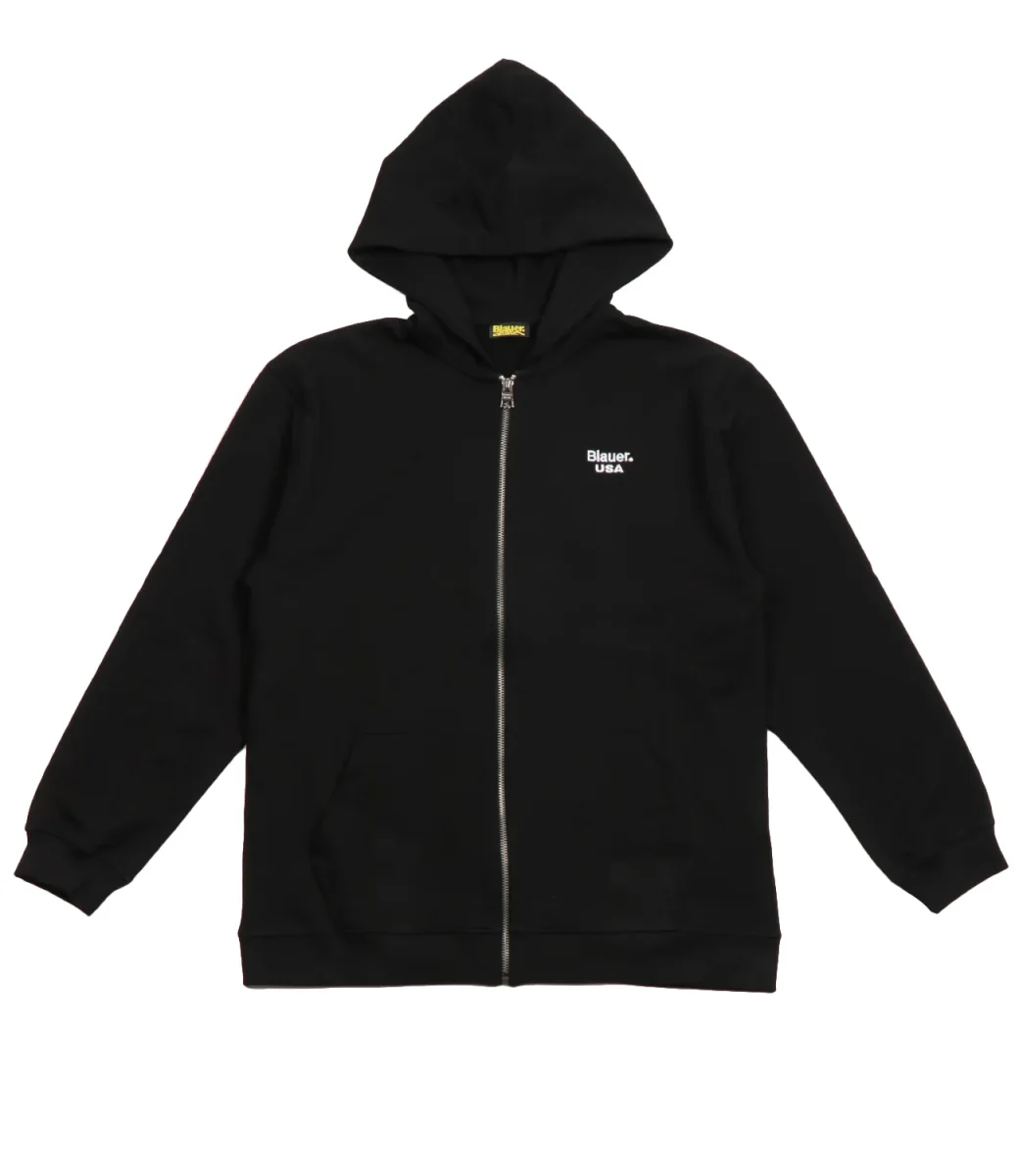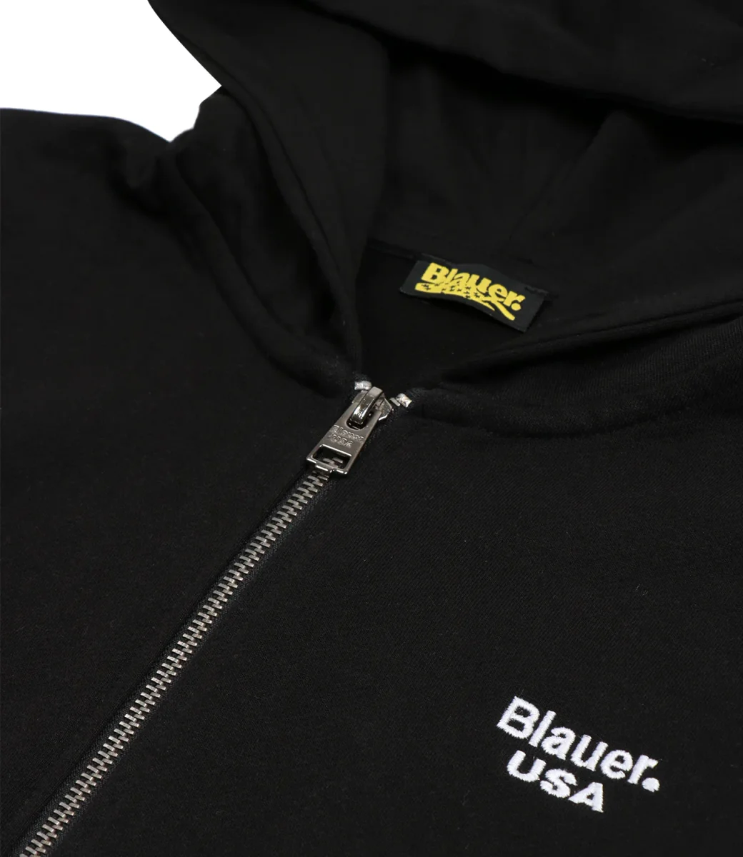 Felpa Blauer Junior Blackstone in morbido tessuto in misto cotone, modello con cappuccio, zip intera bordi a costine e maxi stampa scudo Blauer sulla schiena.