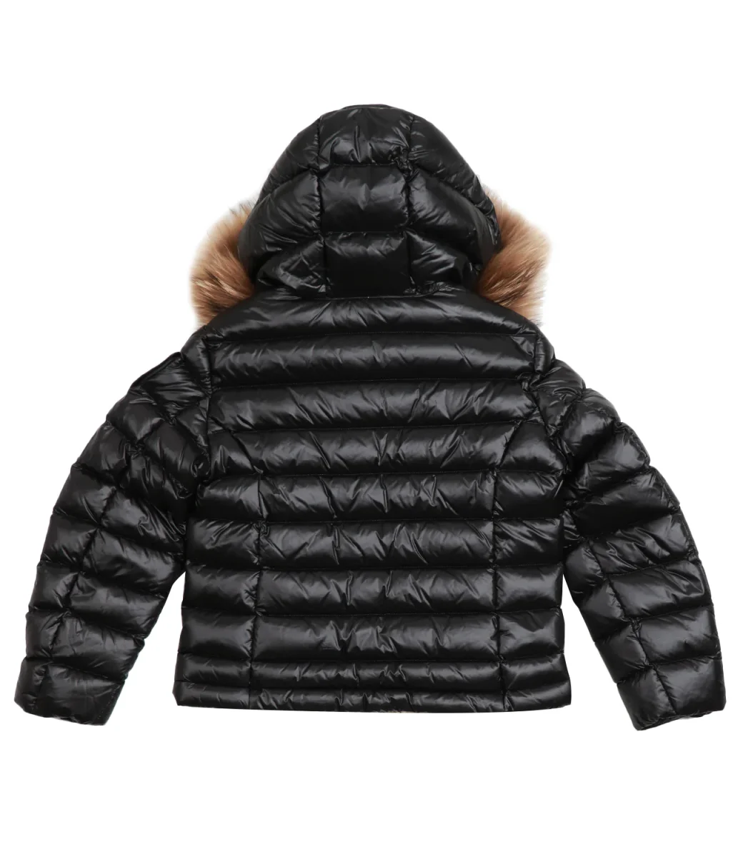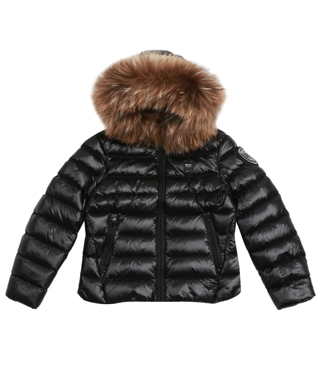 Giubbotto Blauer Junior Arcadia in tessuto tecnico lucido, con cappuccio fisso con bordo in vera pelliccia removibile, chiusura con zip nascosta, tasche con zip e interne a velcro. Silhouette che valorizza la vita. Imbottitura 90/10 leggera e calda,