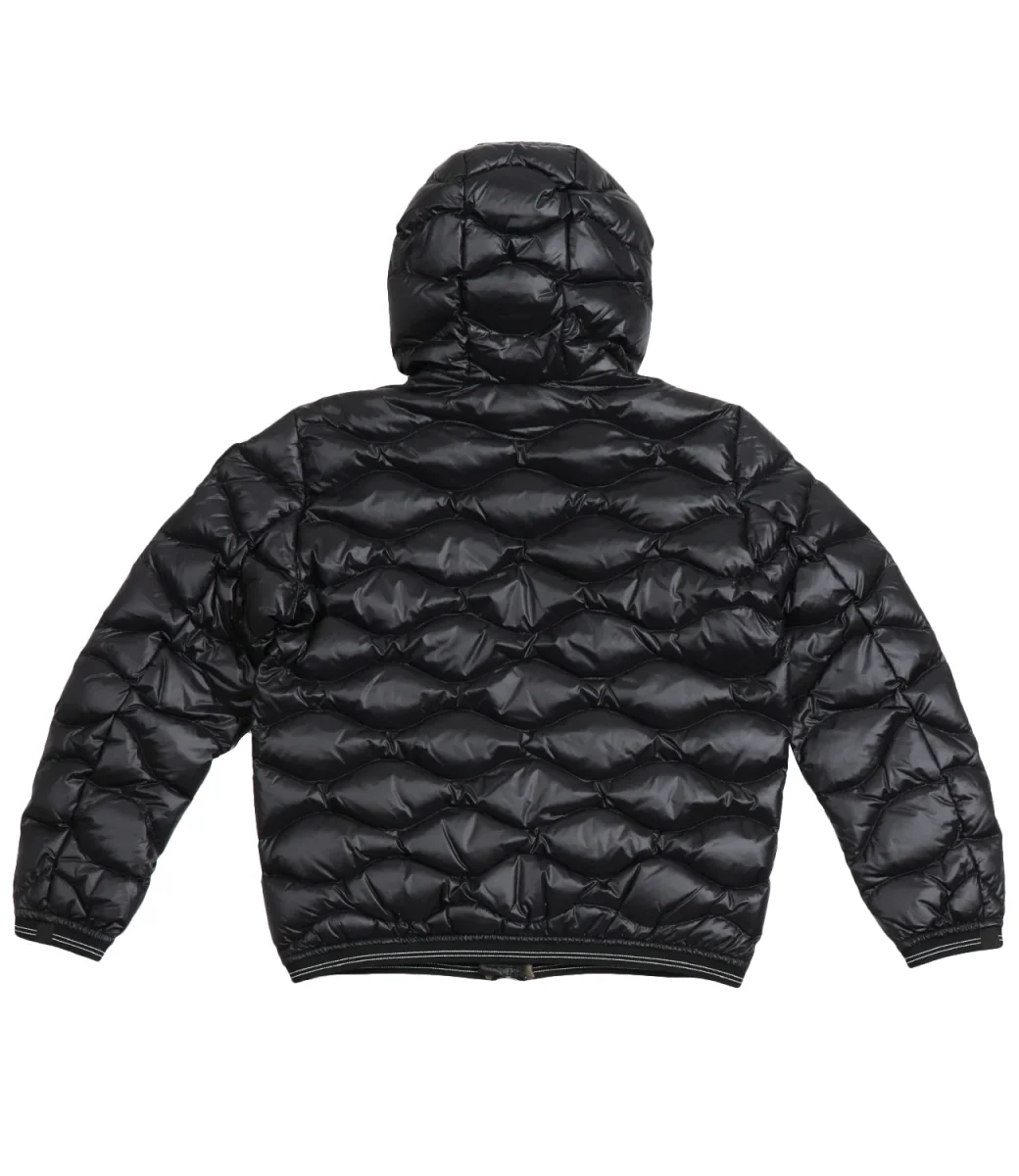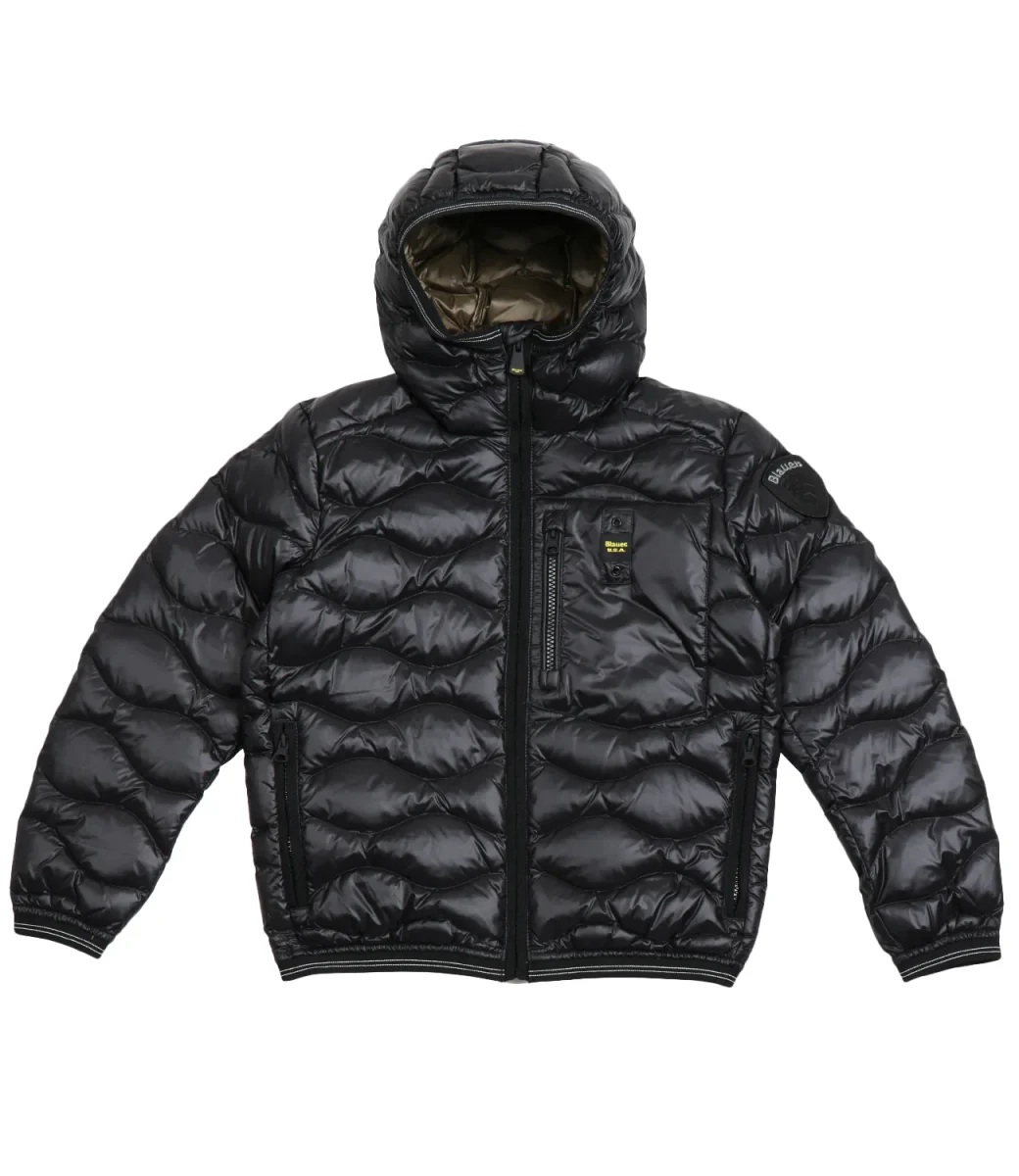 Giubbotto Blauer Junior Brinton in tessuto tecnico trapuntato a onde orizzontali motivo distintivo del brand. Cappuccio fisso, chiusura con zip e copri cursore sul collo, Imbottitura naturale 90/10.