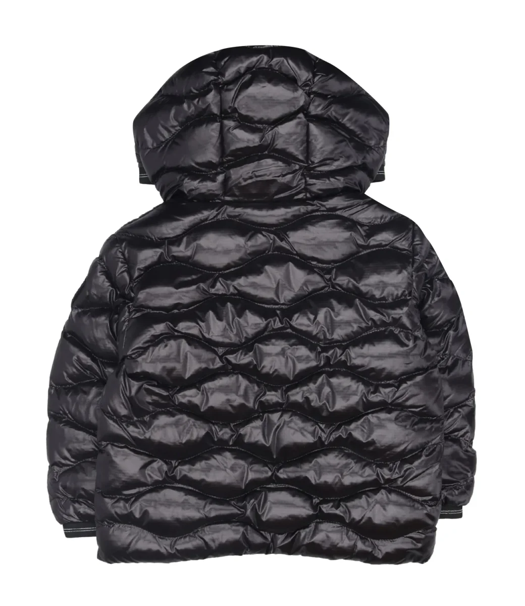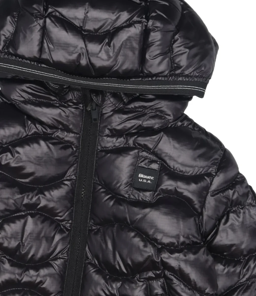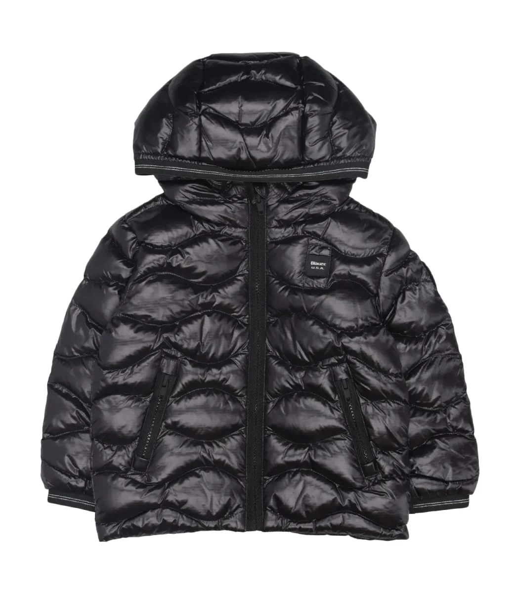 Giubbotto Blauer Junior Bryant Baby in tessuto tecnico lucido trapuntato a onde orizzontali motivo distintivo del brand. Cappuccio fisso, chiusura nascosta con copri cursore sul collo, Imbottitura Sorona® Aura.