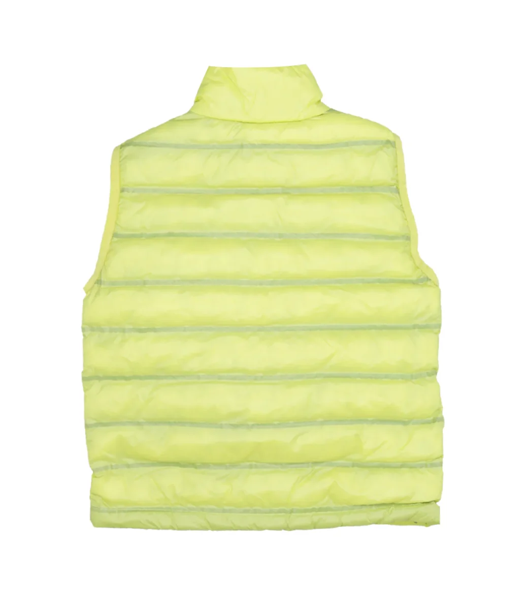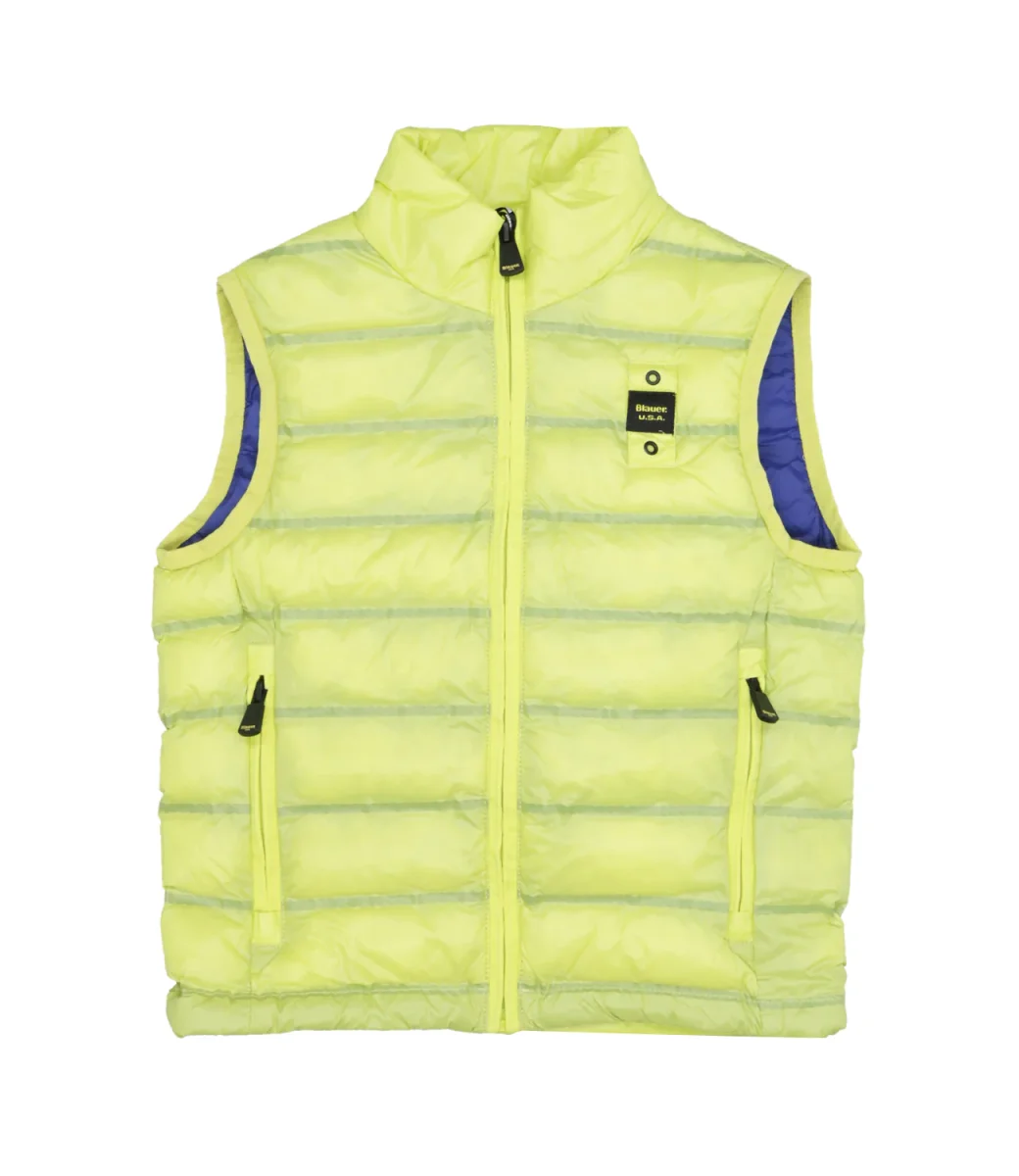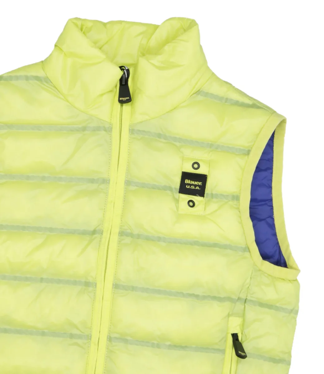 Smanicato Blauer Junior in nylon micro rip verde con leggero motivo check e impunturato a righe orizzontali, chiusura centrale con cerniera nascosta e para zip interna, due tasche con zip verticale nascosta, fettuccia in tono lungo il profilo delle cerniere, profilo in lycra elastica in contrasto colore sul giro manica e sul fondo, due tasche interne con velcro, caratteristico passante Blauer cucito sul petto a sinistra con logo in contrasto colore.