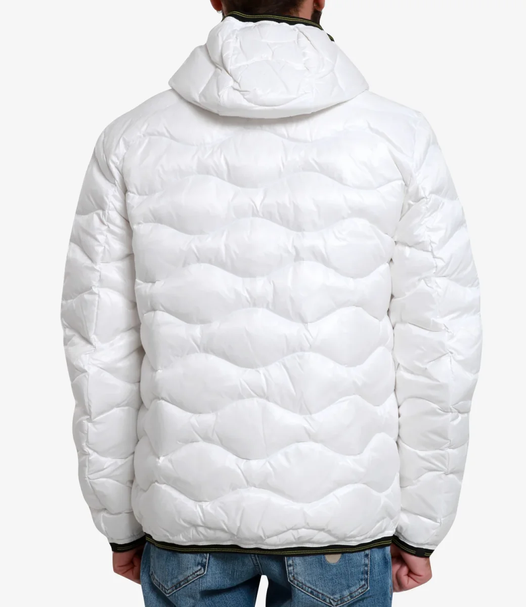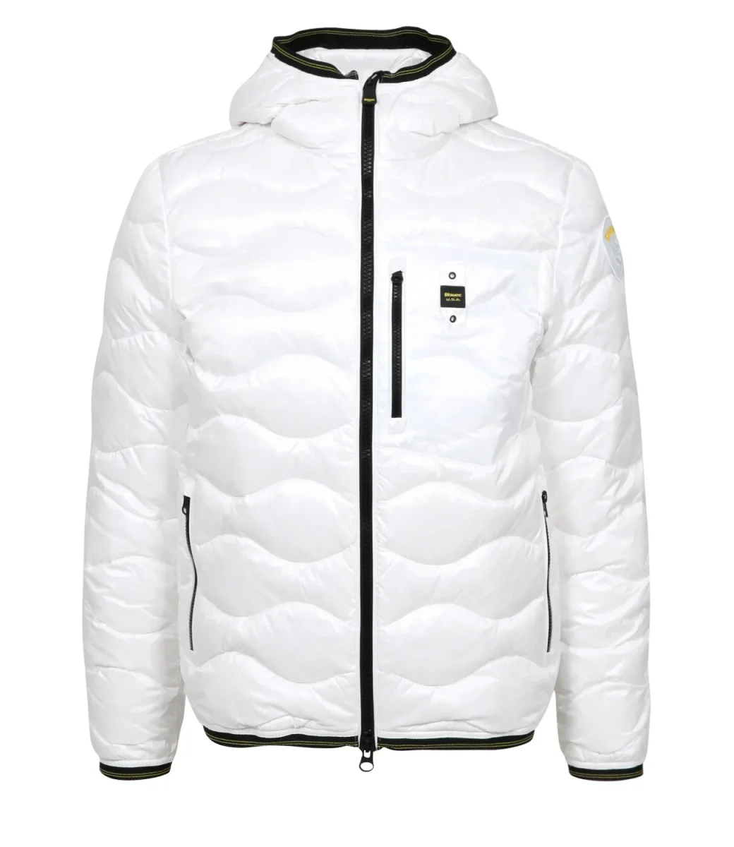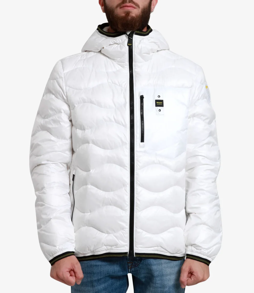 Piumino Blauer Wave modello in tessuto tecnico idrorepellente, trapuntato ad onde. con imbottitura leggera, calda e non ingombrante, con cappuccio, chiusura frontale con zip, tasche con zip, Iconico scudo logato sulla spalla sinistra, logo sul petto lato sinistro