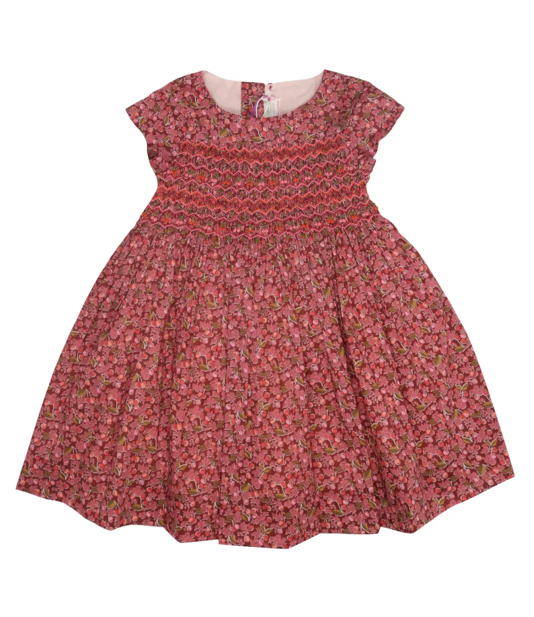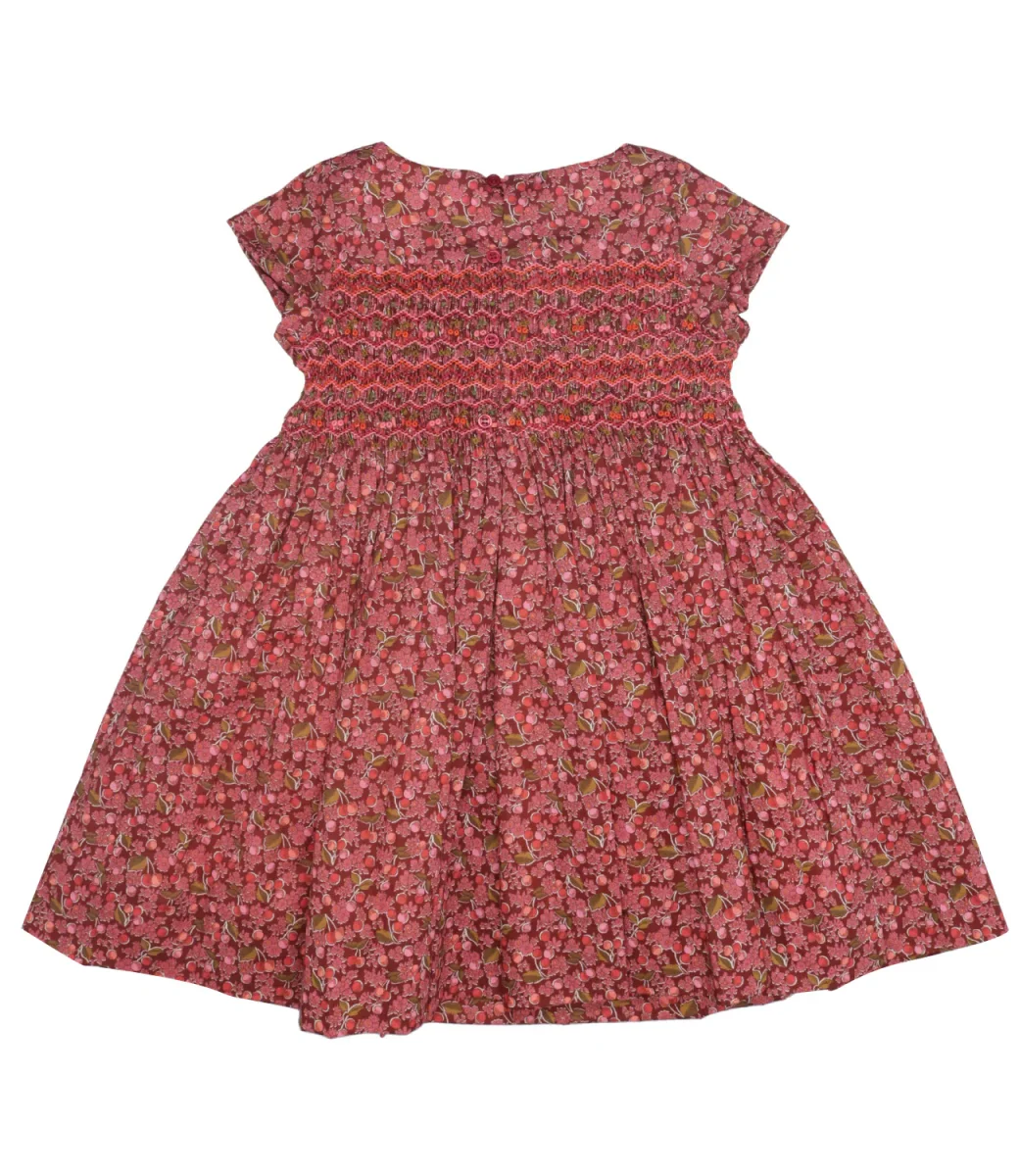 Abito Bonpoint Duchesse in cotone biologico, tessuto Liberty. Modello romantico con stampa floreale, girocollo, ricamo in punto smock sul torace. Maniche ad aletta. Silhouette svasata al fondo.