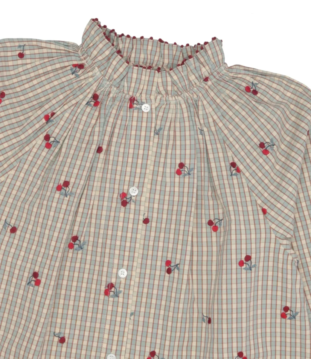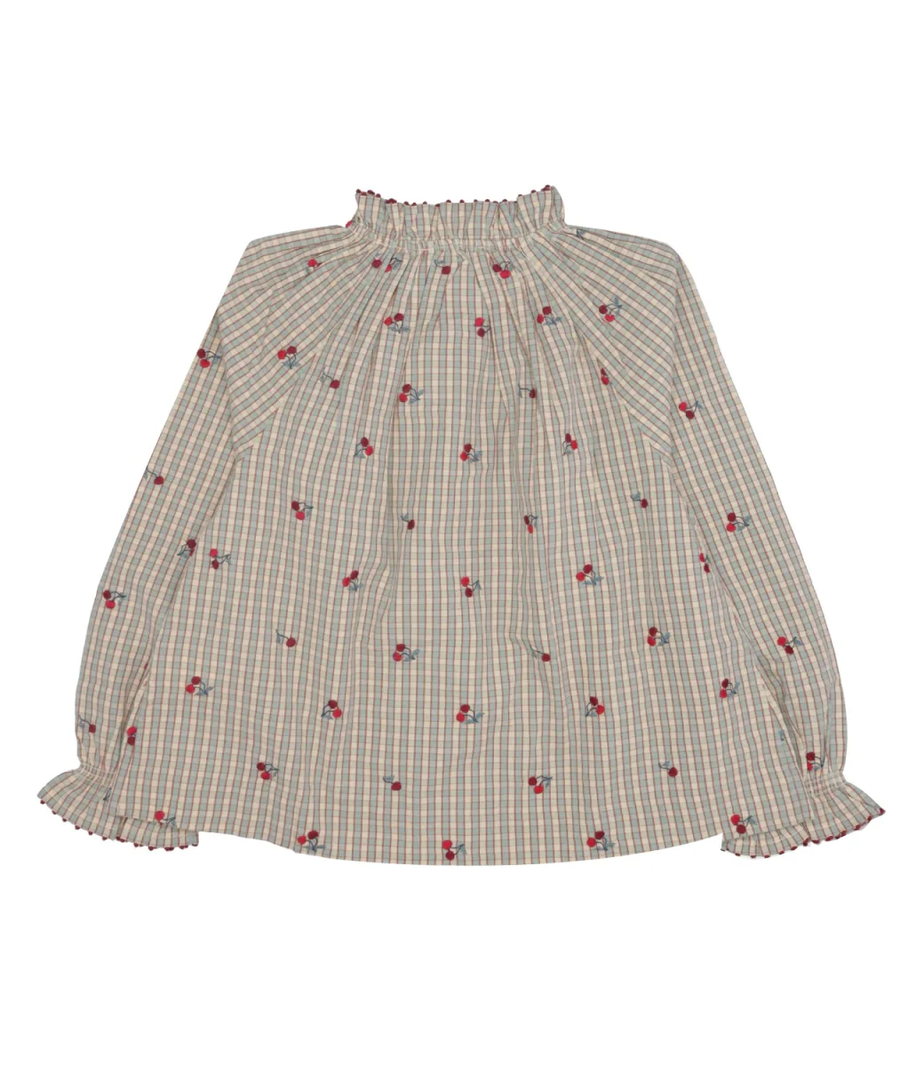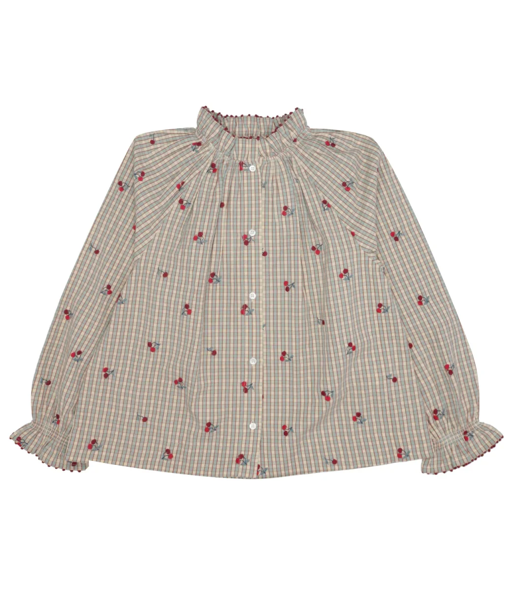 Blusa Bonpoint Jordana realizzata in cotone biologico con motivo a quadretti vintage e ciliegie ricamate all over. Design con colletto arricciato, spalle scese, maniche con polsini elastici.