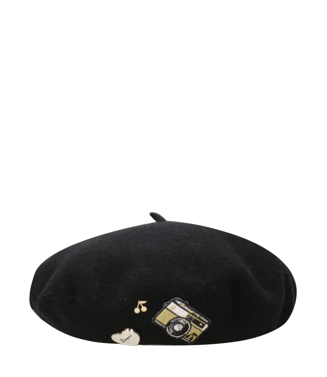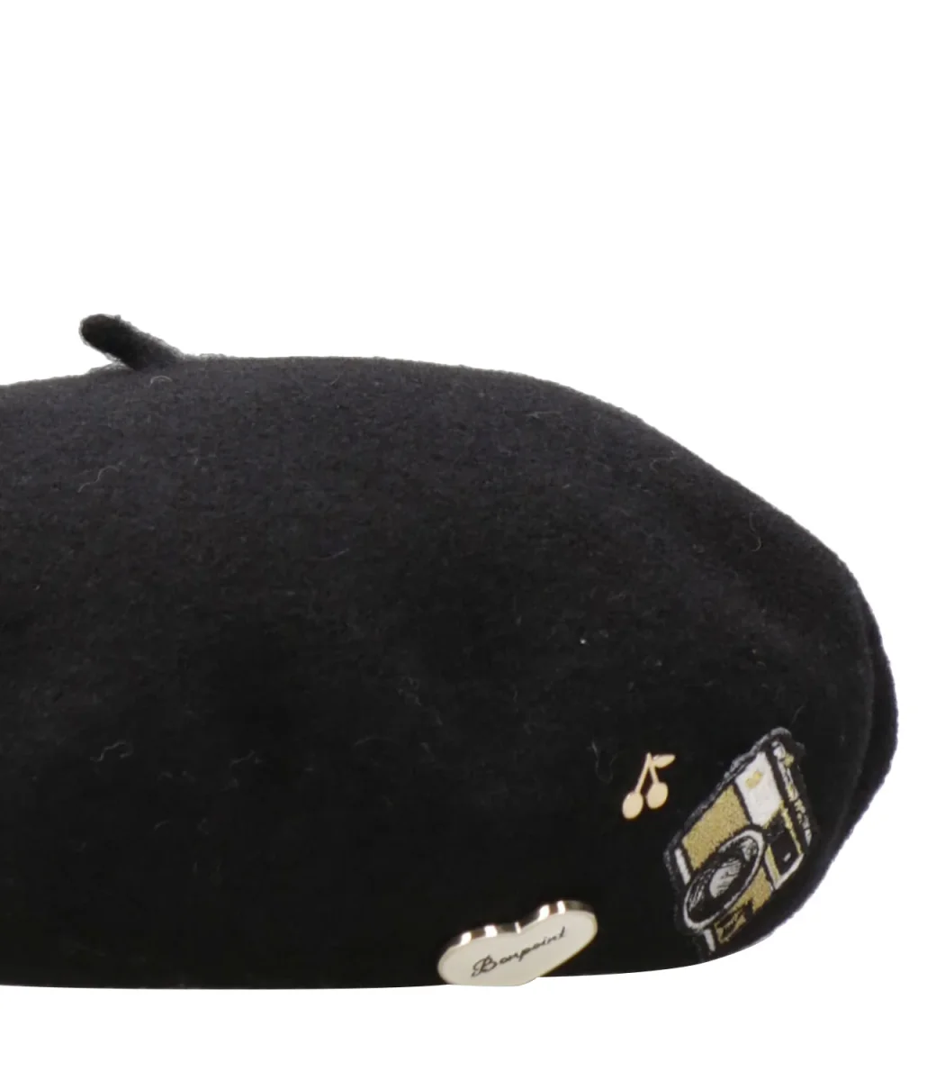 Cappello Bonpoint Tekla realizzato in lana, modello iconico di eleganza nella stagione fredda. Fodera interna con stampa ciliegie decorata con dettagli in metallo e patch.