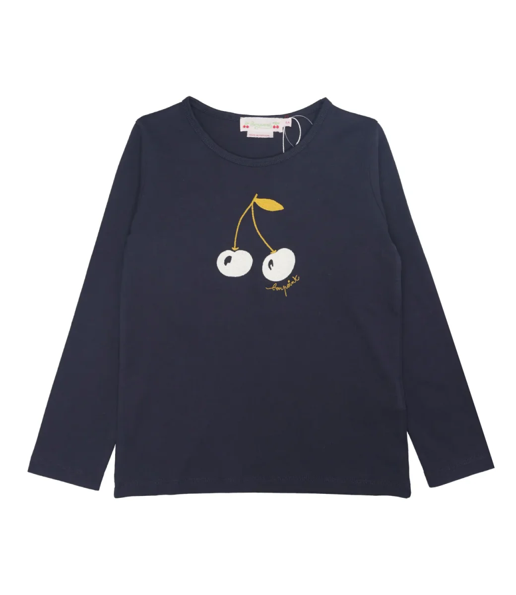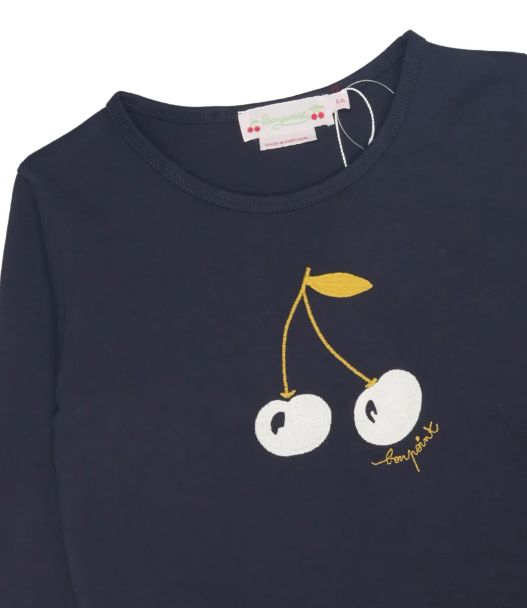 T-Shirt Bonpoint Tidjiane realizzata in cotone biologico, design classico girocollo, maniche lunghe, fondo dritto, Decorata con un ricamo colorato a forma di ciliegia iconiche del brand sul petto.
