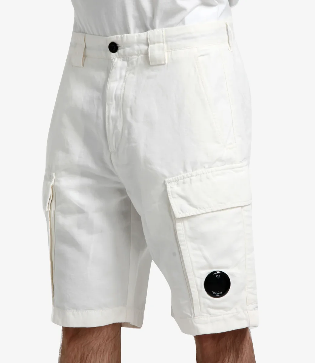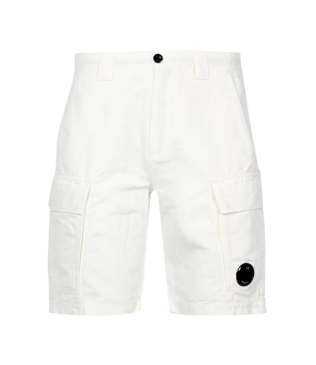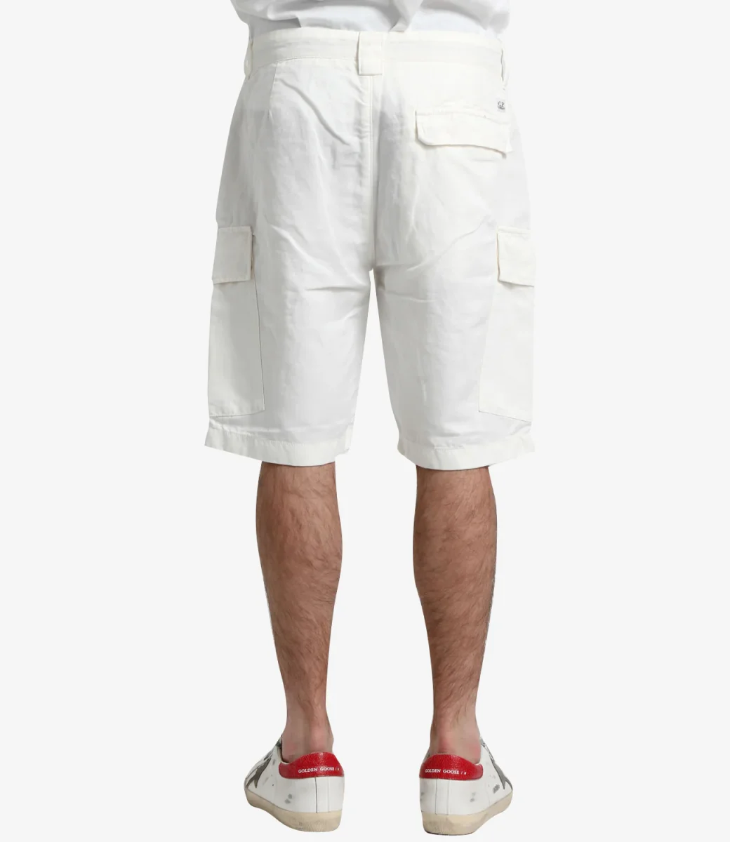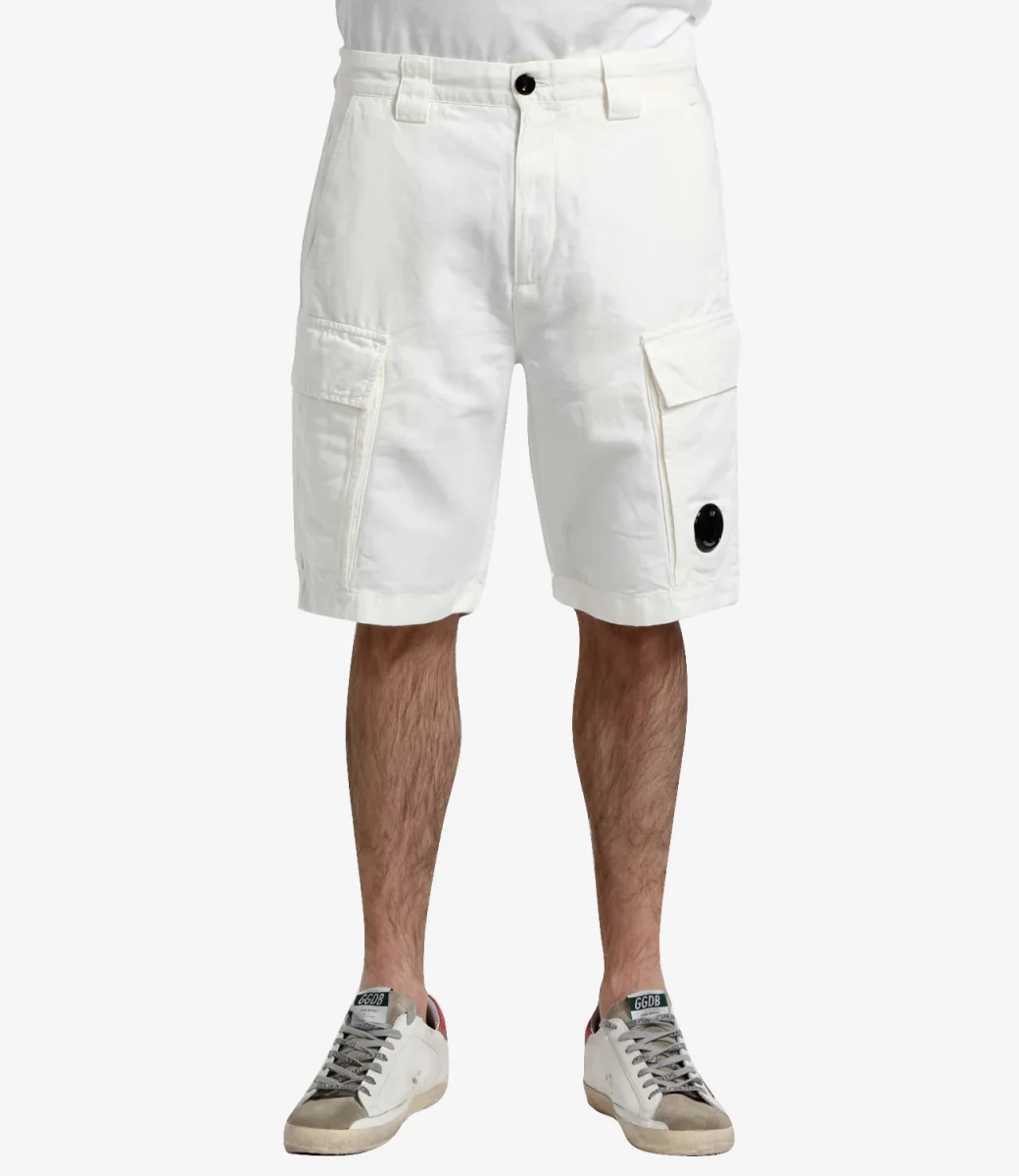 Bermuda C.P. Company Cargo realizzato in gabardine di cotone elasticizzato per garantire massimo comfort e versatilità assieme a una texture robusta, con taglio al ginocchio della linea Undersixteen dotati di passanti per cintura rinforzati, tasche oblique anteriori, capienti scomparti modello cargo con chiusura su entrambe le gambe e l’iconico dettaglio C.P. Company Lens, chiusura frontale con zip e bottone.