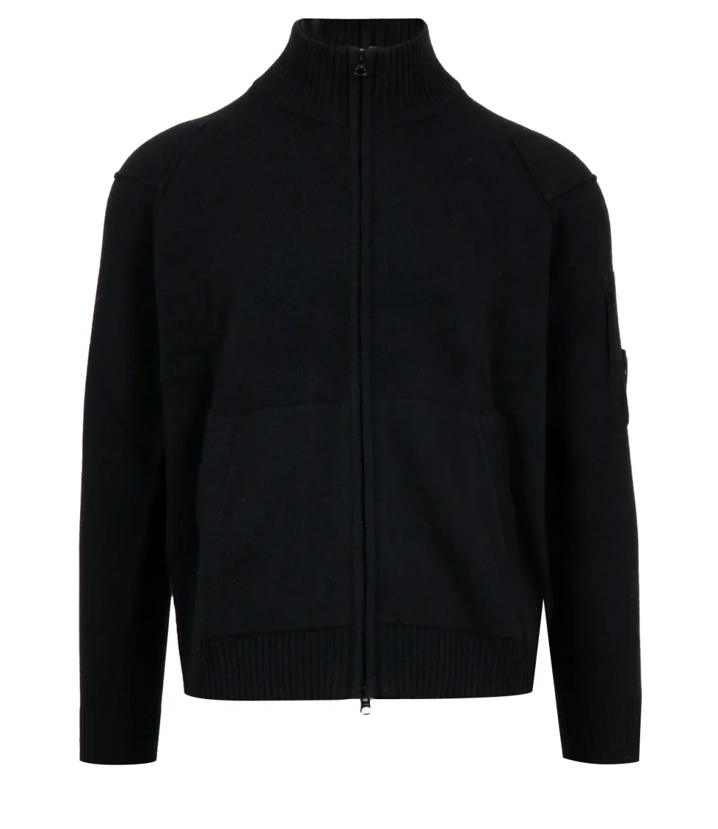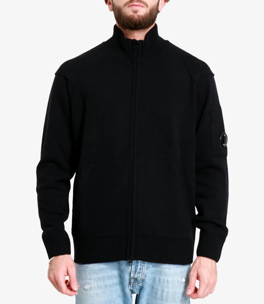 Cardigan C.P. Company realizzato in Lambswool GRS , tessuto con certificazione Global Recycled Standard nel rispetto dell’ambiente e sociale.Modello dal design classico per il brand con zip a doppio cursore, colletto pronunciato, rifinirure con bordi a costine. Iconico badge lente logo C.P. Company sul taschino applicato sulla manica sinistra.