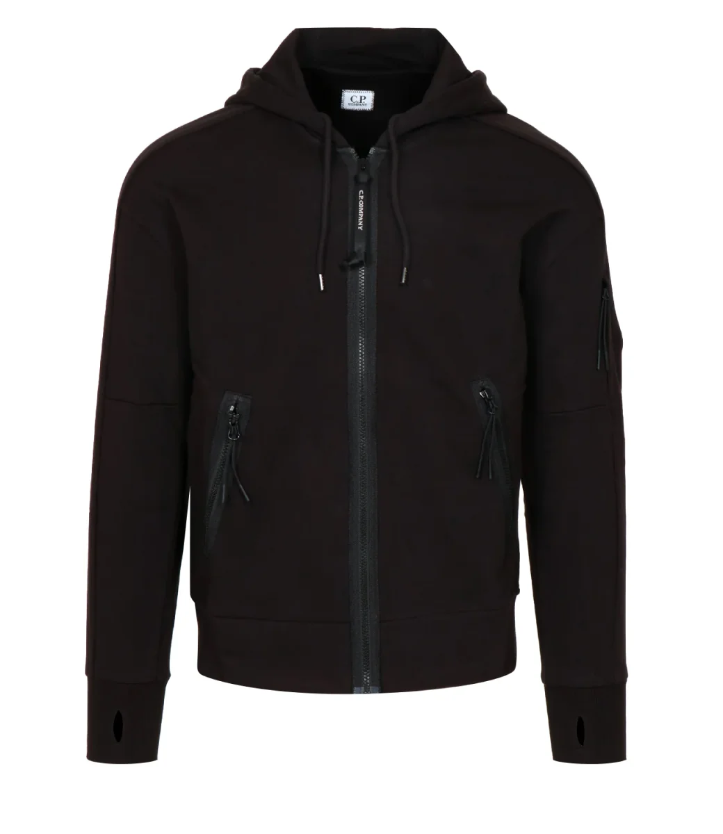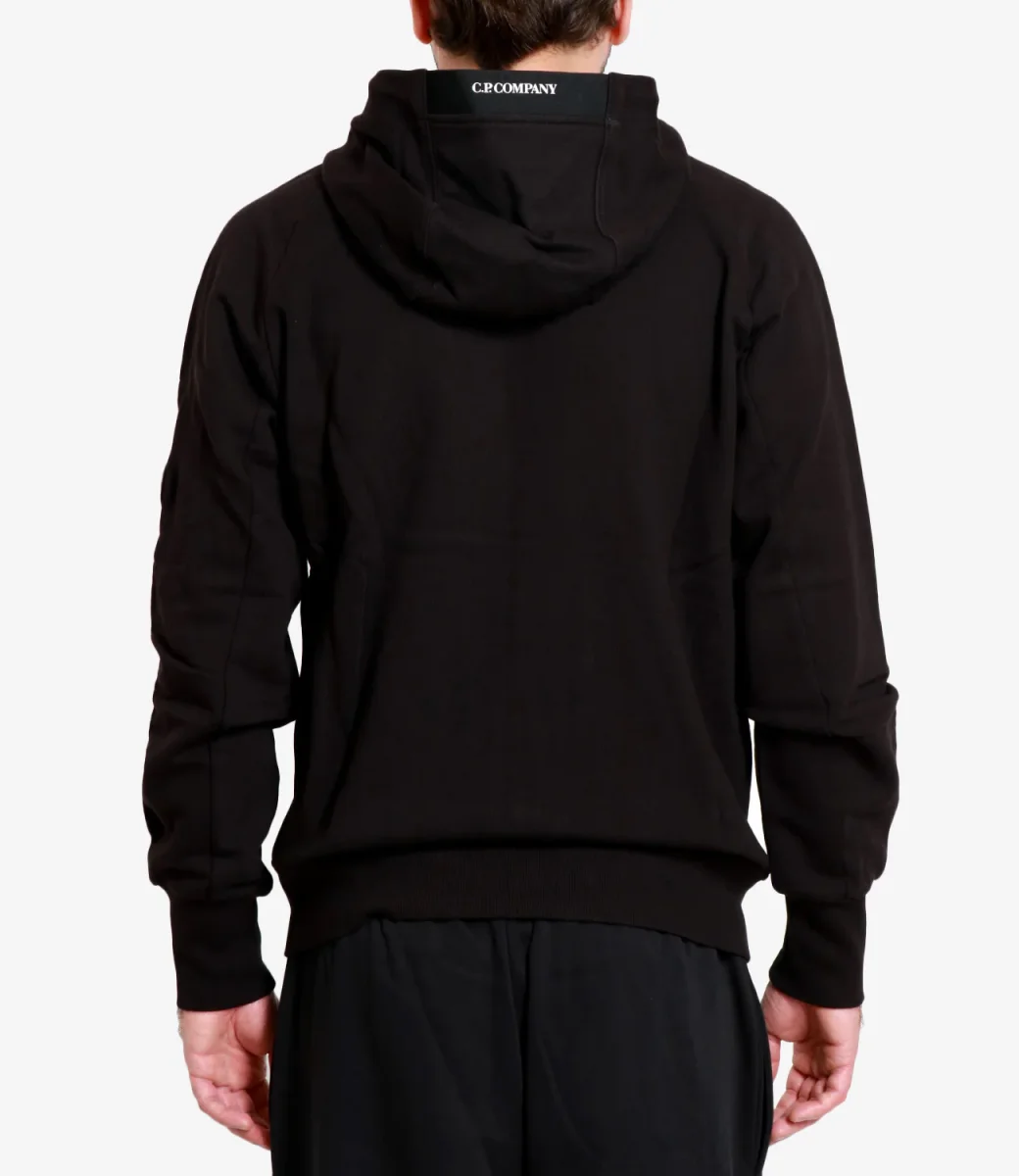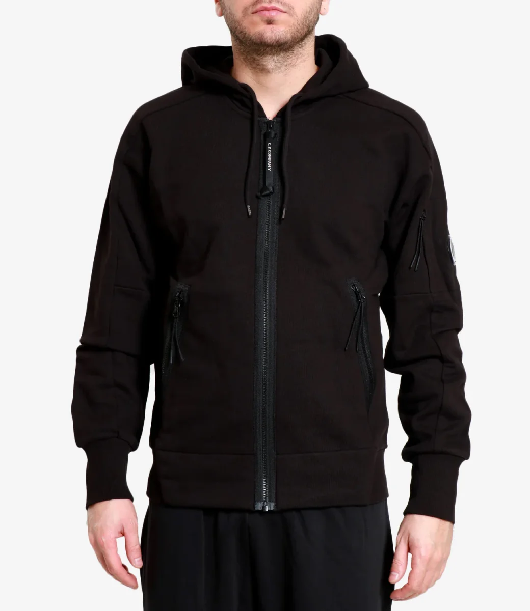 Felpa C.P. Company in misto cotone a trama diagonale garzato, cappuccio con bodo superiore con inserto in neoprene logato, maniche lunghe con polisini a costine e tasca con zip e lente Goggle sulla spalla sinistra, chiusura frontale con zip, fondo con bordo a costine.