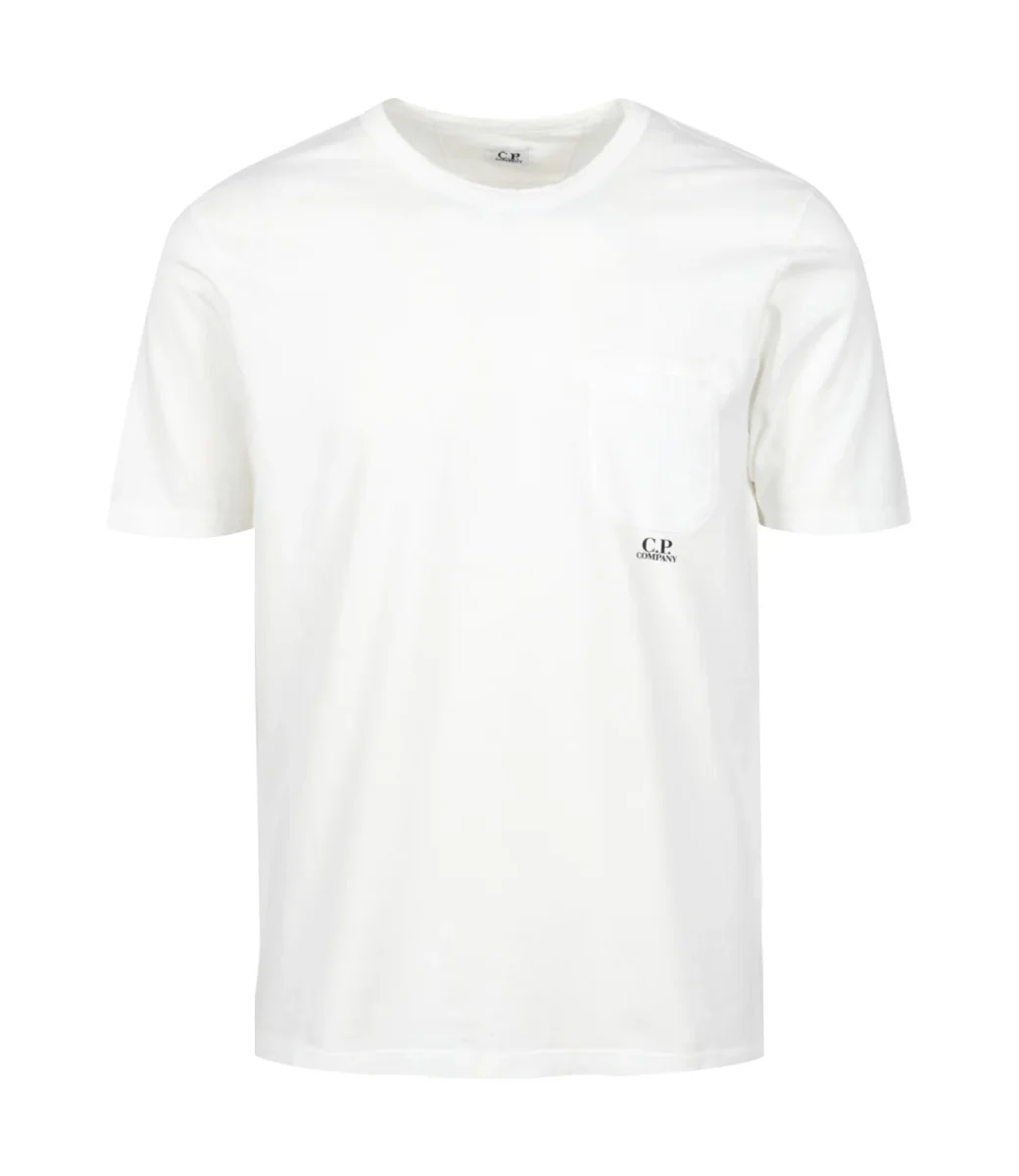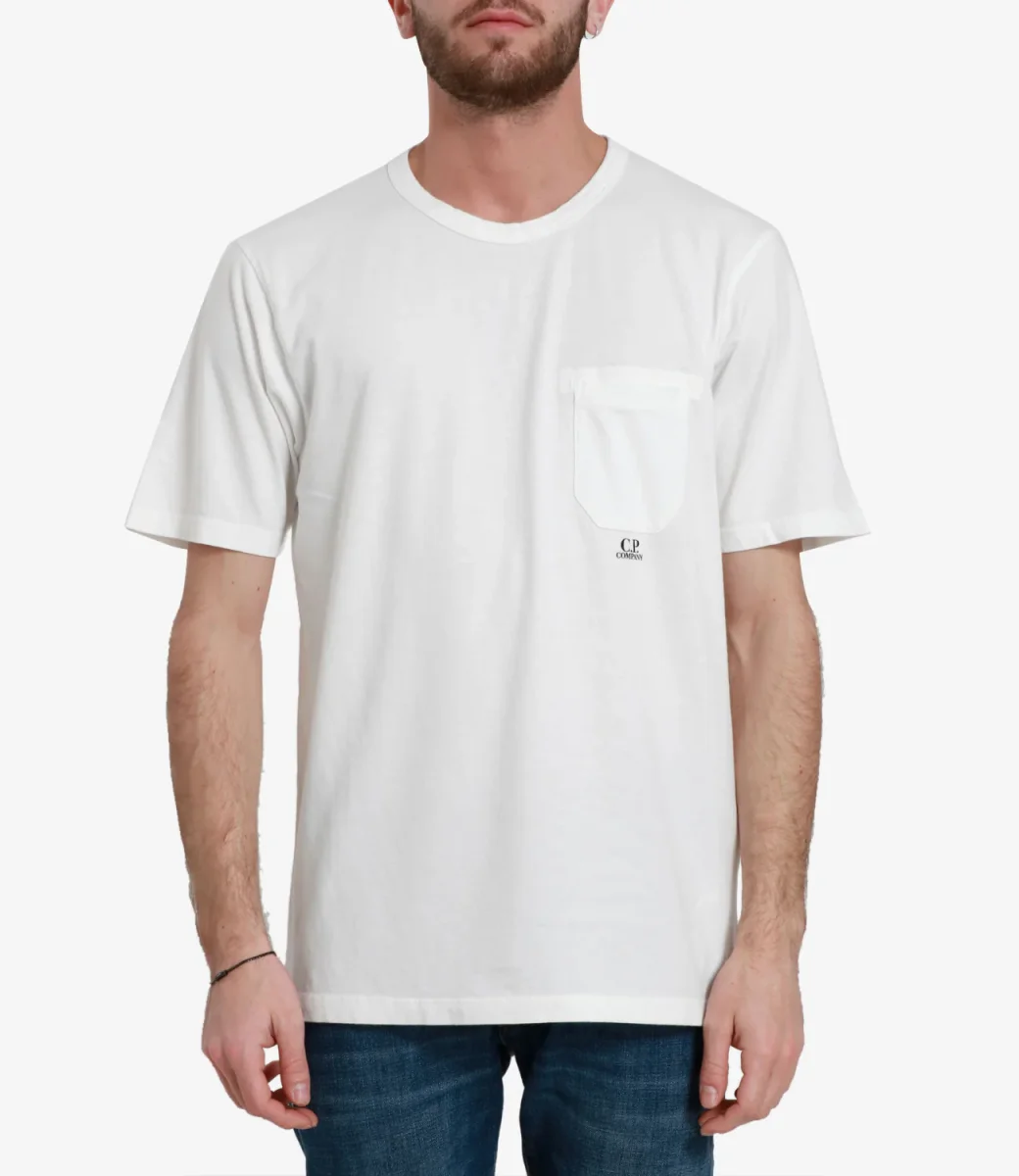 T-Shirt in cotone C.P. Company a girocollo e maniche corte con taschino sul torace e logo stampato. Il modello è alto 1.75m ed indossa una L.