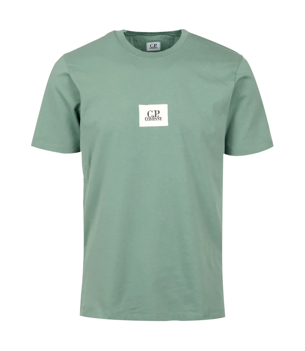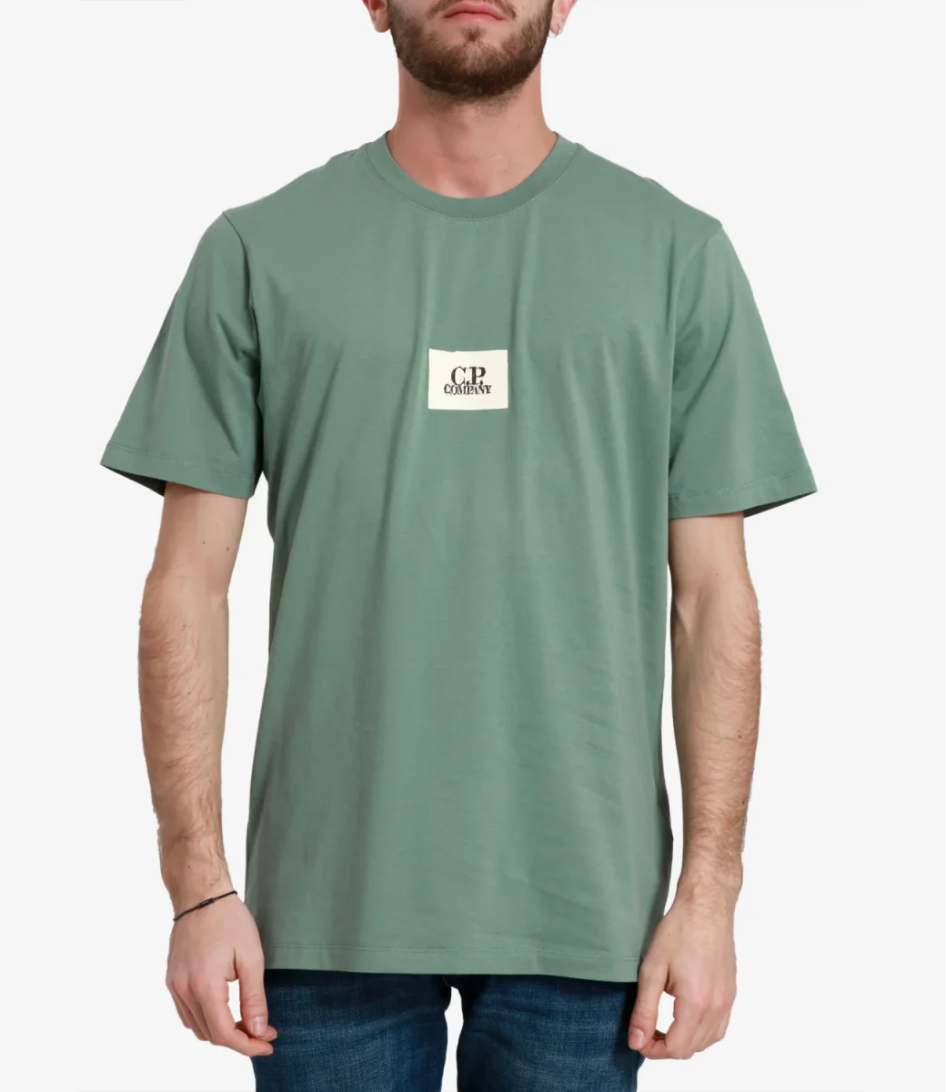 T-Shirt in cotone C.P. Company a girocollo e maniche corte logo stampato. Il modello è alto 1.75m ed indossa una L.