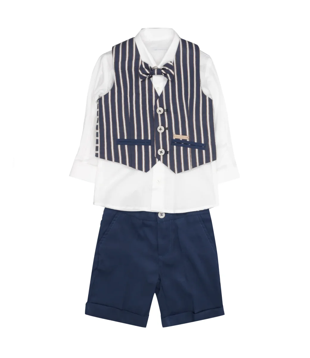 Abito Carlo Pignatelli Junior in cotone, con elastene. Gilet in fantasia a righe verticali bicolor, taschine a filetto, chiusura con bottoni. Camicia con classico collo a punta, chiusura con bottoni, maniche lunghe con polsini con bottoni. Papillon in tessuto a fantasia. Bermuda con vita regolare con passanti, chiusura con bottone e zip con patta, risvolto sul bordo.