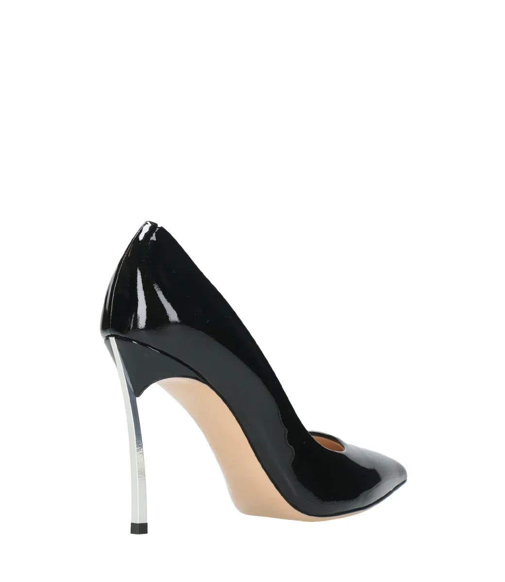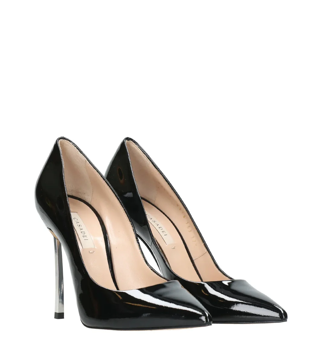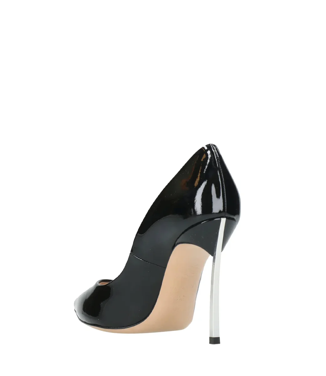 Decolleté Casadei Blade in vernice nera rappresenta lo stile più iconico della maison, svetta sul tacco a stiletto in acciaio temprato, che le conferisce forza e carattere.