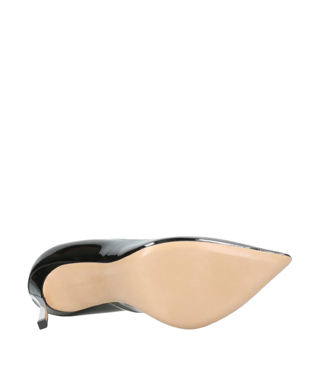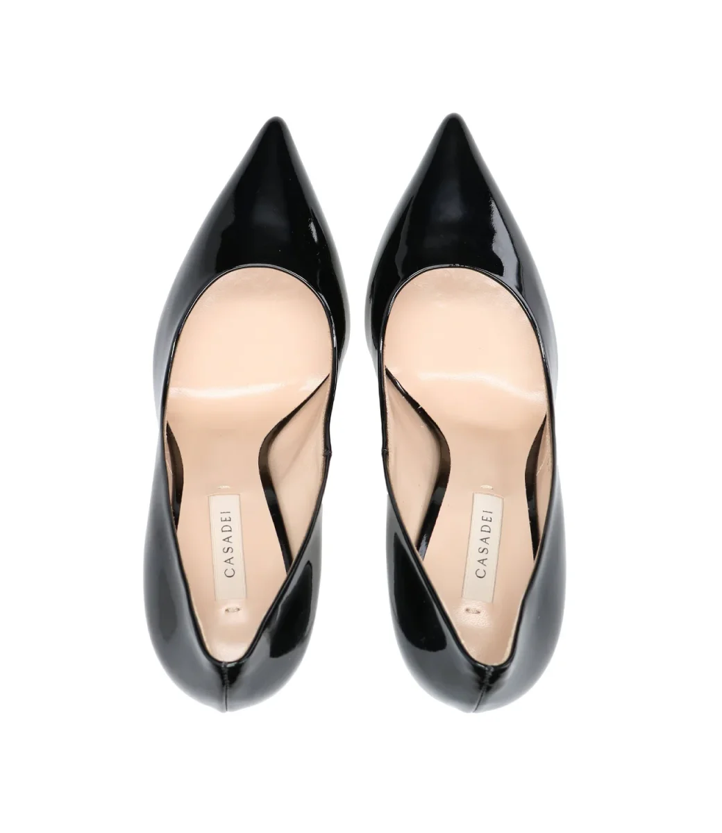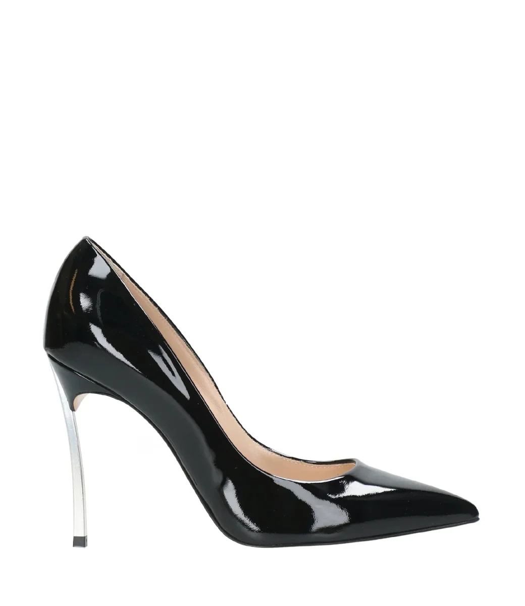 Decolleté Casadei Blade in vernice nera rappresenta lo stile più iconico della maison, svetta sul tacco a stiletto in acciaio temprato, che le conferisce forza e carattere.