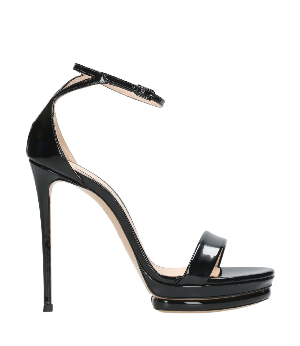Sandalo Casadei Julia in pelle verniciata nera si assicura alla caviglia per mezzo di un sottile cinturino, tra forma affusolata, tacco a stiletto e sottile plateau, rappresenta un classico senza tempo.