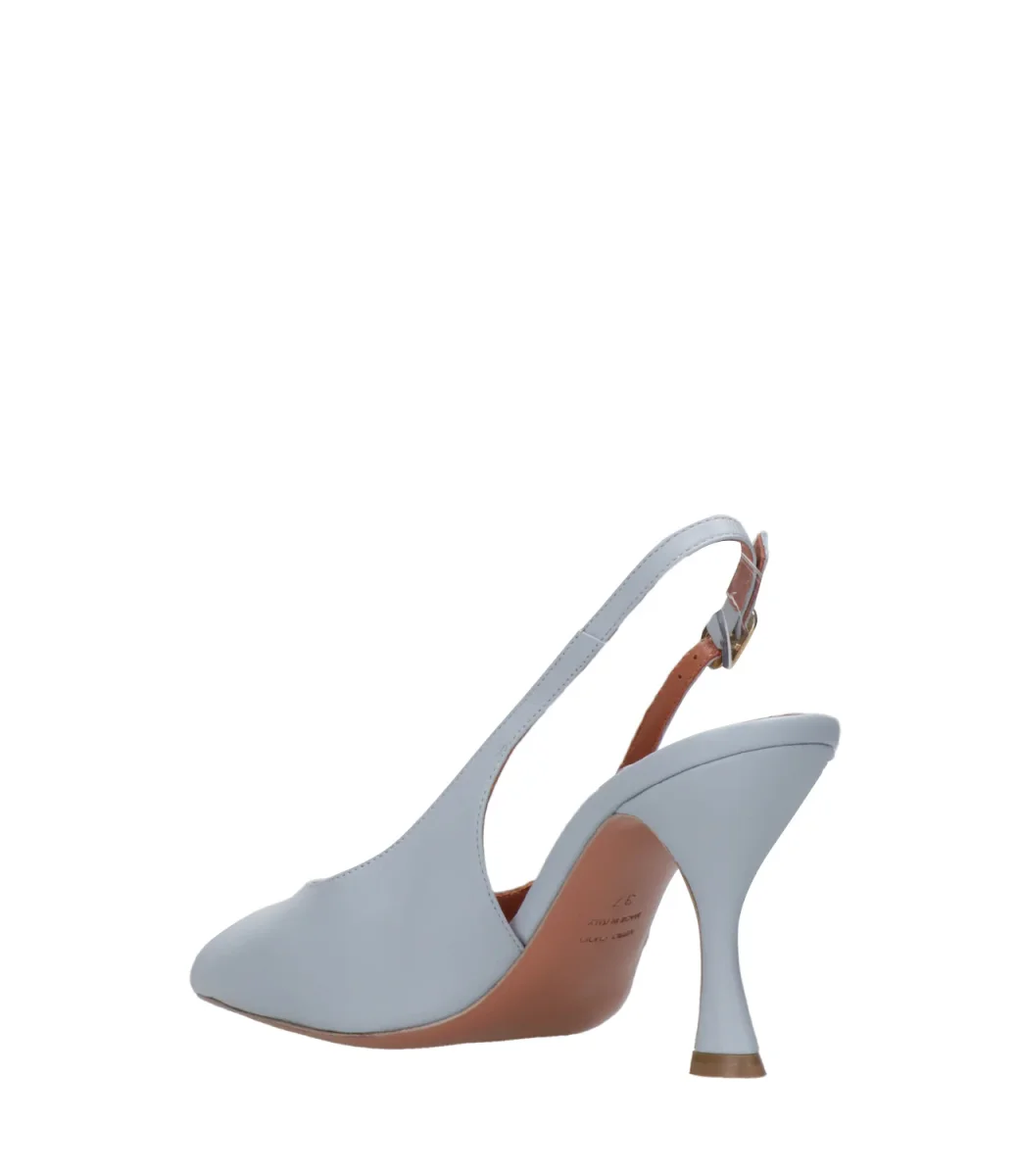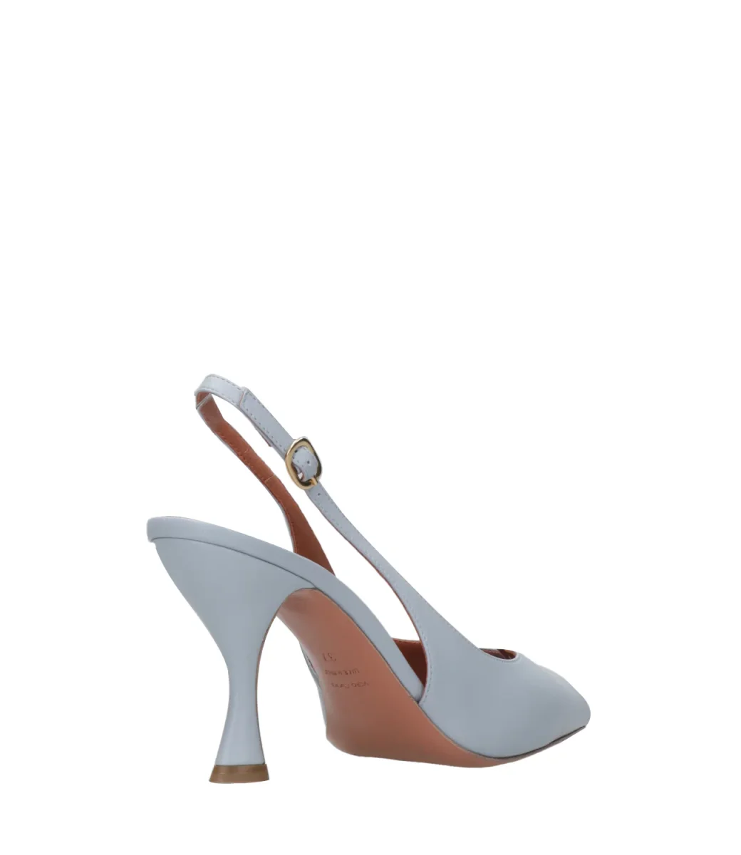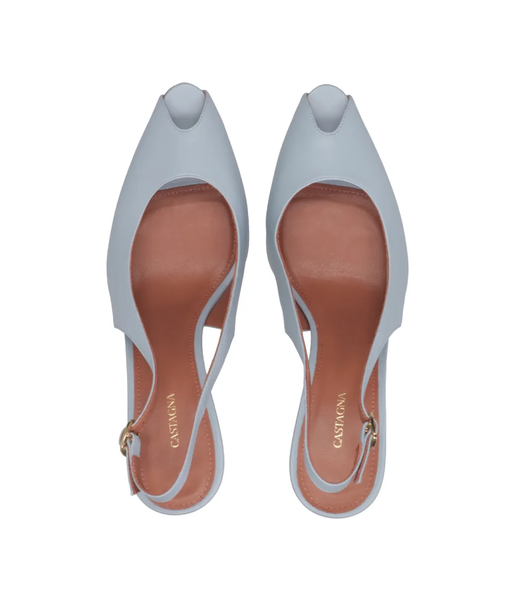 Decollettè Castagna Grace realizzate in pelle con punta aperta e cinturino posteriore regolabile alla caviglia. Classica nello stile, particolare nelle forme con tacco a rocchetto in tono.