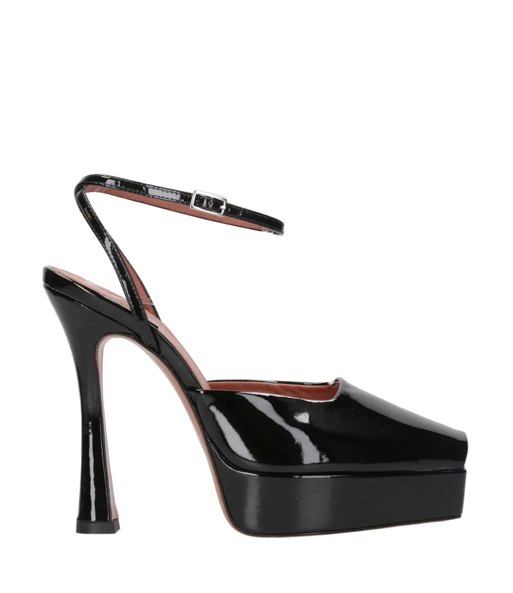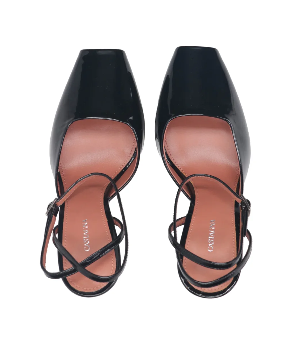 Decolletè Castagna Vicky realizzato in pelle in finish vernice. Modello con punta quadrata, cinturino regolabile con piccola fibbia alla caviglia, tacco squadrato e fondo con plateau.