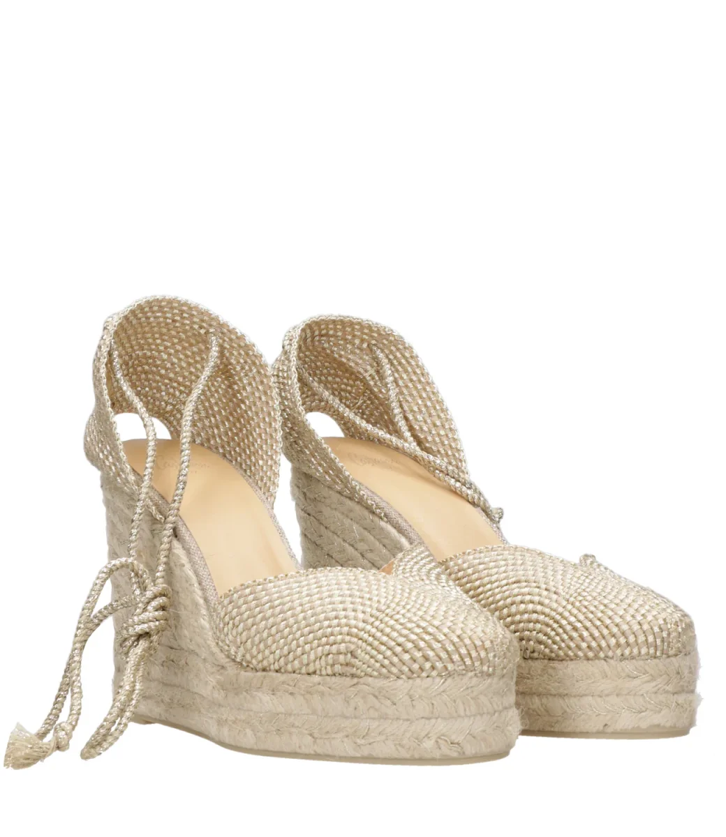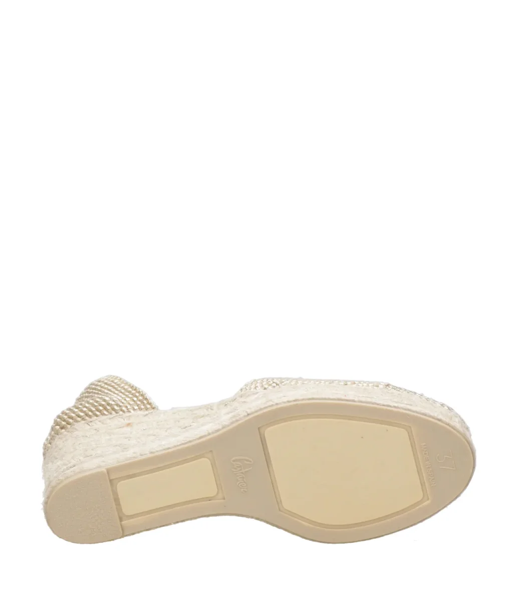 Sandalo Castaner Cora realizzate in juta e rayon con dettagli in filo dorato intrecciato. Modello alto chiusura a fiocco, soletta imbottita.