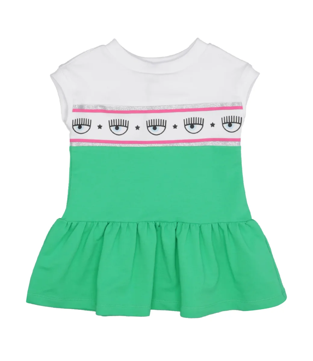 Abito Chiara Ferragni Kids in cotone verde, girocollo, maniche corte, banda Maxi Logomania frontale e balza sul fondo.