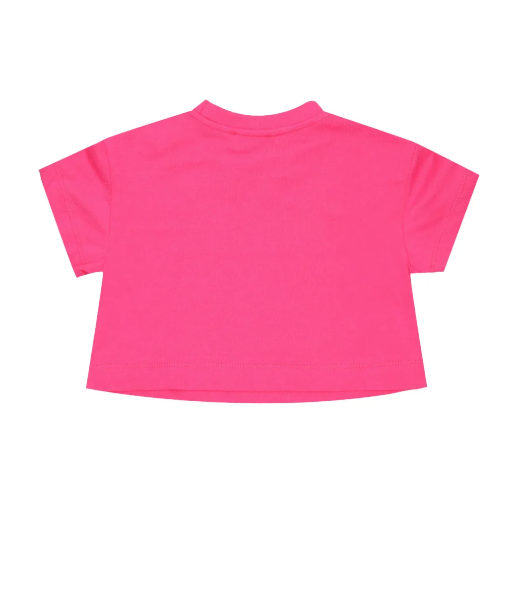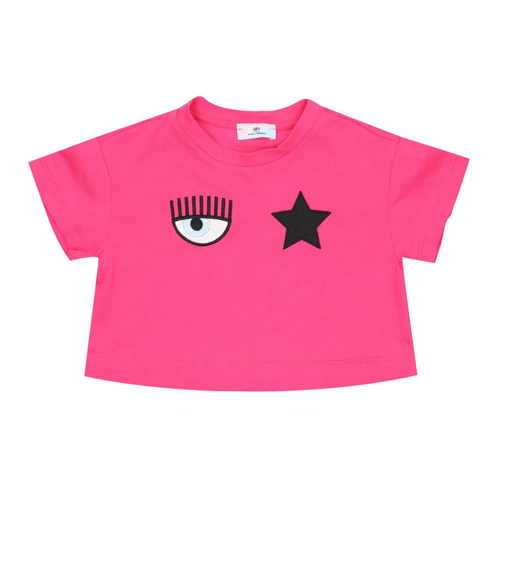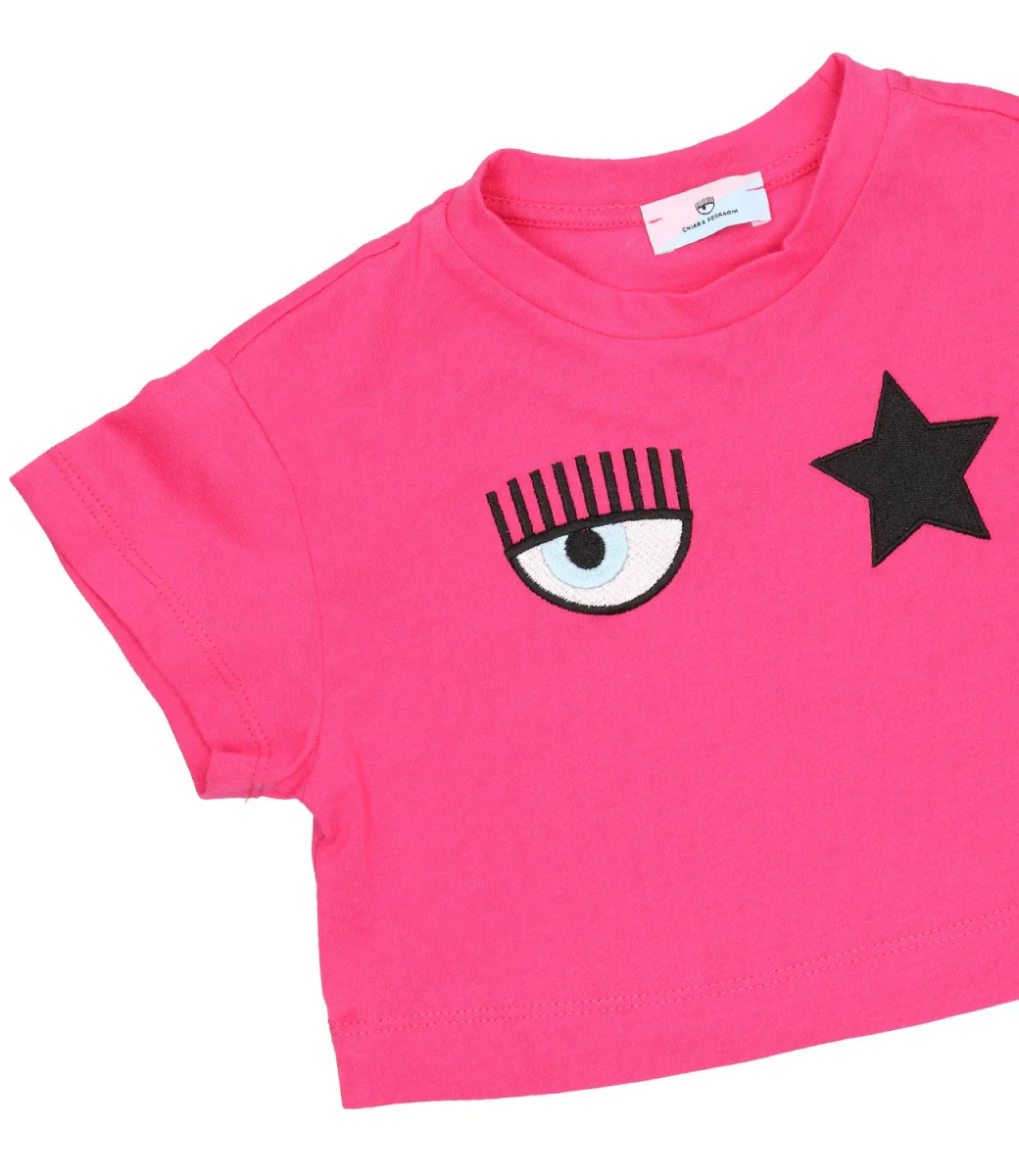 Crop top Chiara Ferragni Kids in cotone fuxia, girocollo, maniche corte e logo Eye Star ricamato sul davanti.