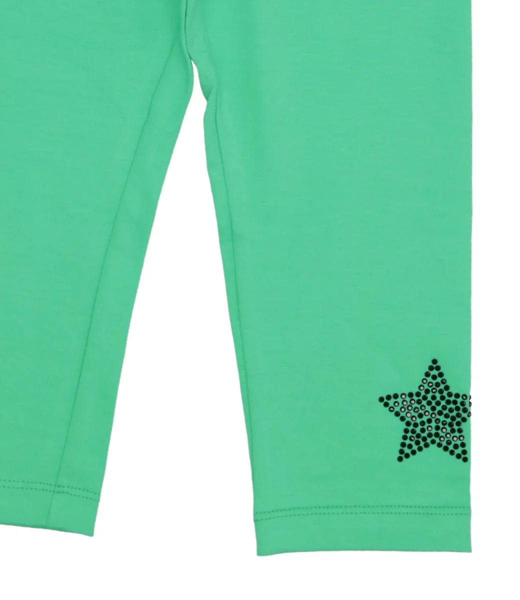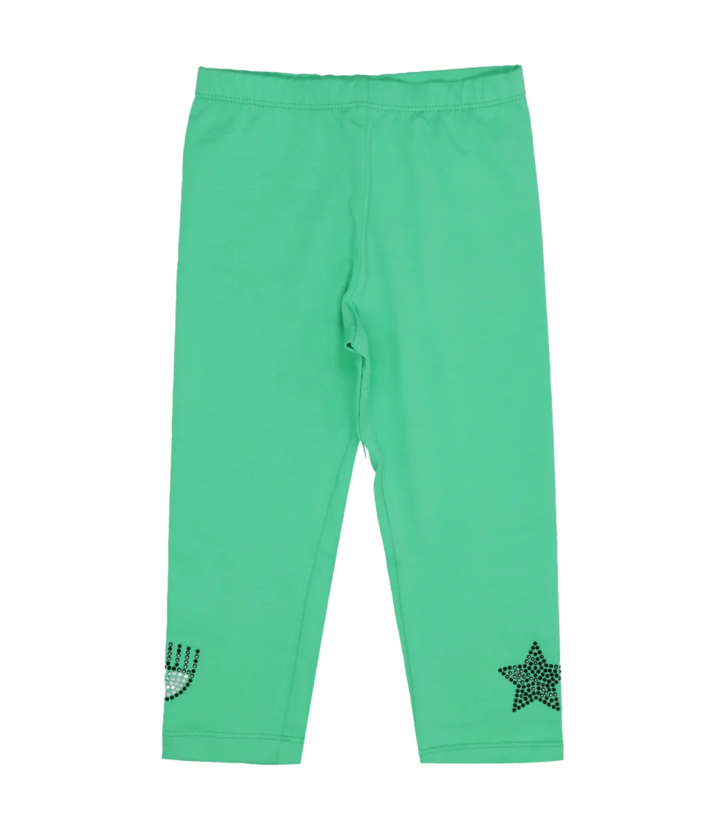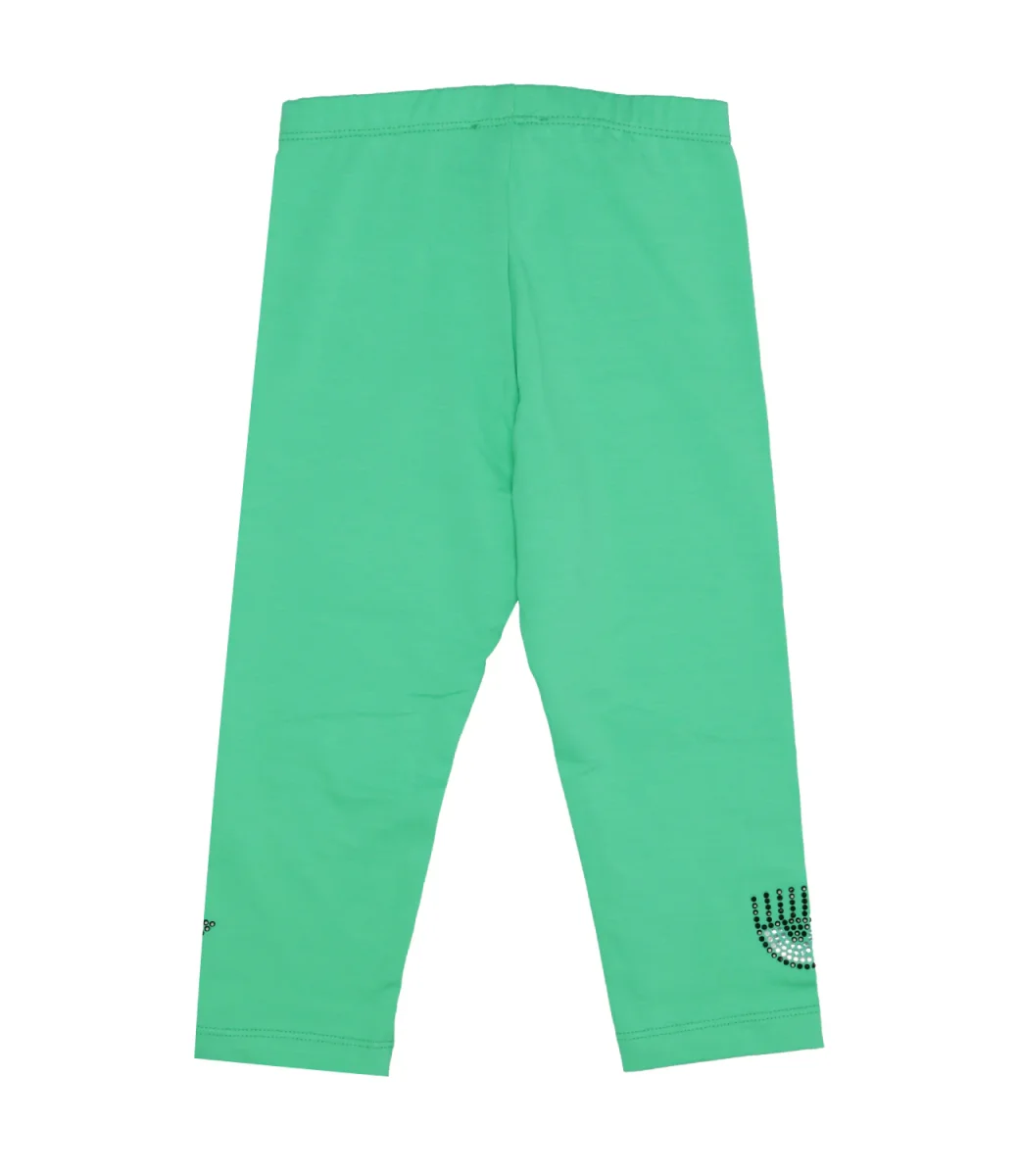 Legging Chiara Ferragni Kids in cotone verde, vita elastica e logo Eye Star in strass applicato sul fondo gamba.