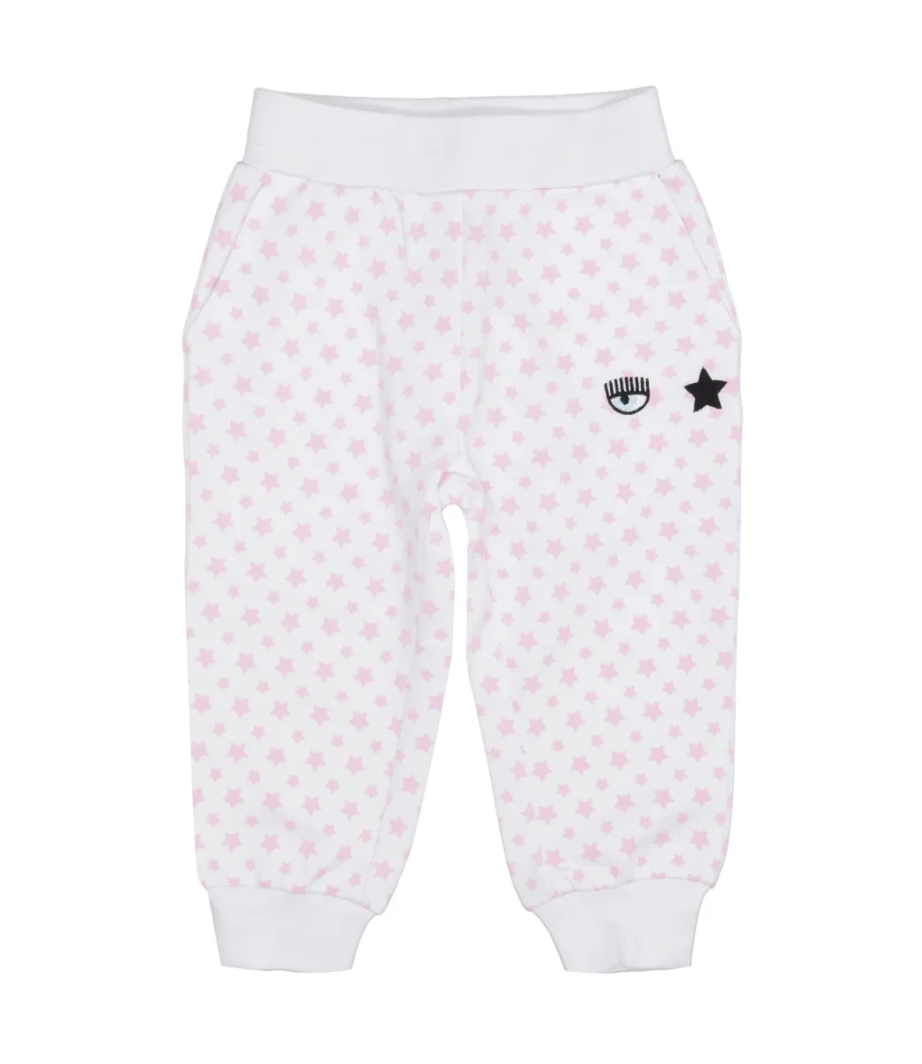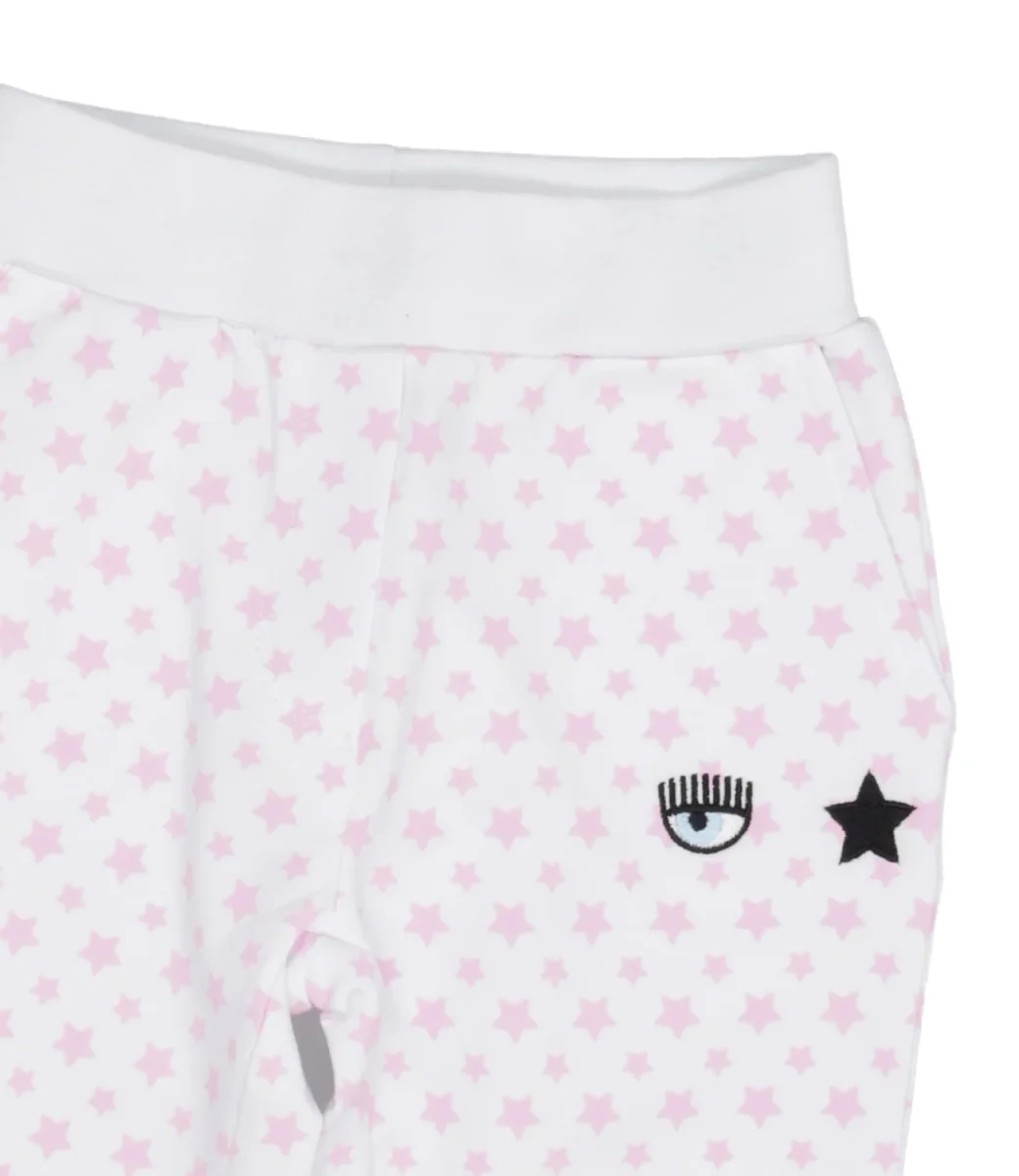 Pantalone sportivi Chiara Ferragni Kids in cotone bianco e rosa con vita elasticizzata, tasche a filo laterali, logo Eye Star ricamato sul fianco sinistro, orlo con polsini a coste
