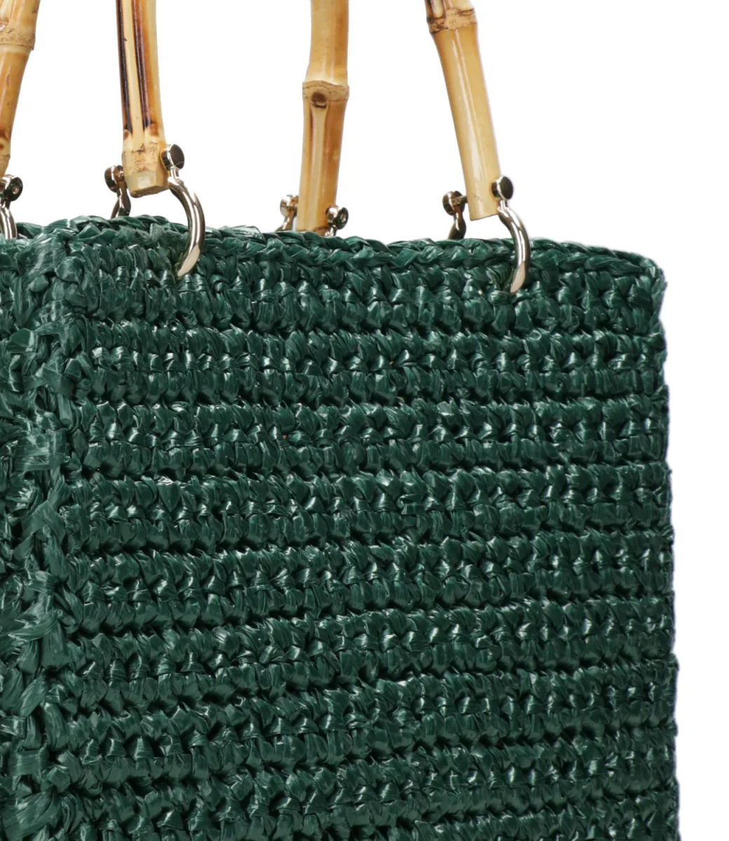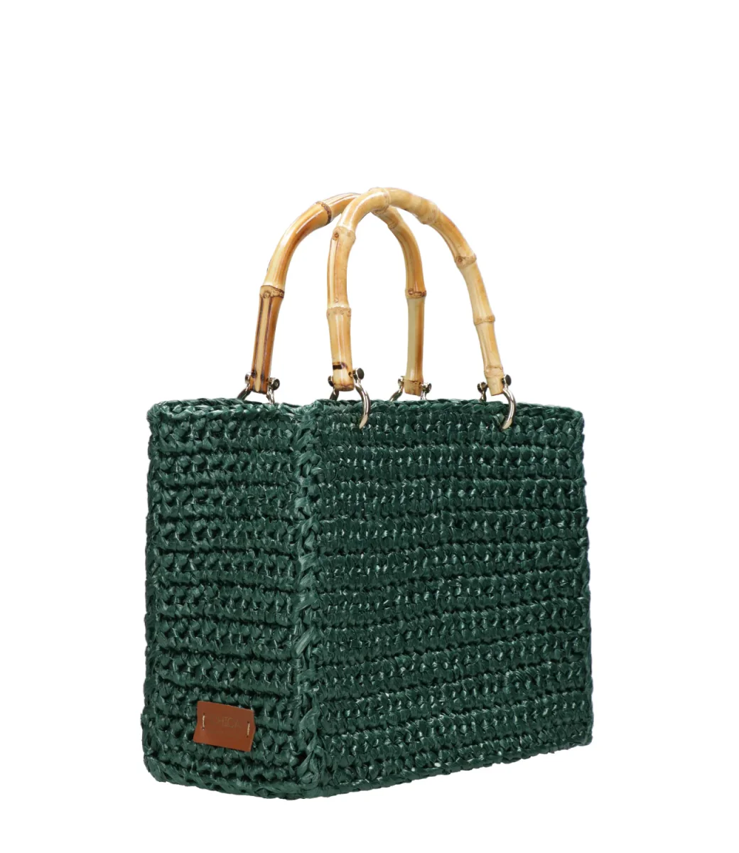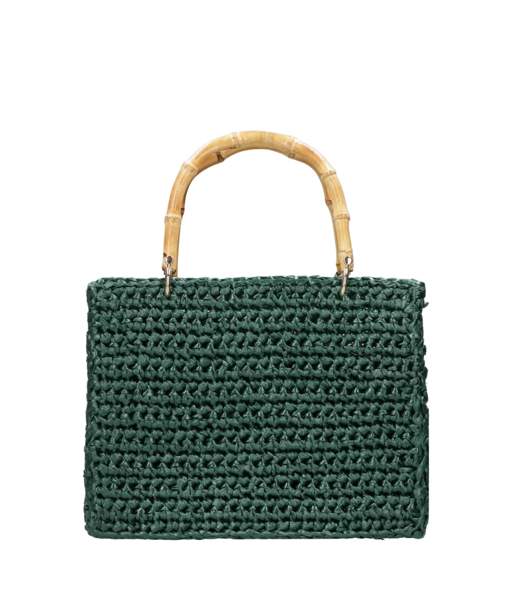 Borsa a Mano Chica Venere in rafia con manici in bambù, tracolla a catena regolabile e removibile, pochette interna in cotone a fantasia removibile.