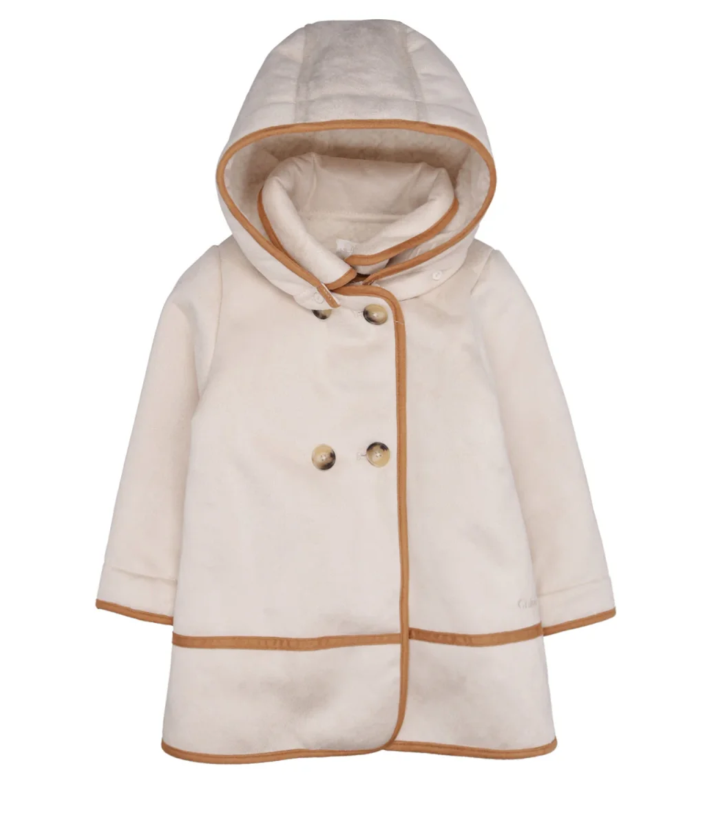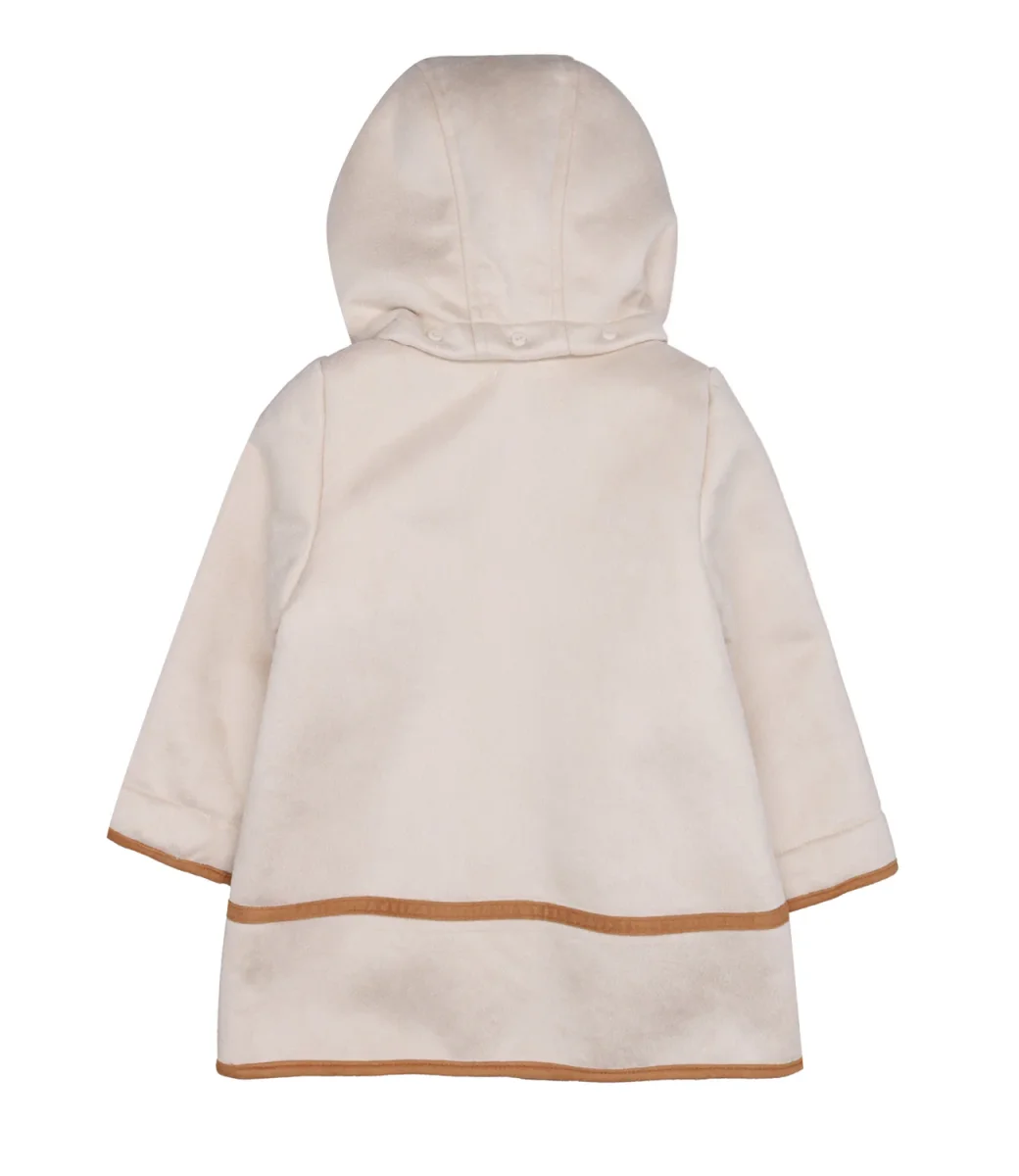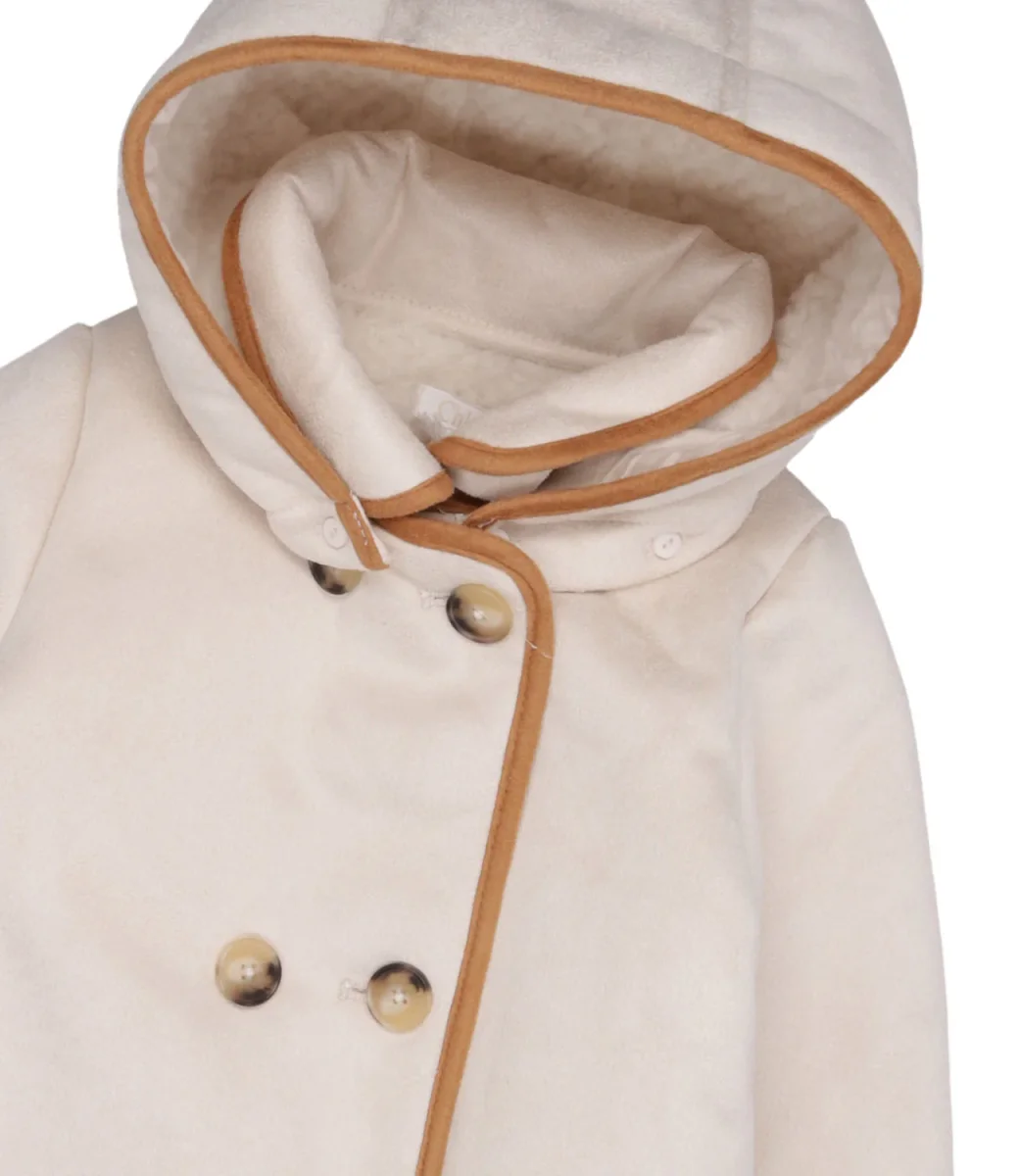 Cappotto Chloè Kids Heritage D3 in ecopelle scamosciata, modello doppio petto, colletto club e cappuccio, maniche lunghe e logo ricamato.
