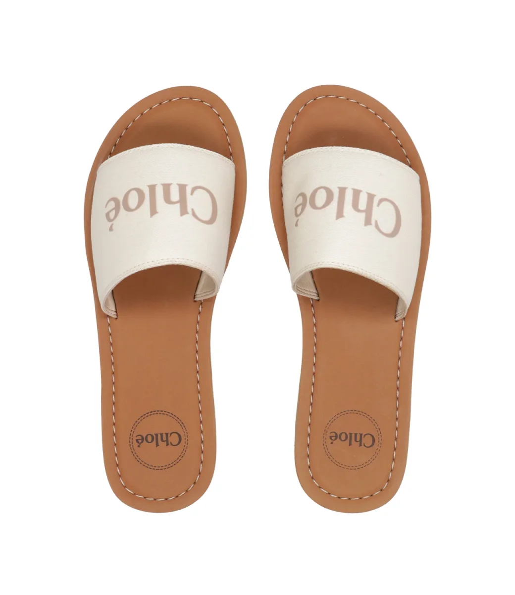 Ciabatta Chloè Kids. Modello a fascia larga in tessuto canvas con maxi logo impresso e suola in gomma logata.