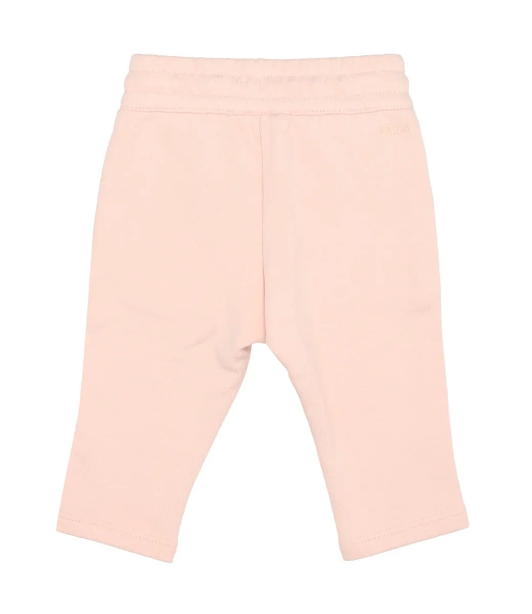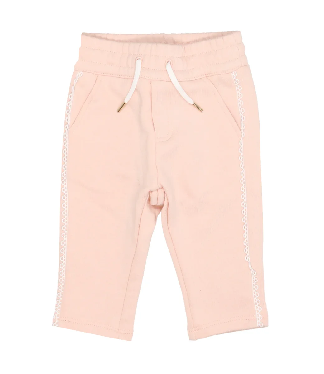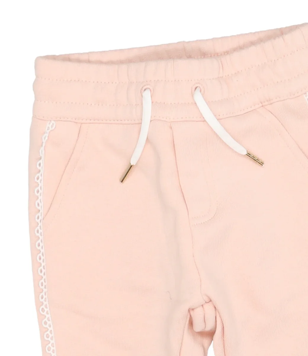 Pantalone da bambina con elastico in vita con coulisse e due tasche frontali.