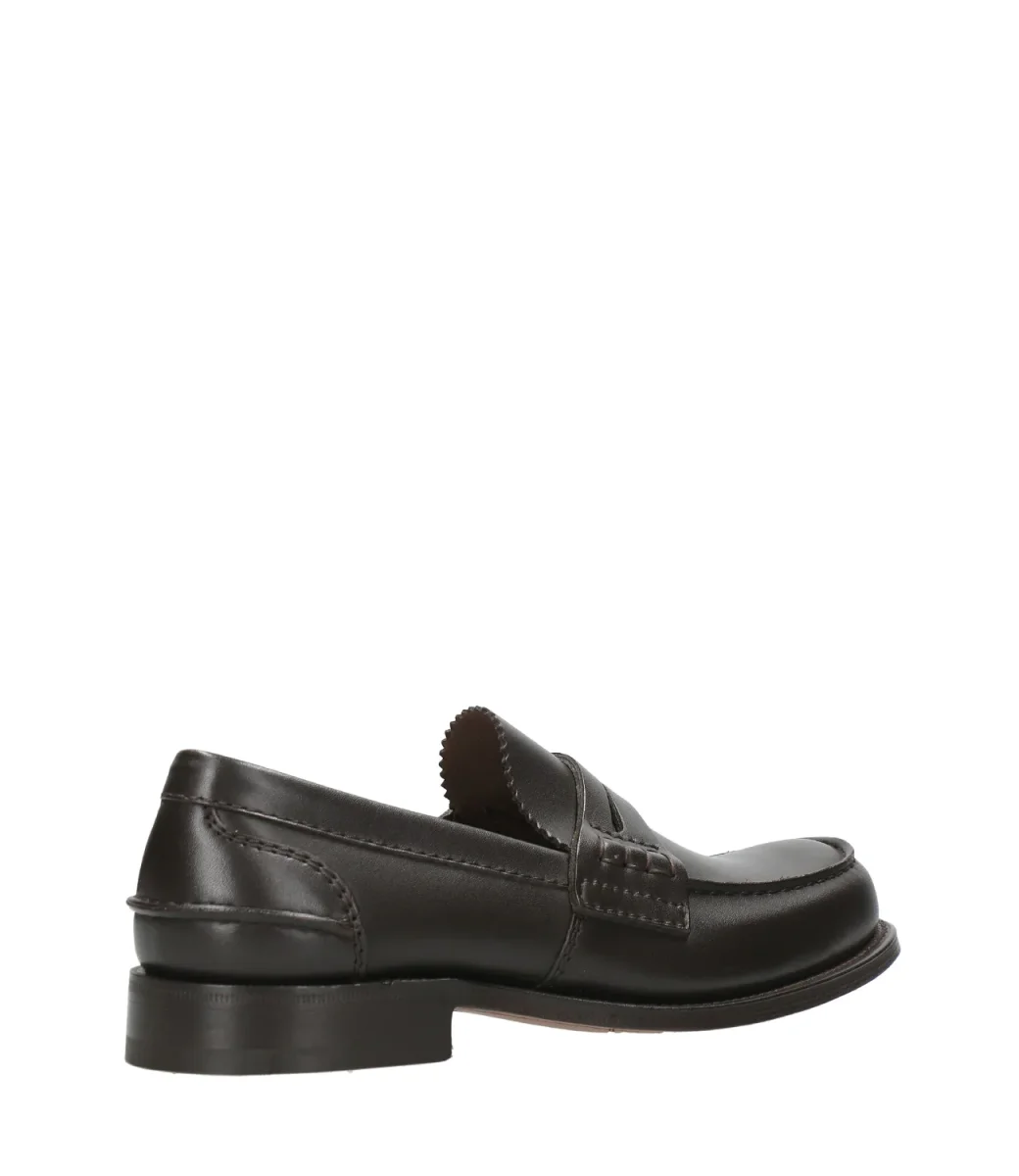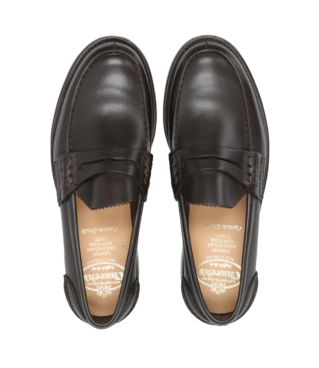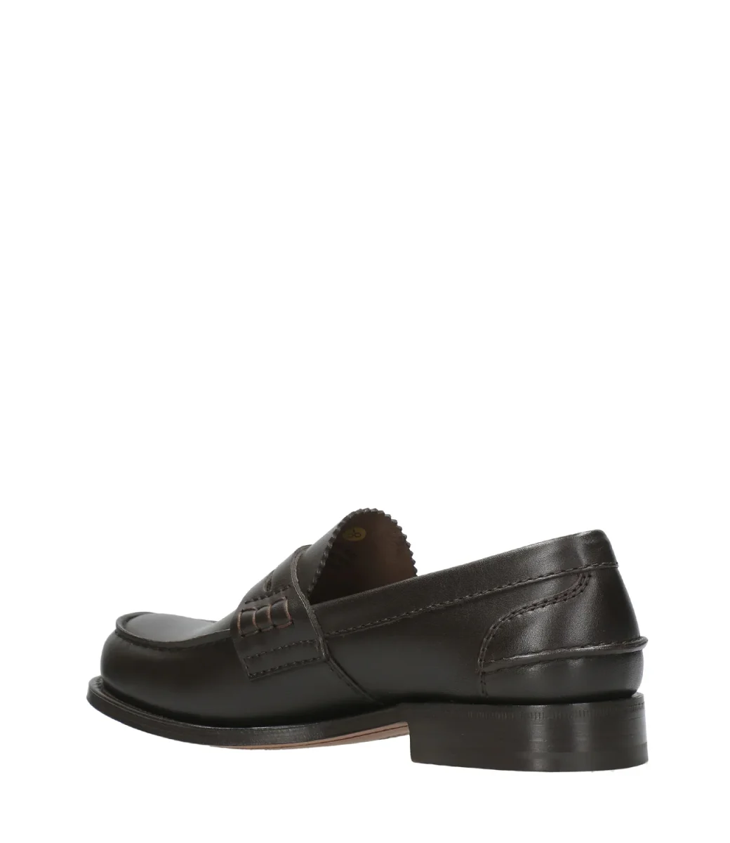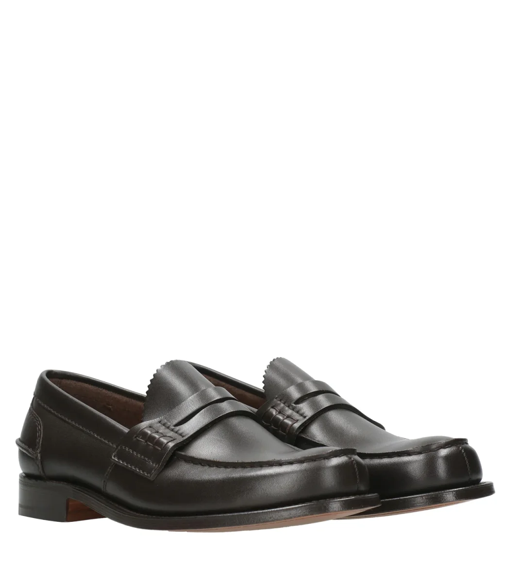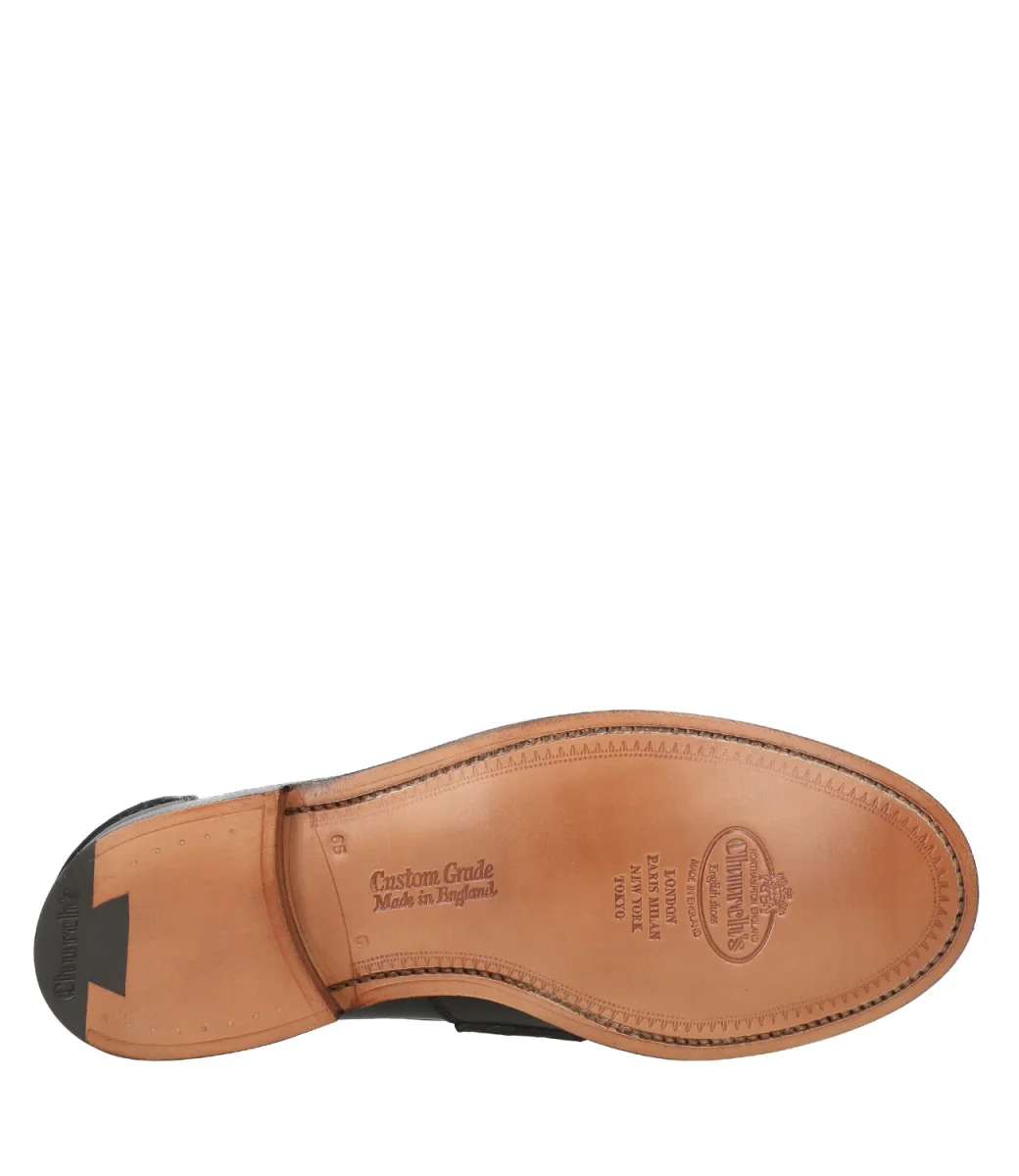 Mocassino Churchs Tunbridge in pelle Bookbinder fumè lucida. Iconico nello stile con punta split toe, dettagli come il bordo seghettato della linguetta, il contrafforte del tallone che rappresentano elementi casual e distintivi dal tocco raffinato.