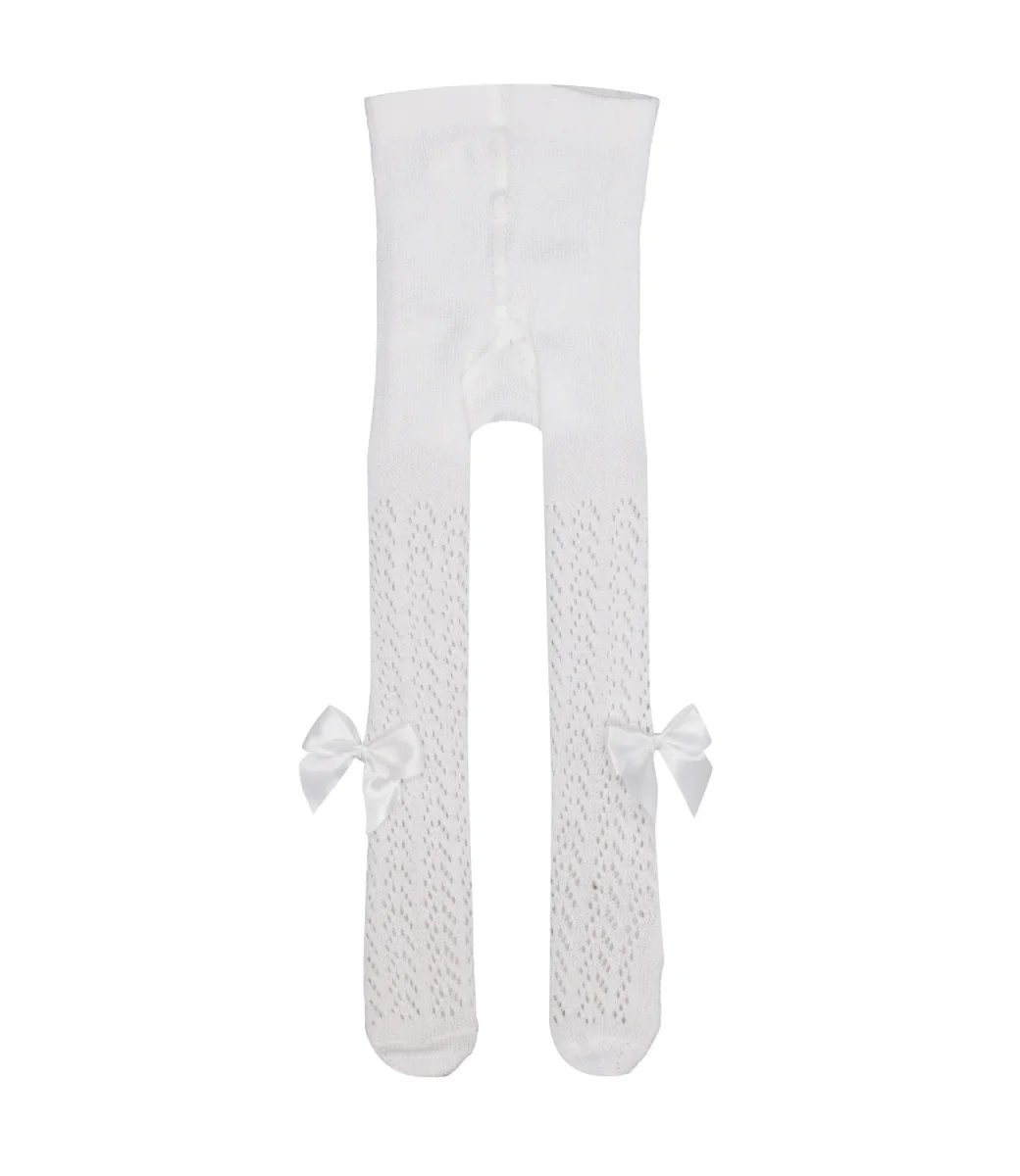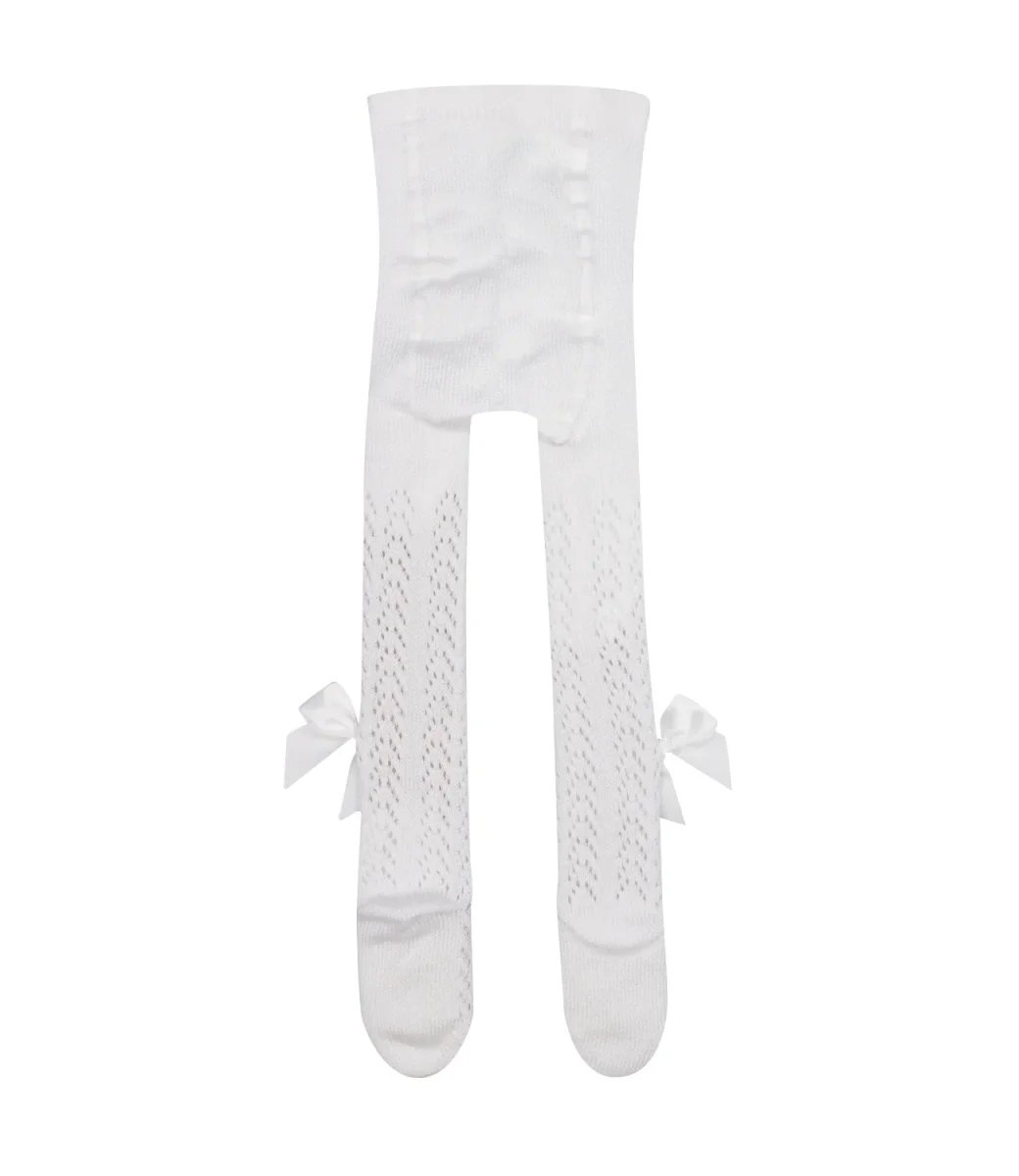 Collant Coccoli in cotone con ricamo forato sulla lughezza e fiocchi in raso applicati sull’esterno.