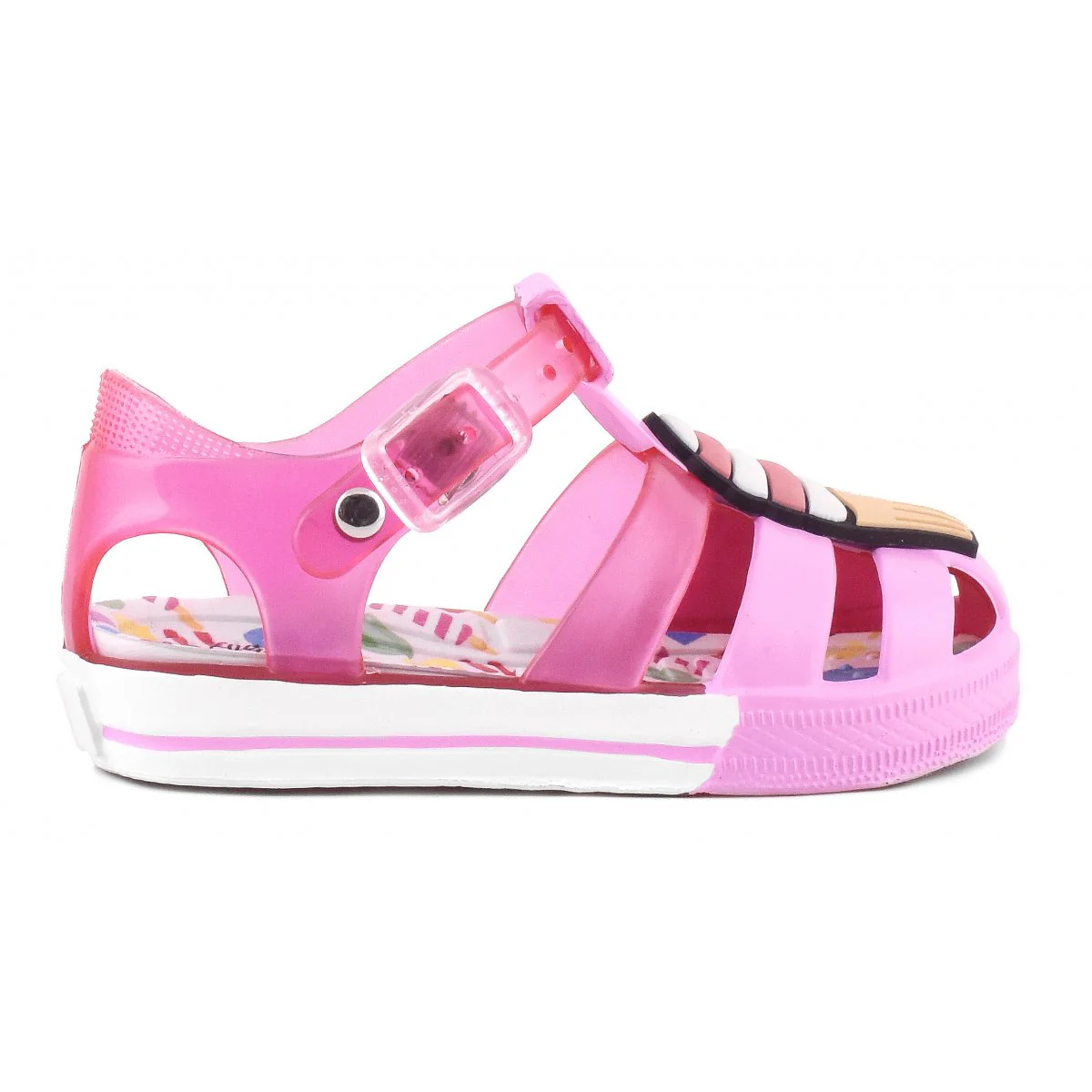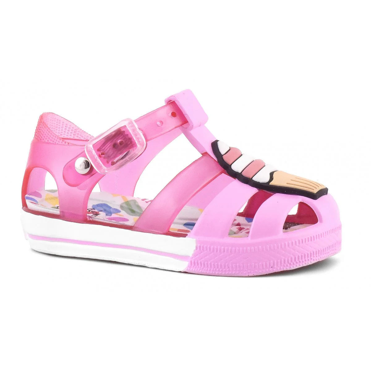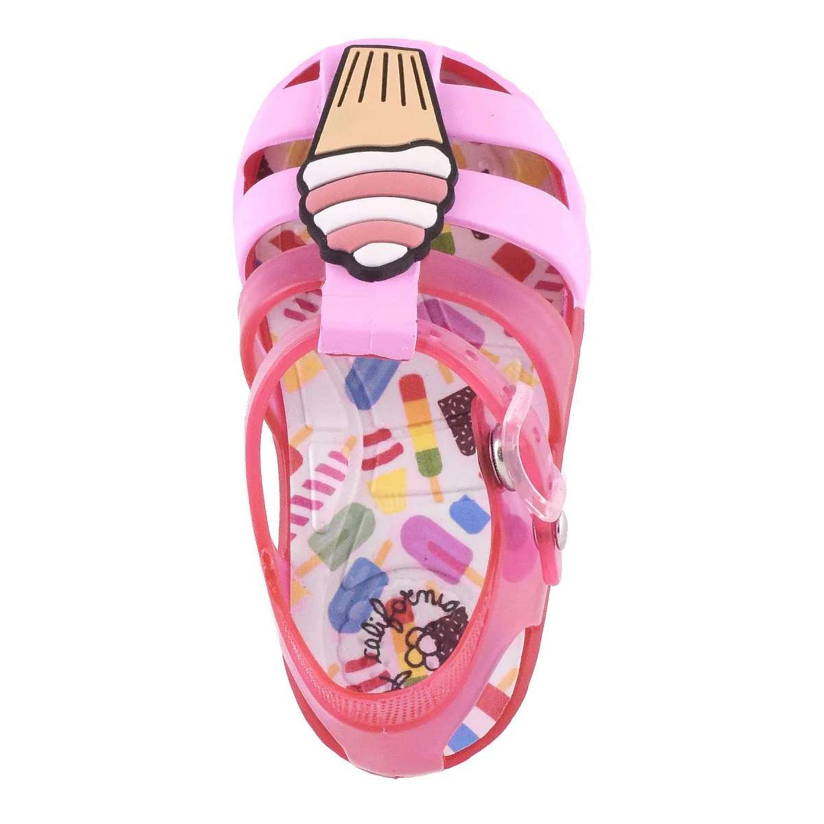Sandalo Colors of California Jelly in pvc rosa con punta tonda, aperture laterali, cinturino laterale e applicazione “gelato” sulla parte frontale.