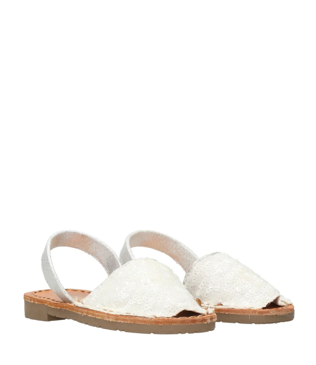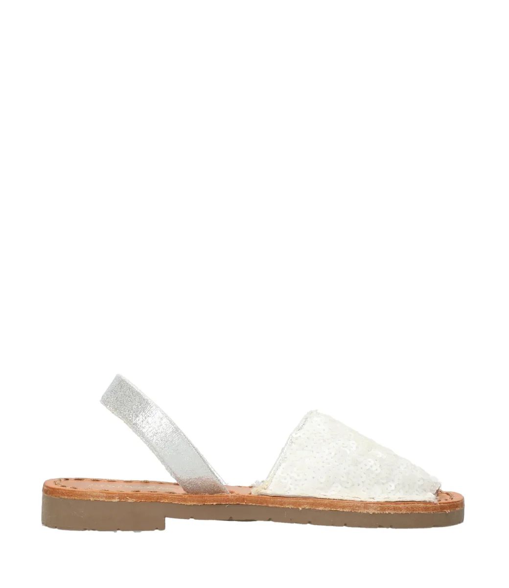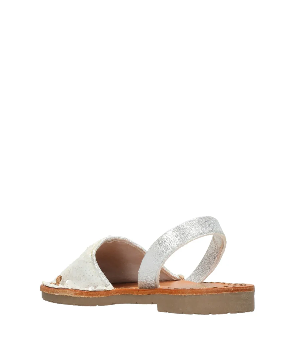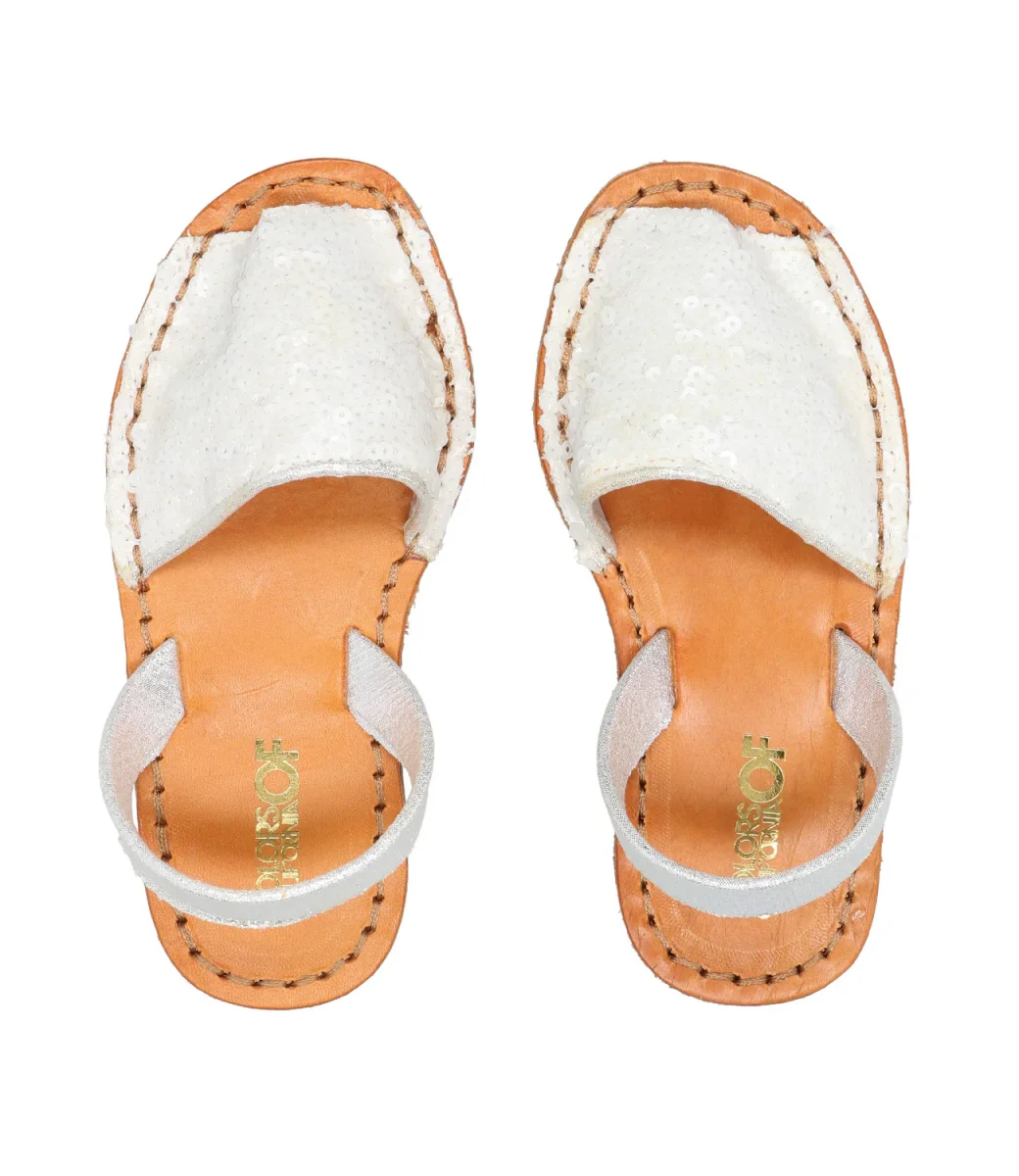 Minorchina con tomaia glitterata, cinturino di pelle laminata e soletta di pelle.