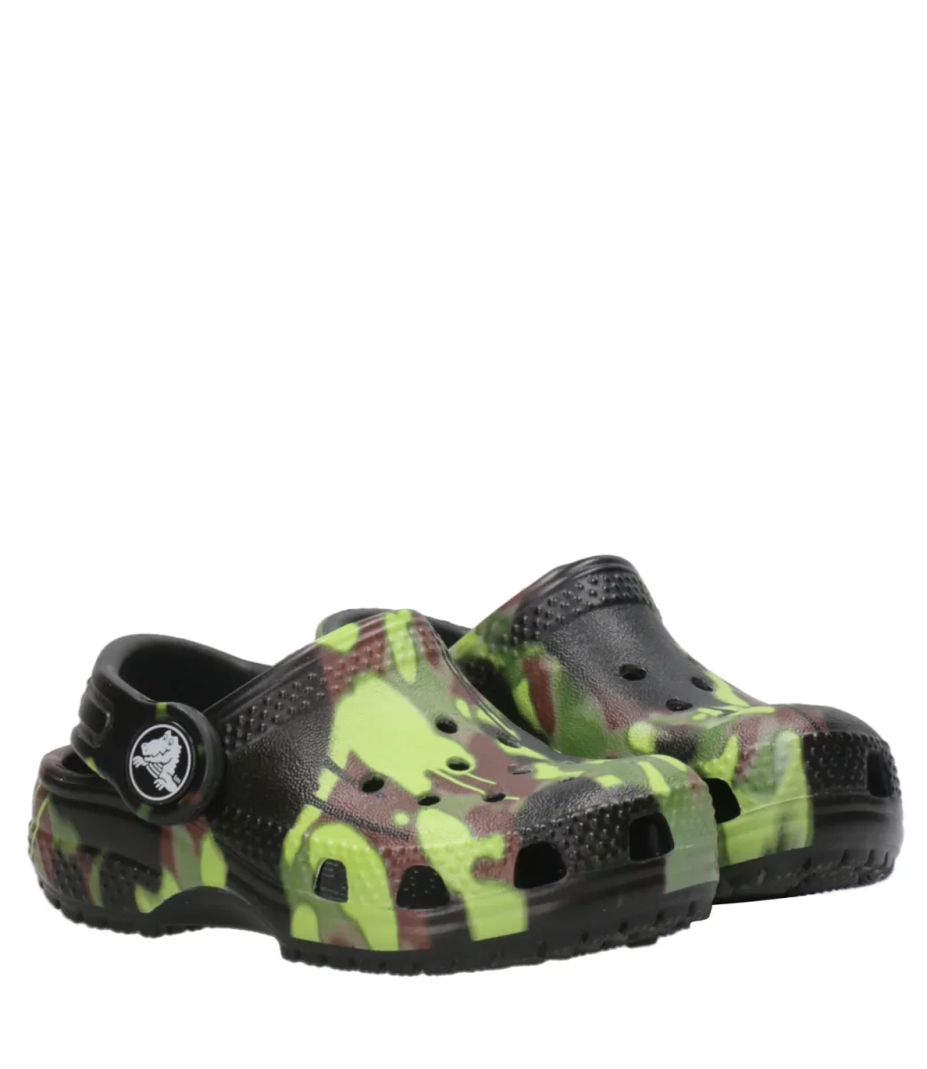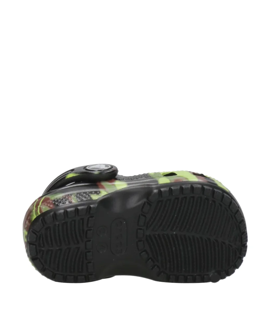 Sabot Crocs Kids modello Classic Spray Camo Clog T. La grafica mimetica con vernice spray conferisce uno stile in più a questa versione dell’iconico zoccolo con un aspetto sportivo e moderno, la struttura in schiuma Croslite™ li rende leggeri e facili da indossare. Radicato nel comfort, arricchito di personalità.