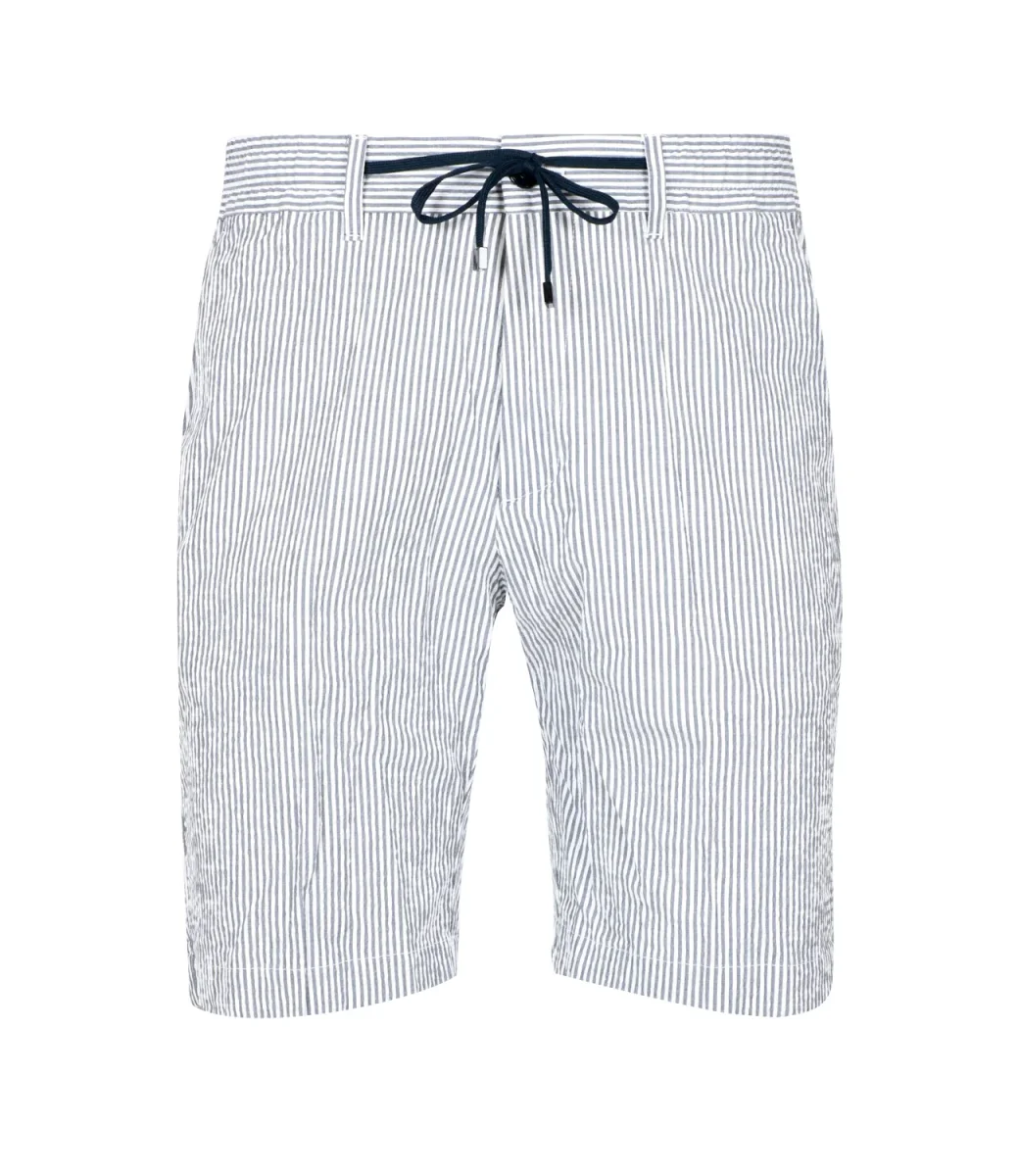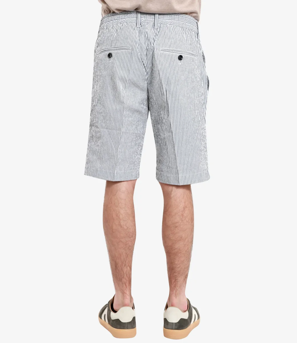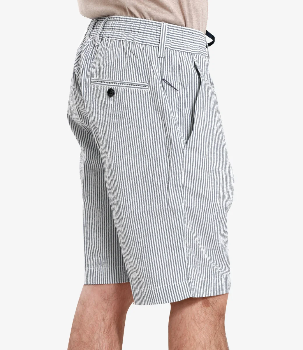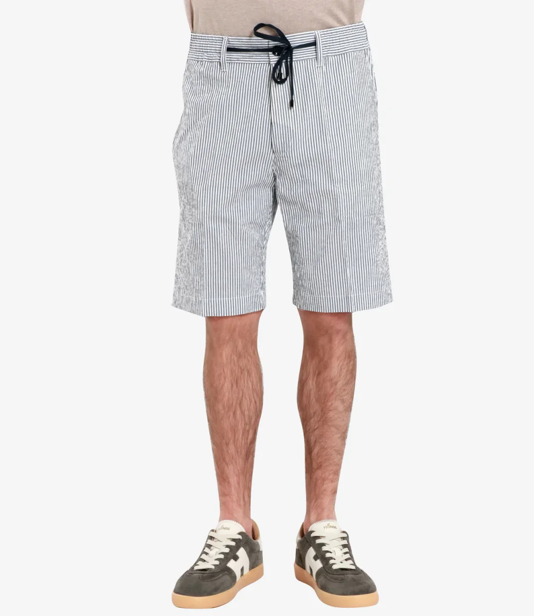 Bermuda Cruna in cotone con vita regolare e coulisse, 4 tasche. Il modello è alto 1.75m ed indossa una 44.