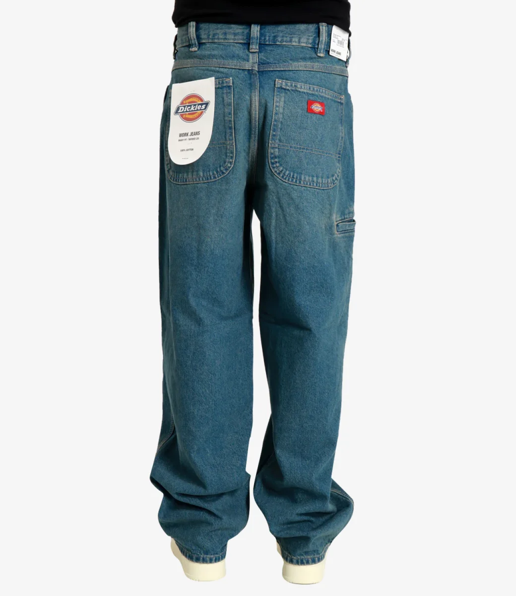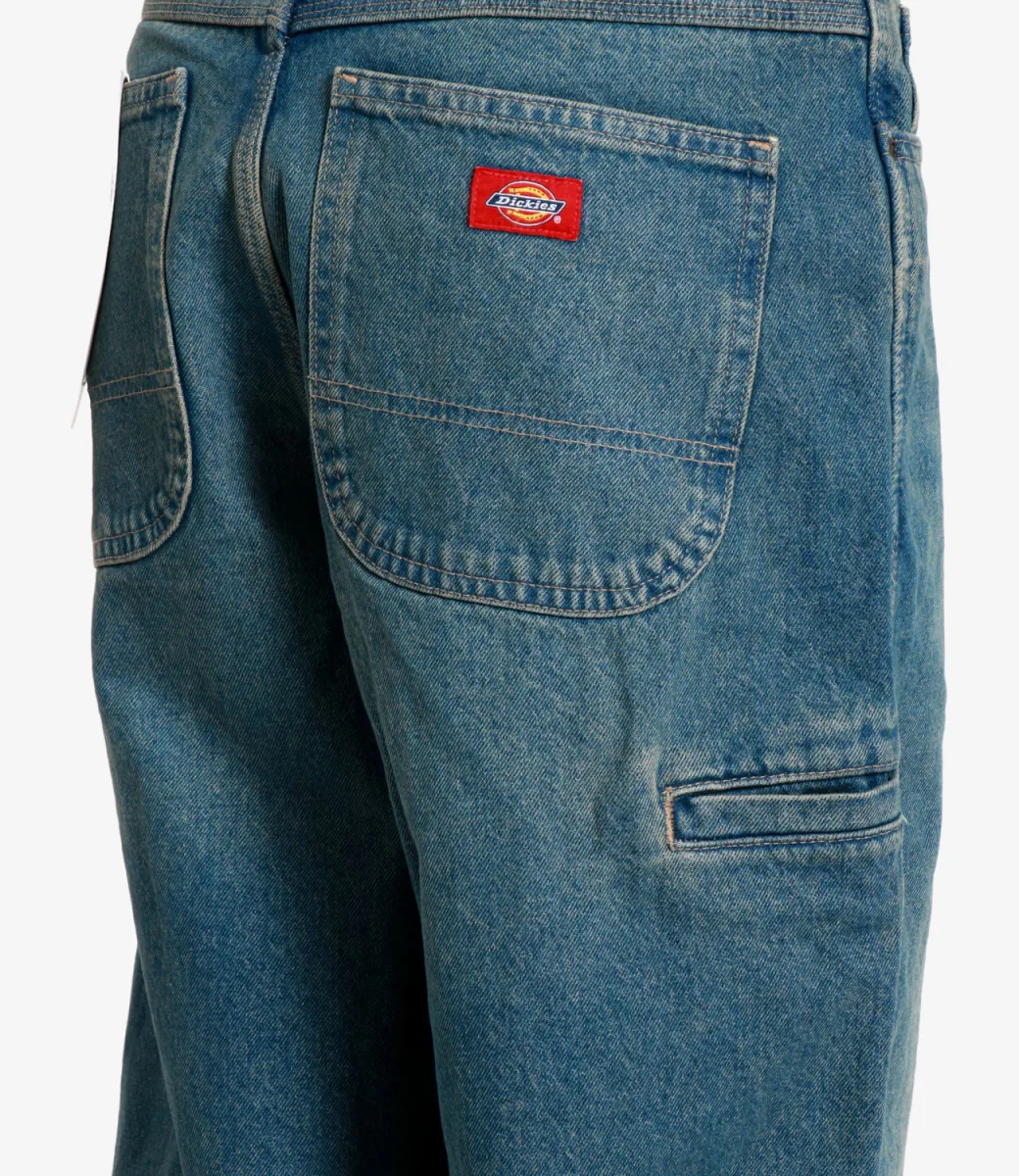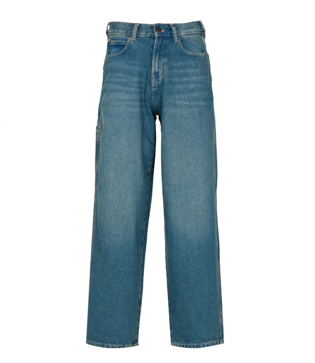 Jeans Dickies in denim. Vita con passanti, chiusura con bottone in metallo e zip, design con cinque tasche e tasca a filetto applicata al laterale della coscia sinistra. Silhouette anni ’90, ampia con affusolatura verso l’orlo.