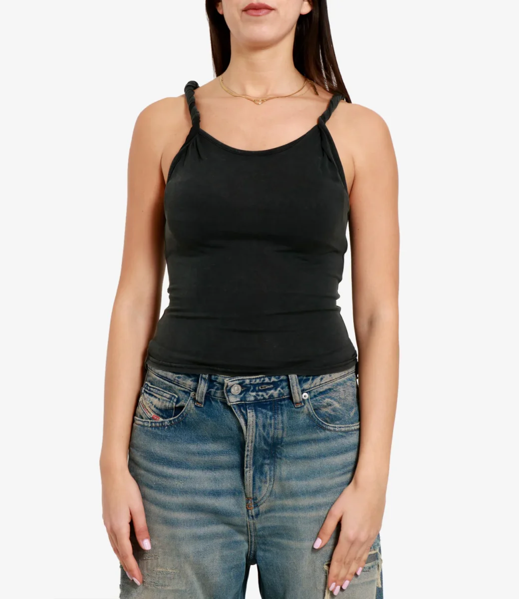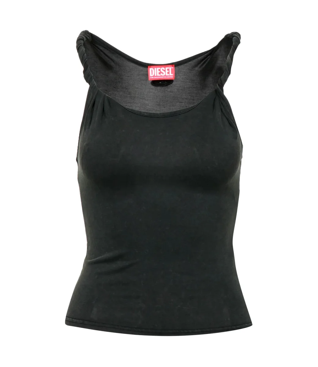 Canotta Diesel T-Twy-S1 Oro in morbido jersey Tencel™ e modal con lavaggio acid-wash dall’effetto sfumato. Linea slim valorizzata da spalline avvitate e voluminose, retro con ricamo Oval D.