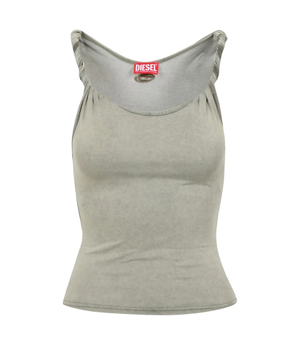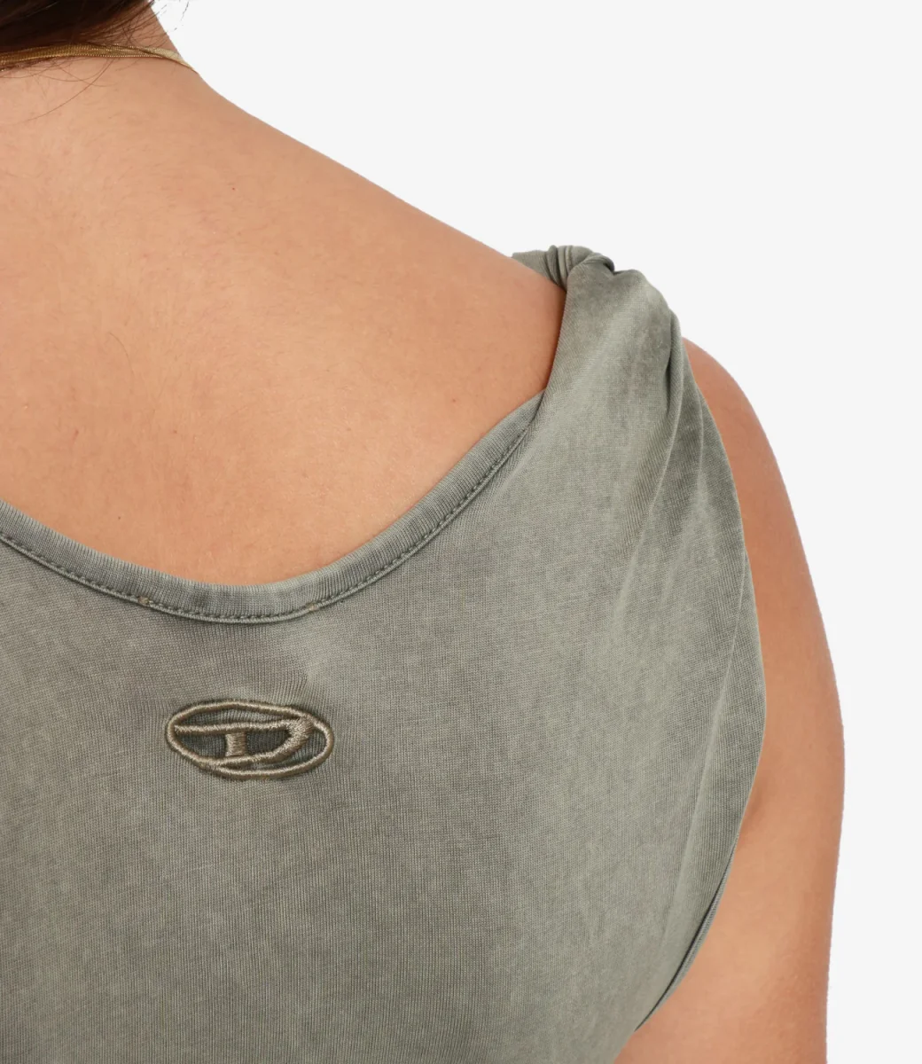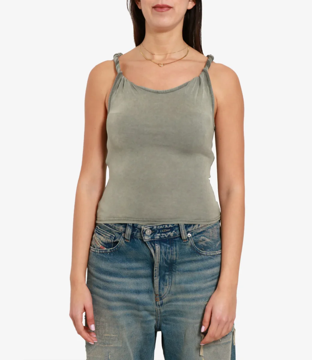 Canotta Diesel T-Twy-S1 Oro in morbido jersey Tencel™ e modal con lavaggio acid-wash dall’effetto sfumato. Linea slim valorizzata da spalline avvitate e voluminose, retro con ricamo Oval D.