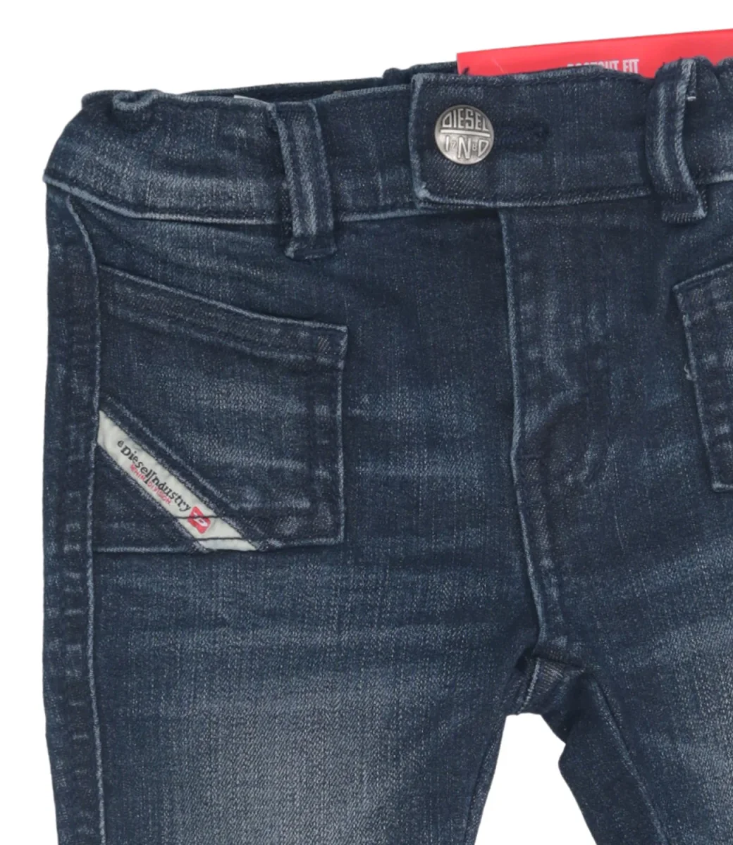 Jeans Diesel Kids D-heki-b in denim sottoposto a un lavaggio per un effetto vintage, modello classico cinque tasche, vita regolare con elastico interno e passanti, chiusura con bottoni e zip con patta, topponcino logato sul retro della vita.