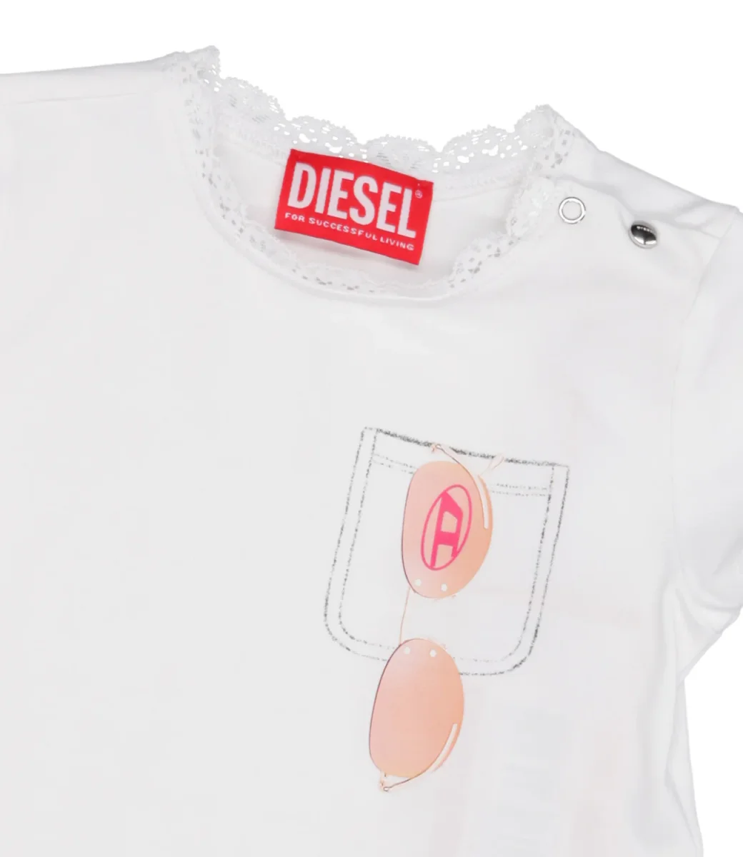T-Shirt Diesel Kids in cotone biologico elasticizzato. Girocollo bordato con merletto, maniche corte con merletto al bordo, stampa sul petto lato sinisto di una taschina con occhiali da sole logati con iconico Oval D.