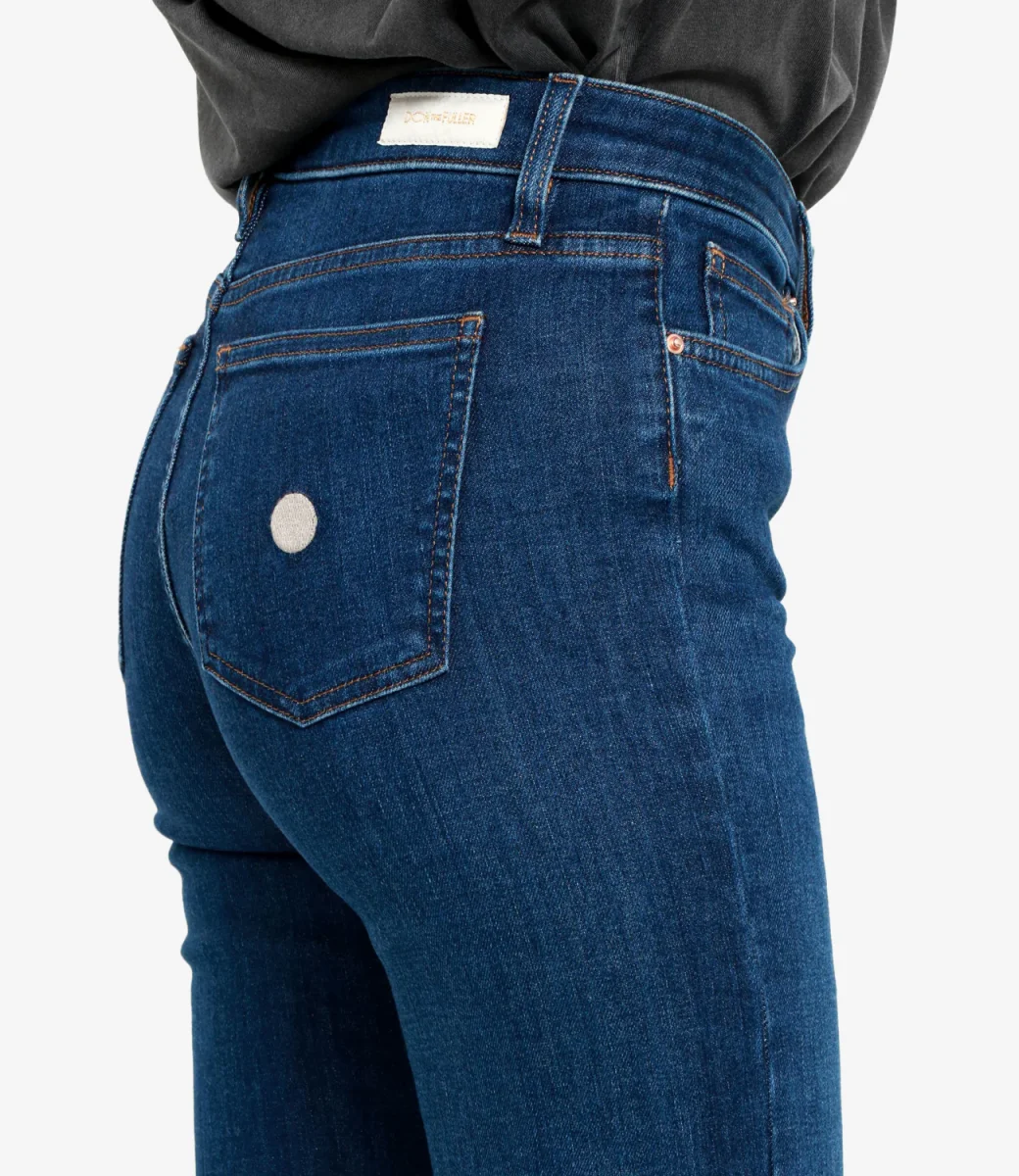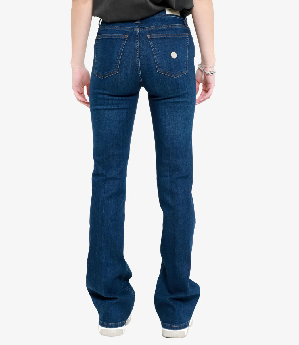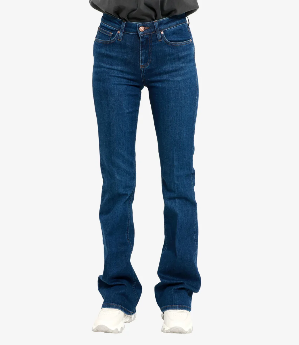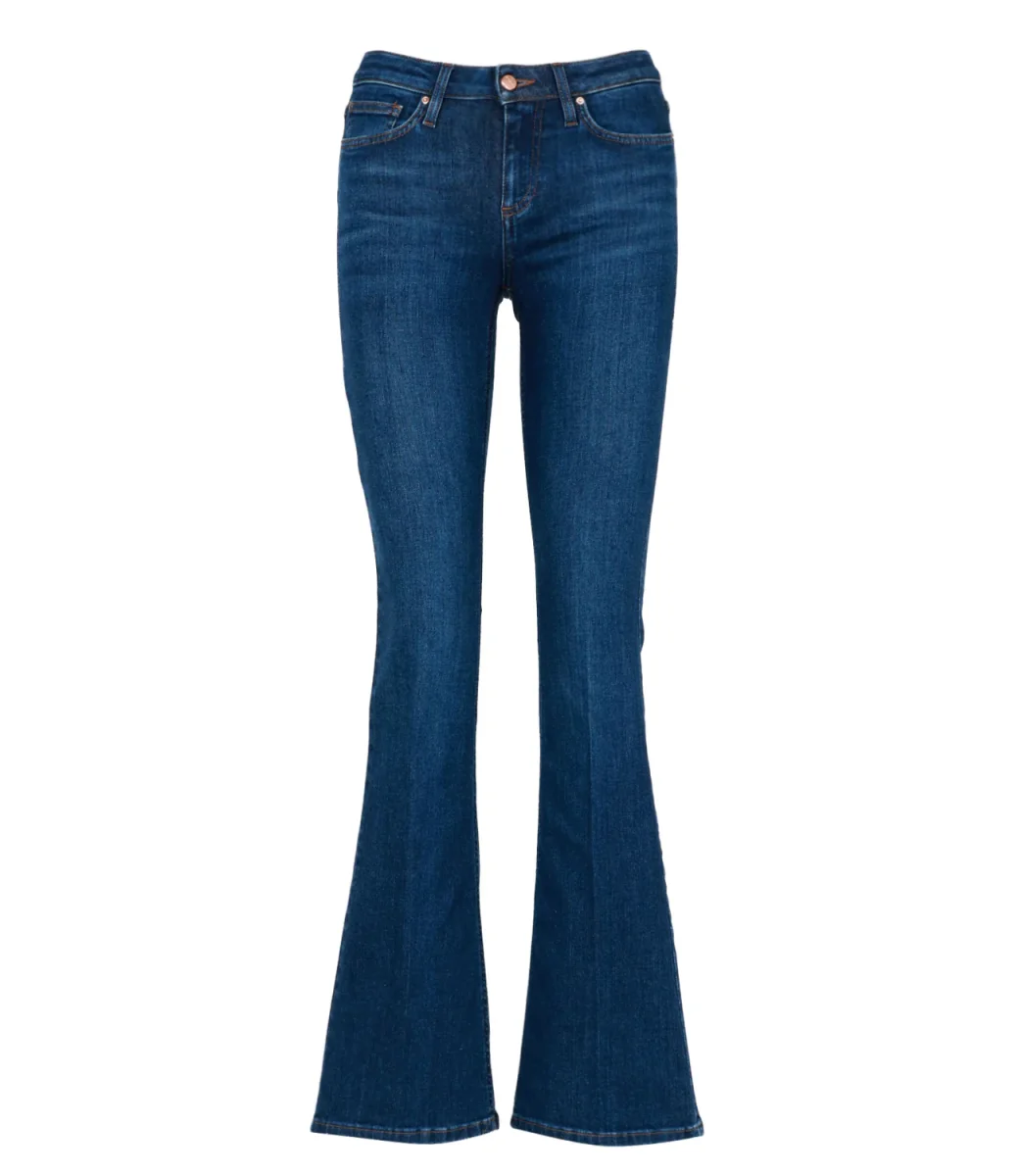 Jeans Don the Fuller Breda in denim, modello cinque tasche con gamba leggermente più ampia nell’area inferiore, vita con passanti, chiusura con zip e bottone in tonalità oro rosa, logo sul retro, Made in Italy