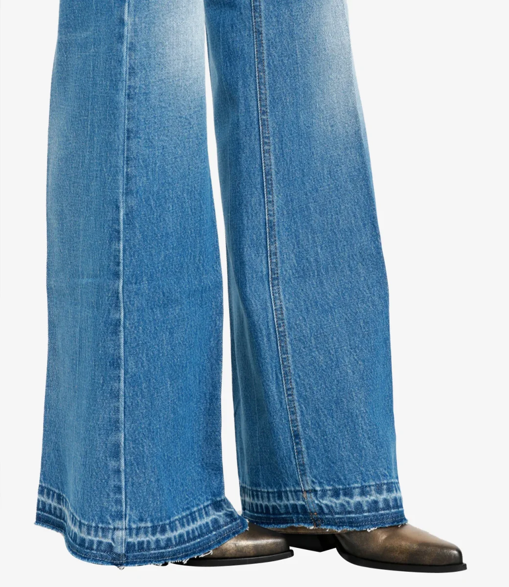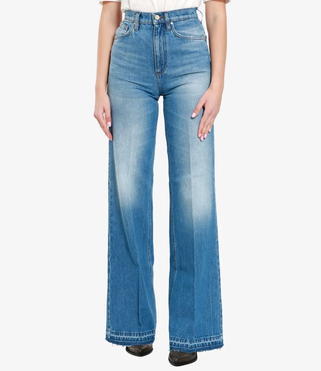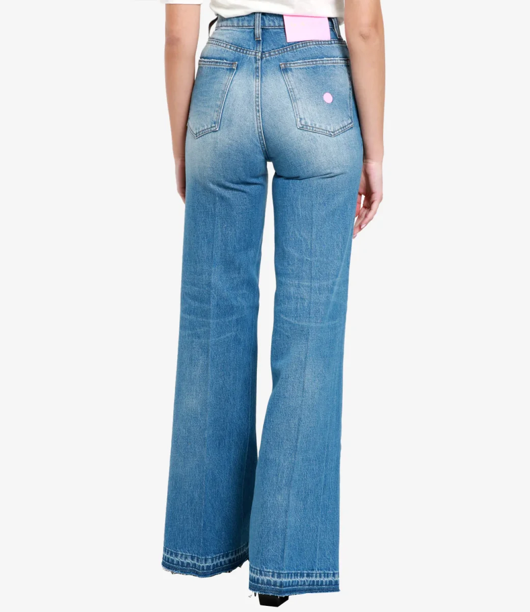 Jeans Don the Fuller vita alta modello flare con bottone vintage laccato verde e salpa in jacron verde.