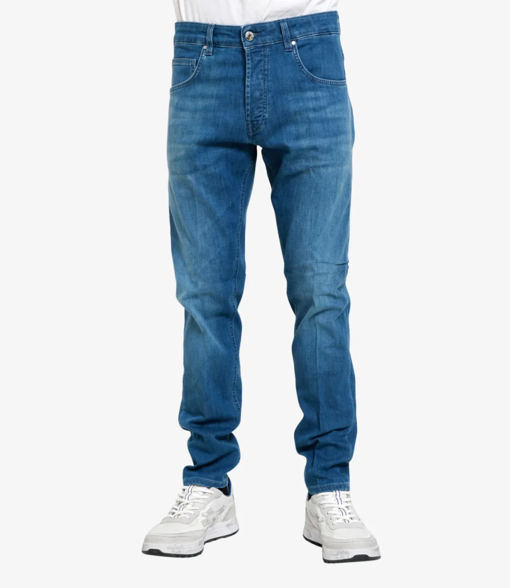Jeans Don The Fuller Yaren in denim, modello cinque tasche con gamba larga e morbida sulla coscia che restringe sul fondo, vita media con passani, chiusura con bottoni, logo sul retro. Made in Italy