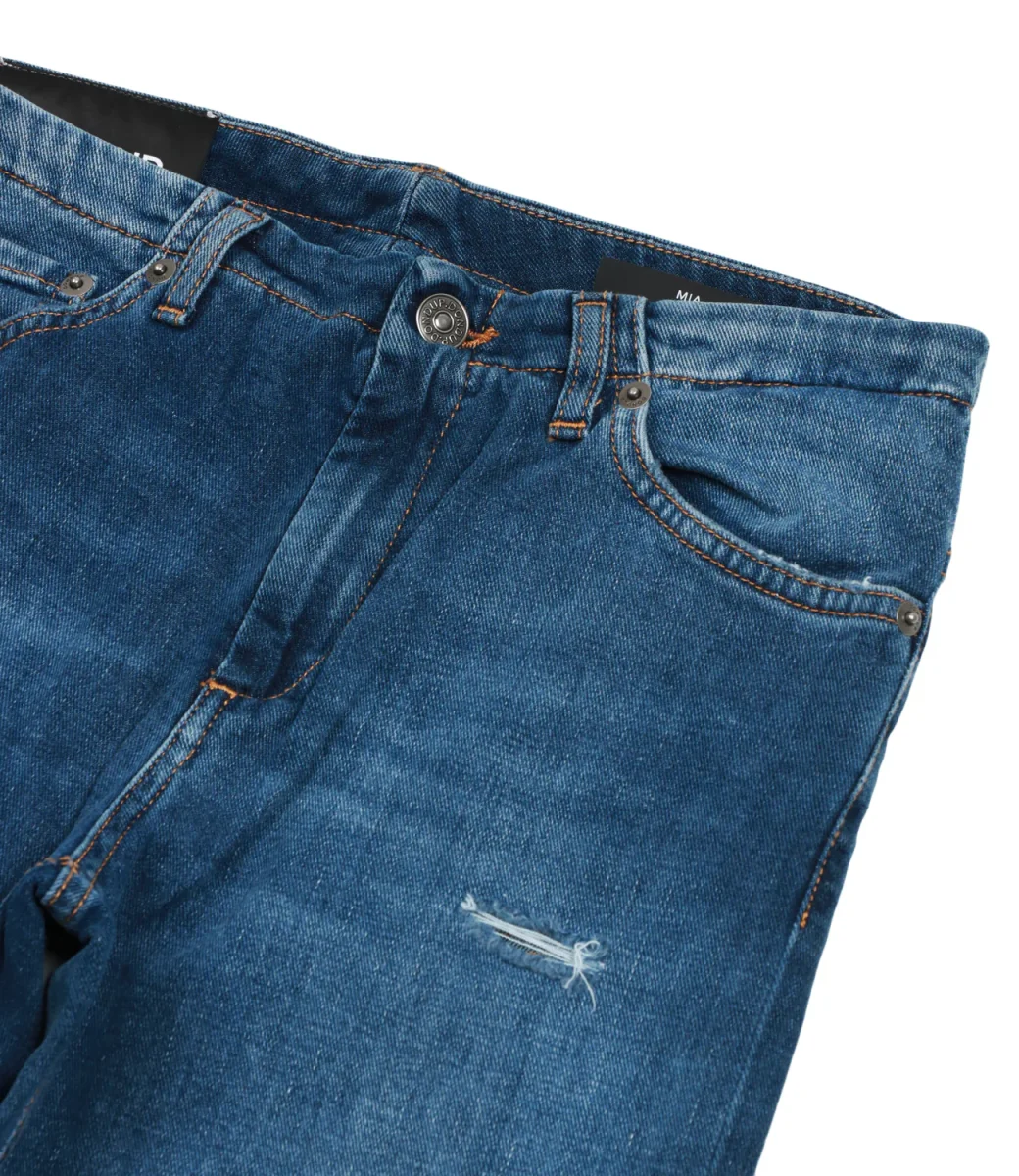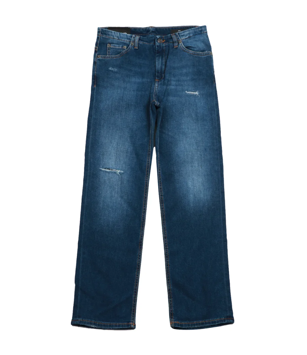 Jeans Dondup Junior in denim modello 5 tasche con chiusura frontale con zip e bottone e patch con logo cucita posteriormente.