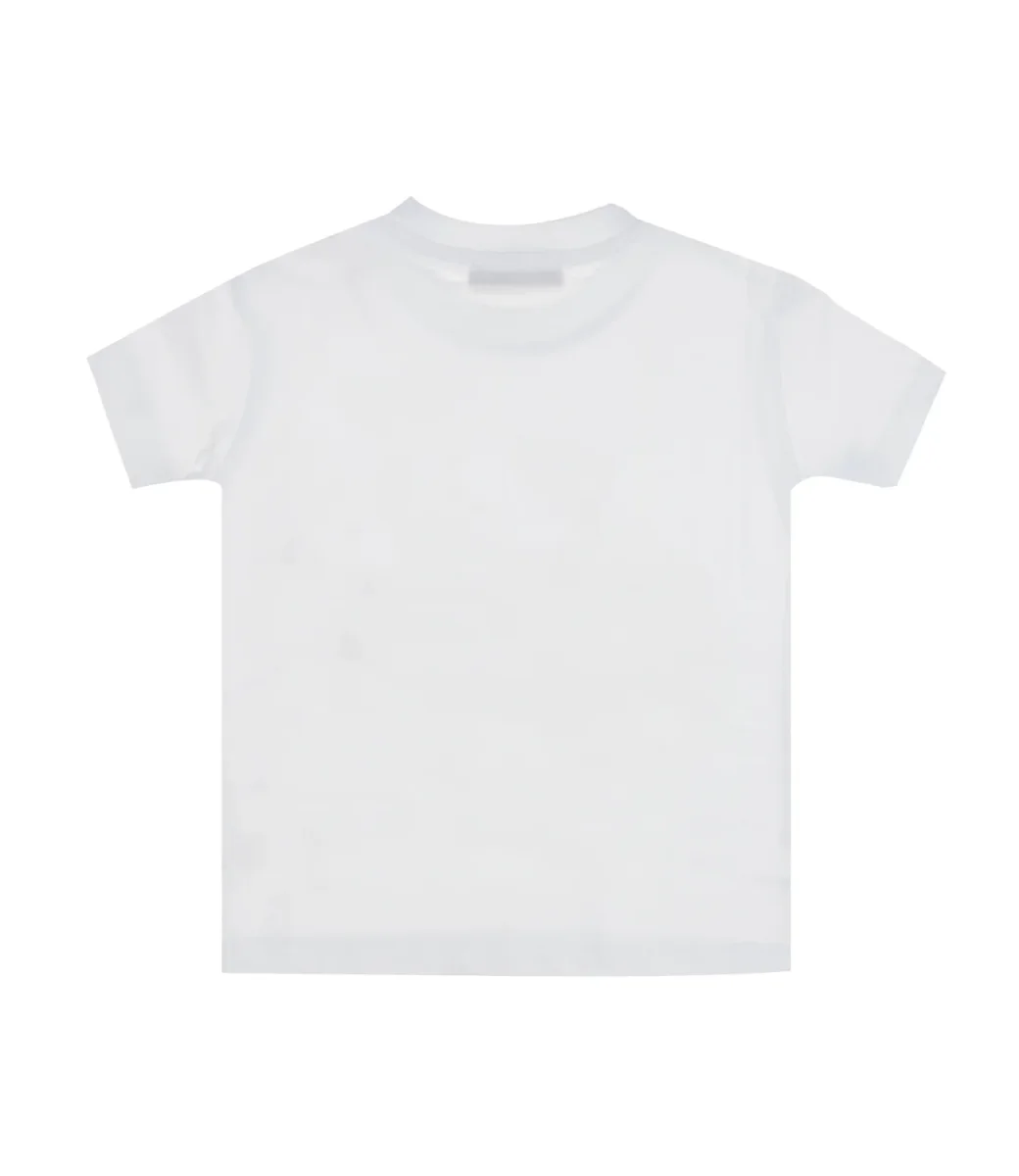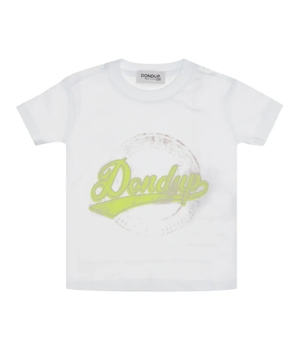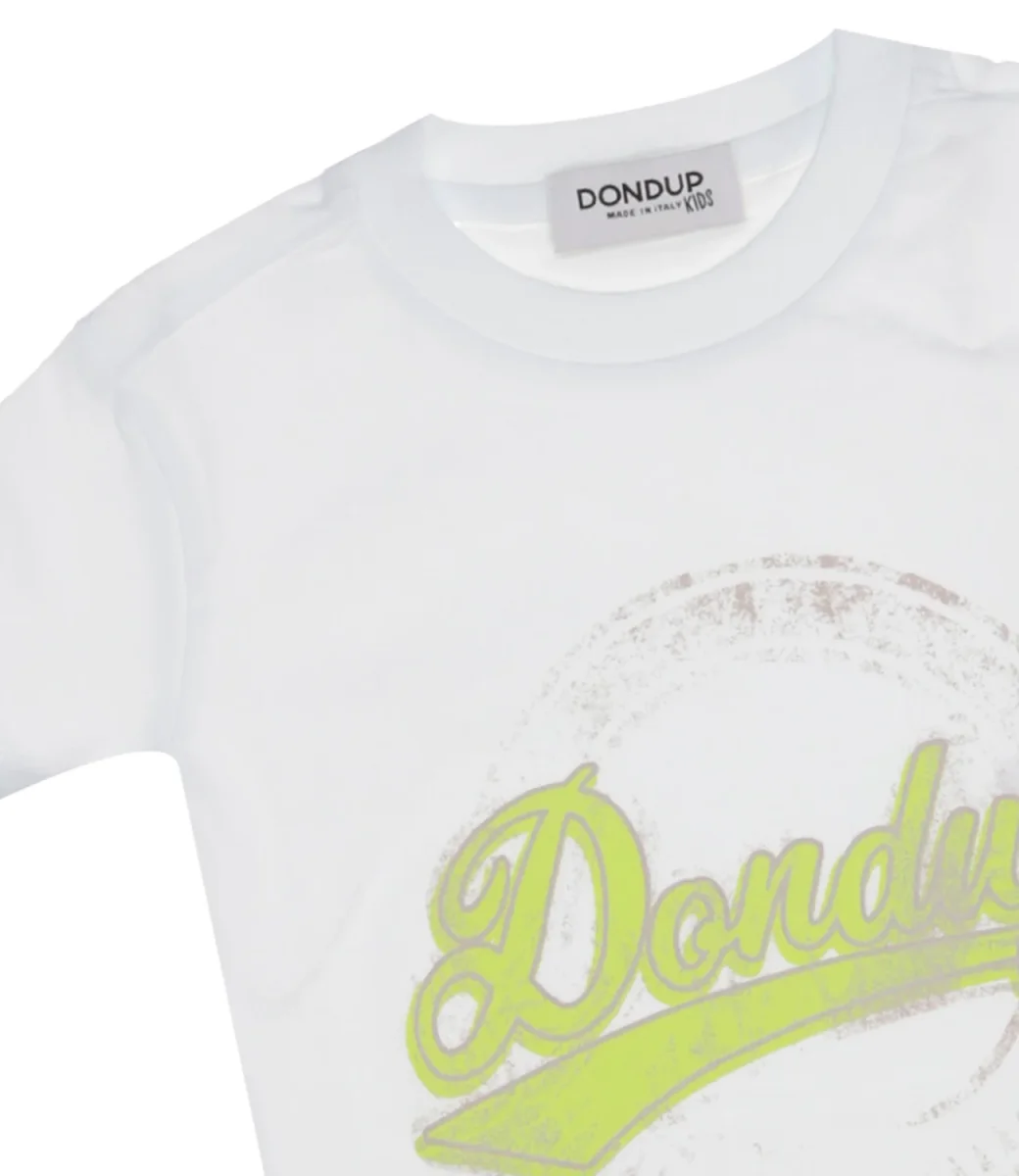 T-Shirt Dondup Junior in cotone bianco e giallo fluo, girocollo a costine, maniche corte, decorata con stampa logo vintage sul davanti, orlo dritto.